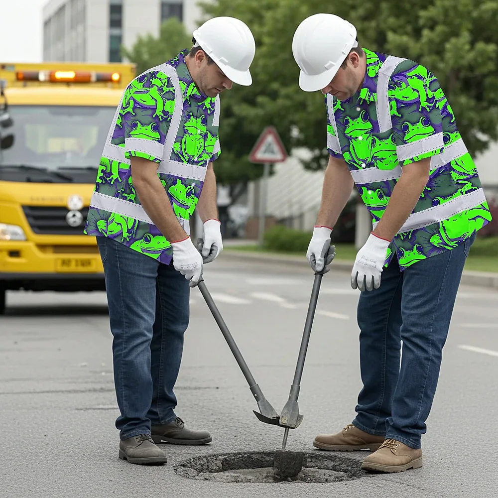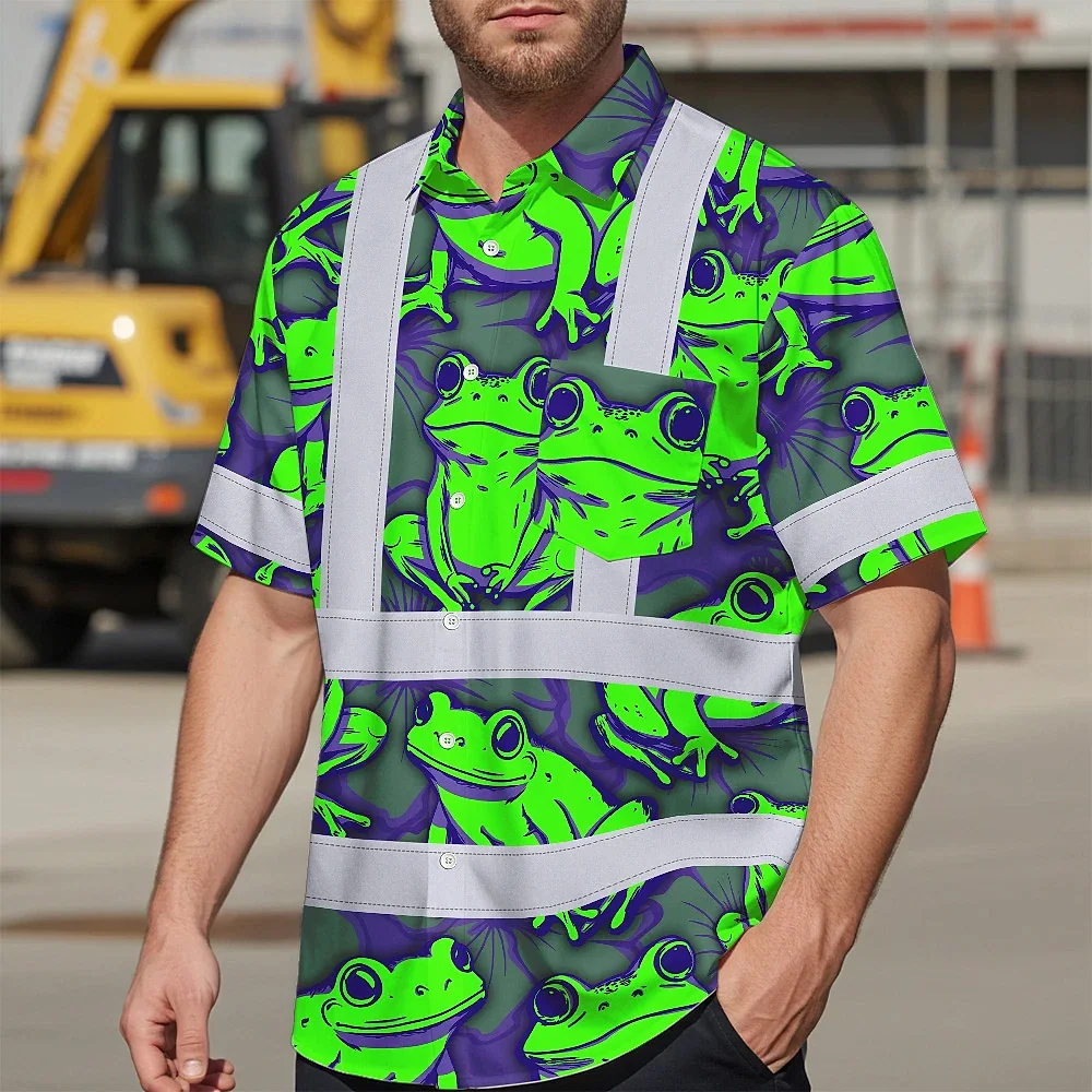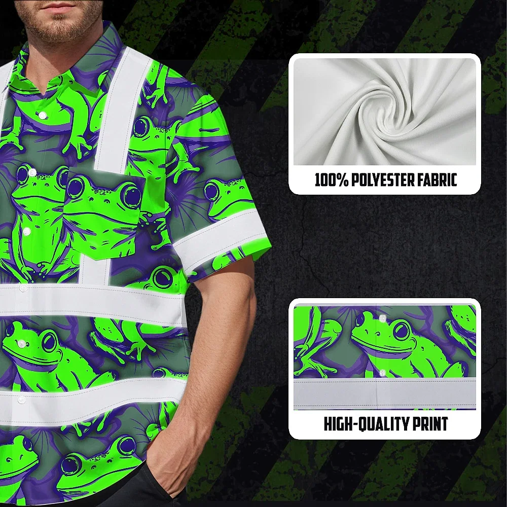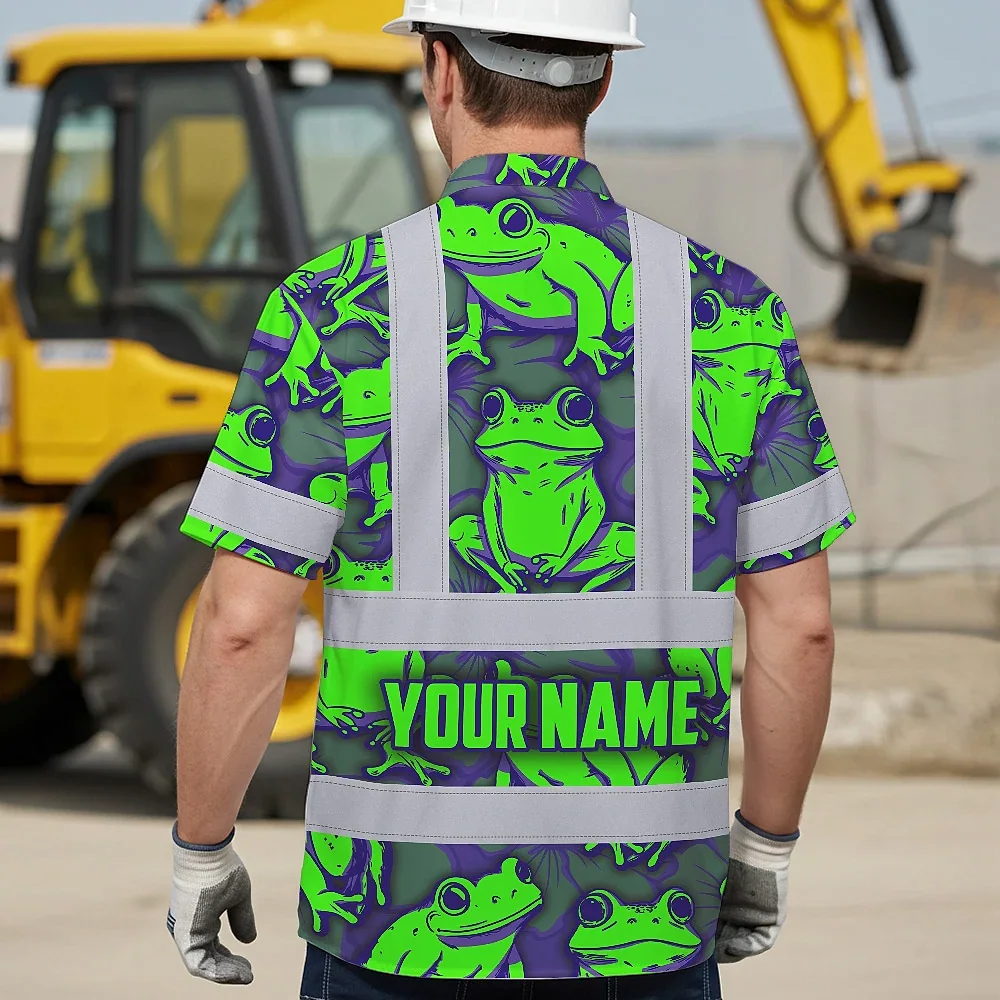 Hi Vis Hawaiian Shirt Reflective Tapes Green Neon Violet Frog Custom Name Safety Workwear For Workers, Truckers, Operators