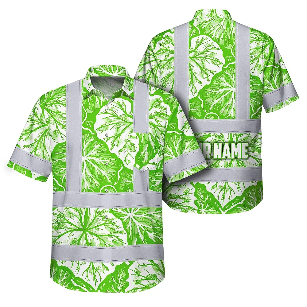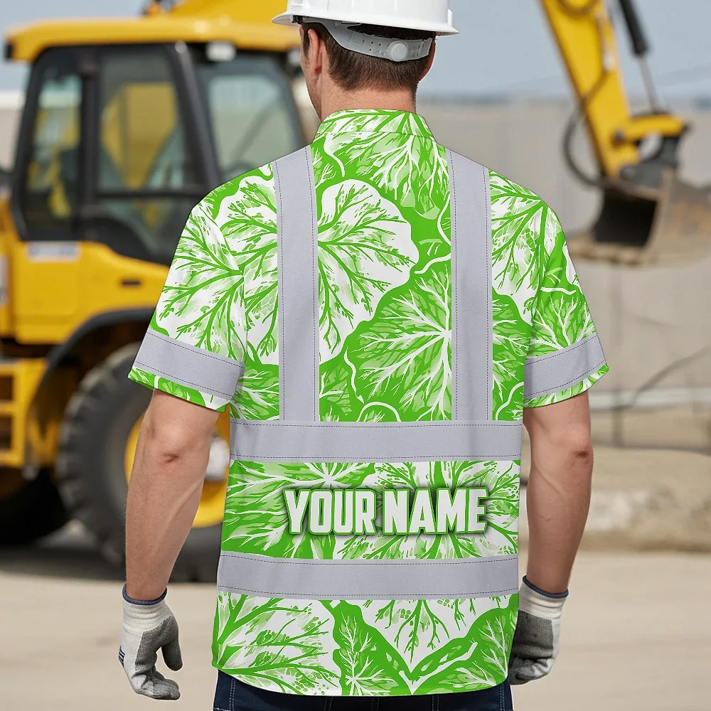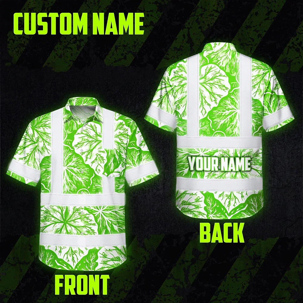 Hi Vis Hawaiian Shirt Reflective Tapes Green Neon White Flowers Custom Name Safety Workwear For Workers, Truckers, Operators