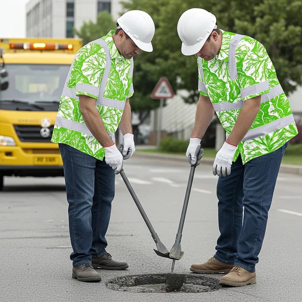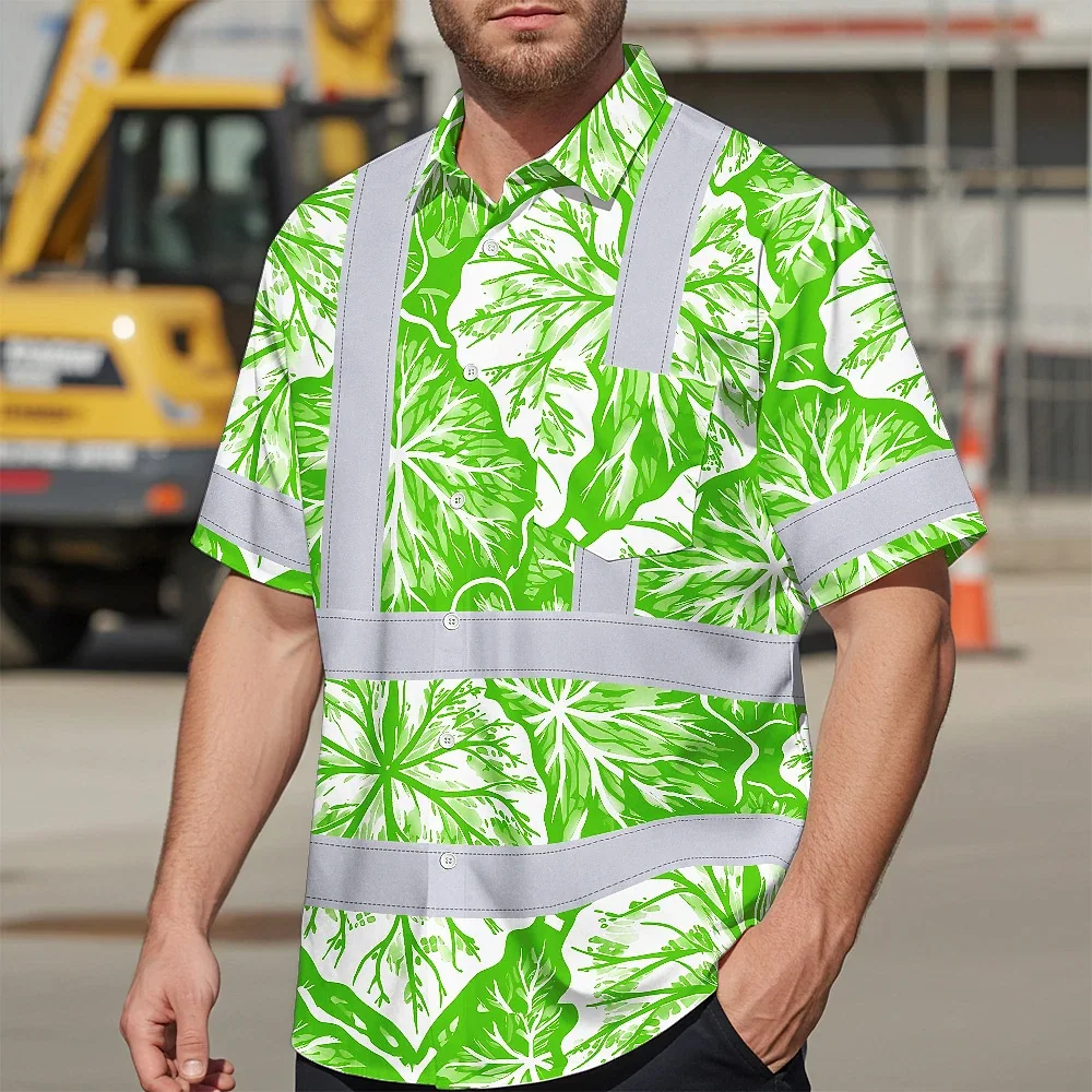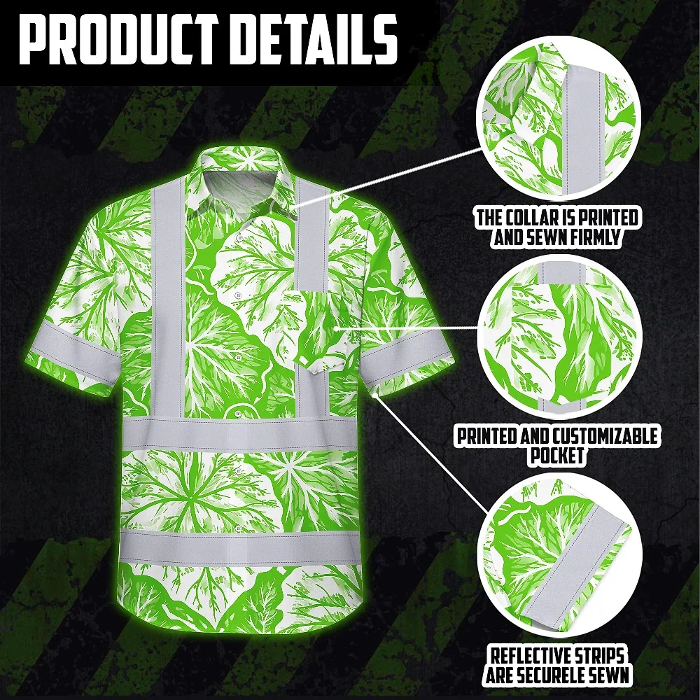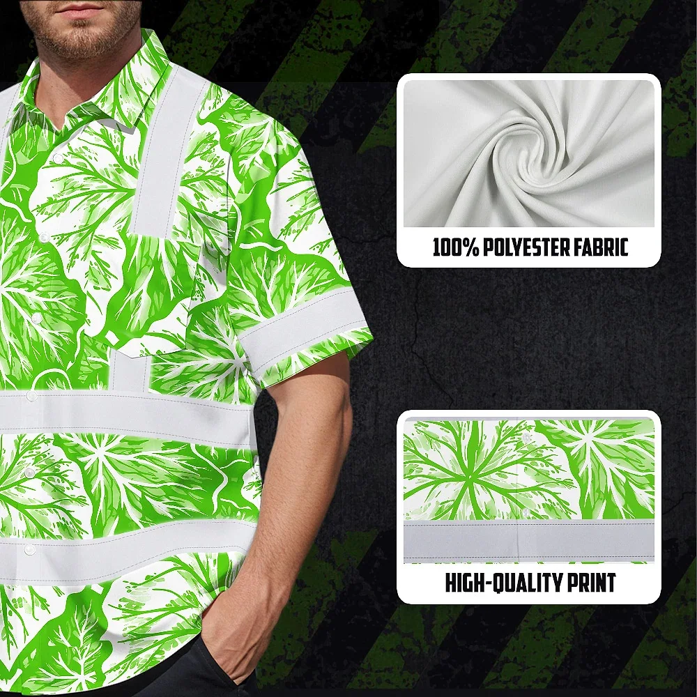 Hi Vis Hawaiian Shirt Reflective Tapes Green Neon White Flowers Custom Name Safety Workwear For Workers, Truckers, Operators