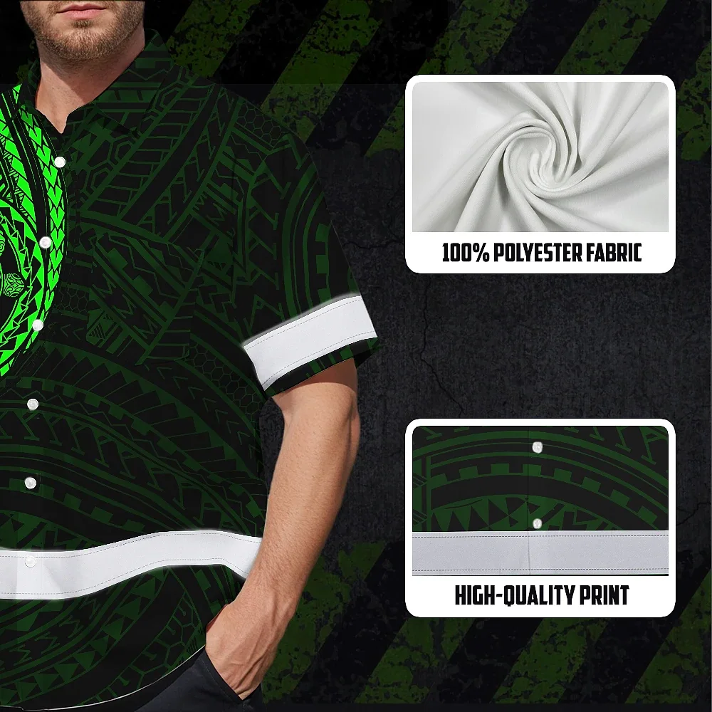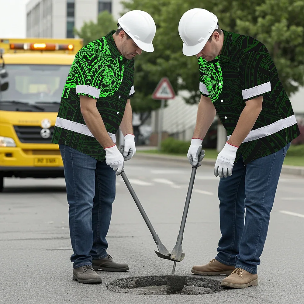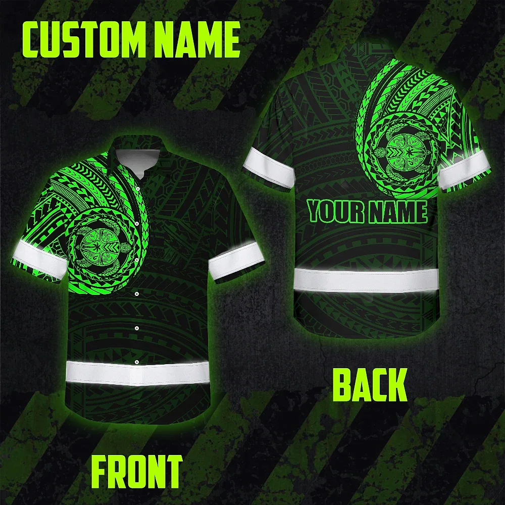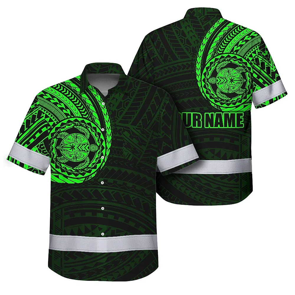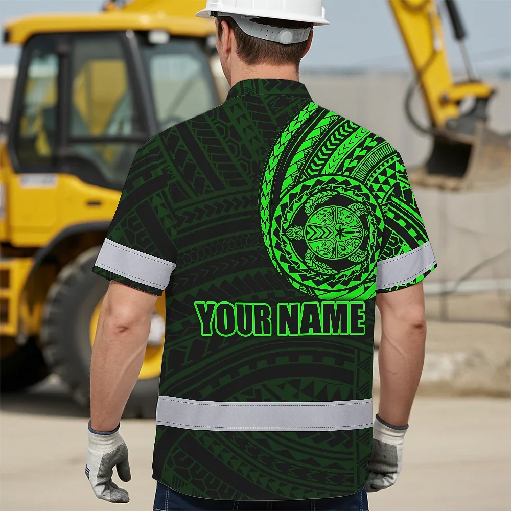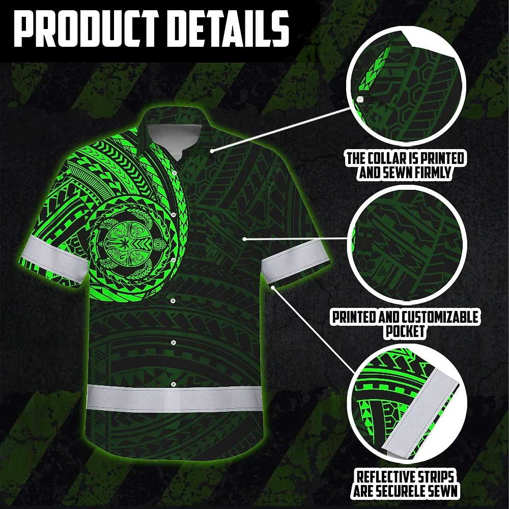 Hi Vis Hawaiian Shirt Reflective Tapes Green Turtle Polynesian Custom Name Safety Workwear For Workers, Truckers, Operators