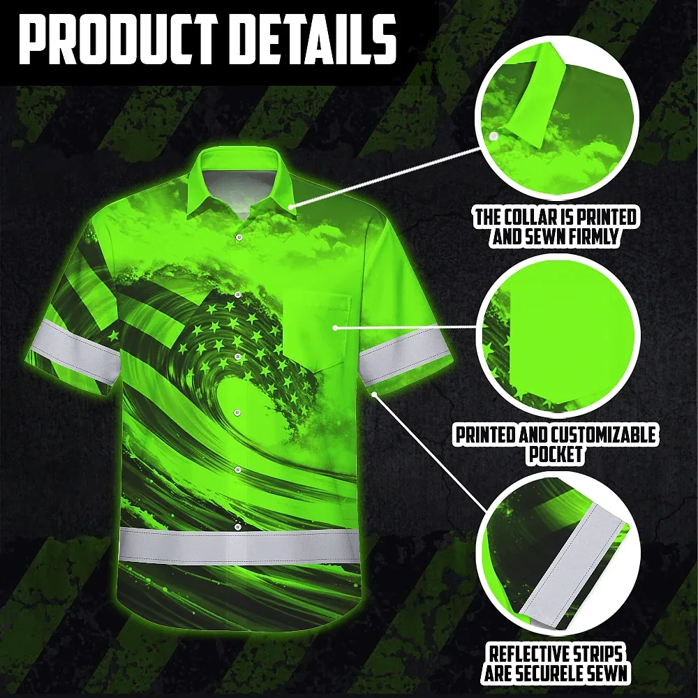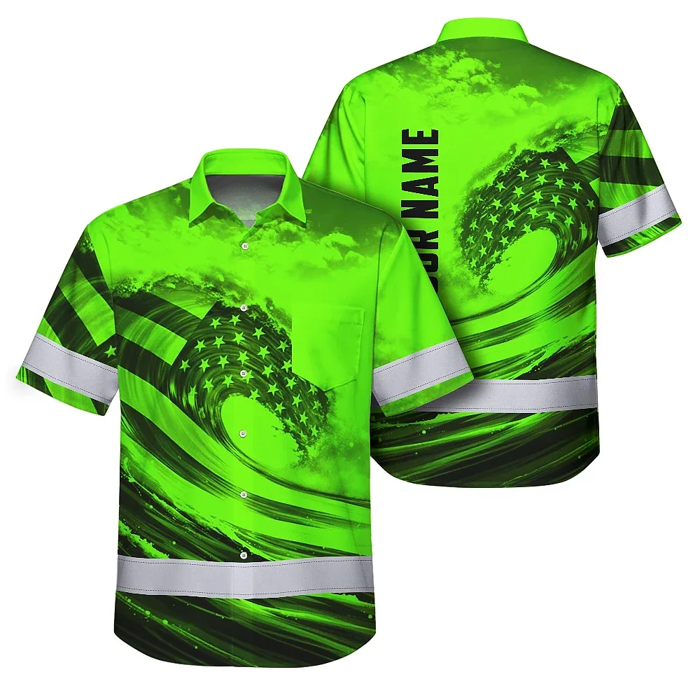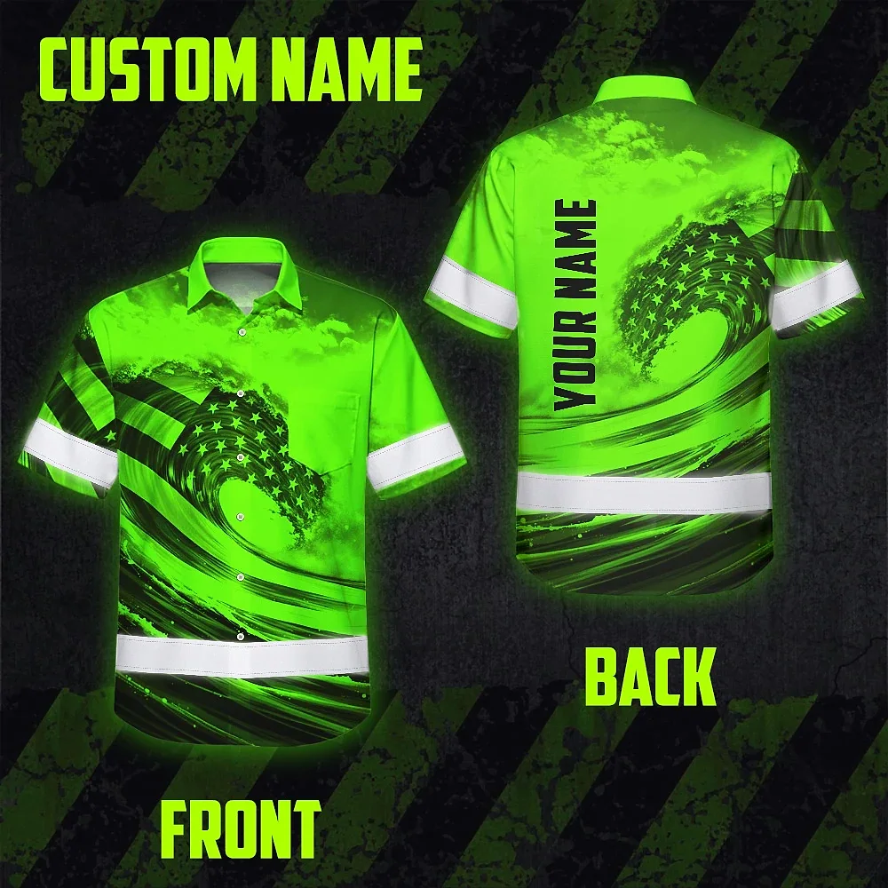 Hi Vis Hawaiian Shirt Reflective Tapes Green Waves Neon US Flag Custom Name Safety Workwear For Workers, Truckers, Operators