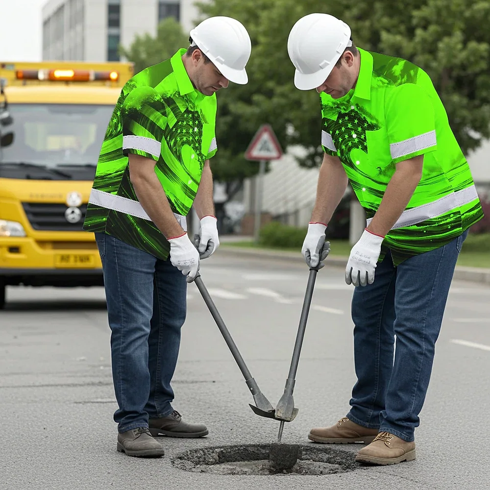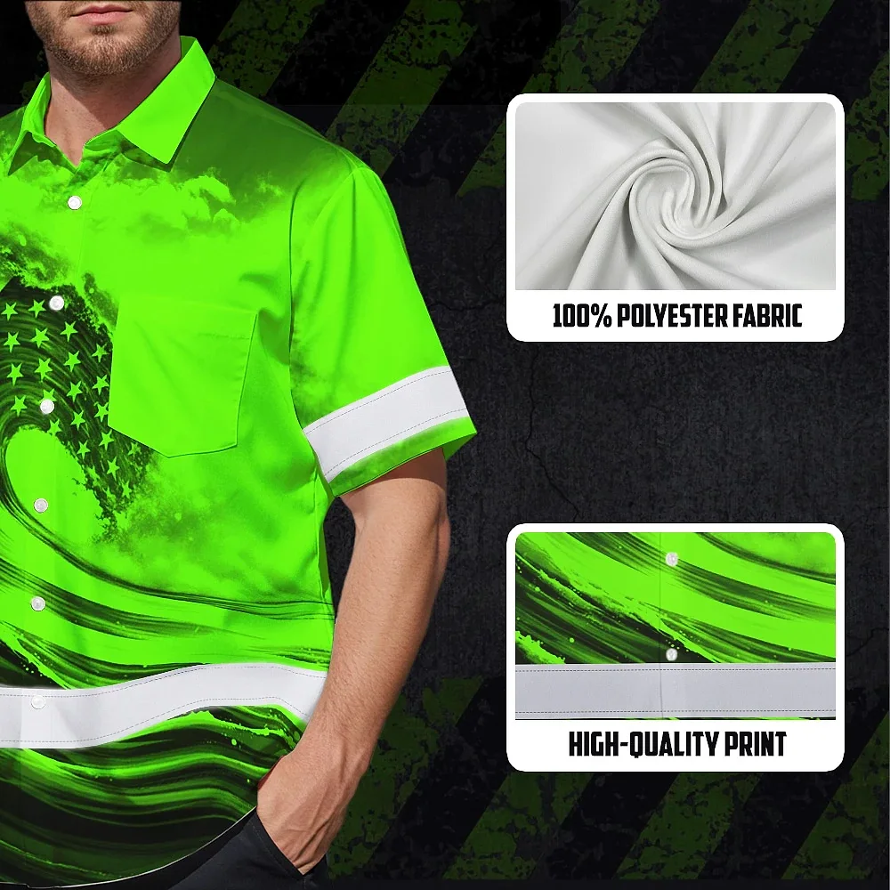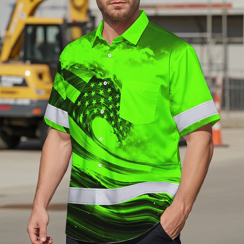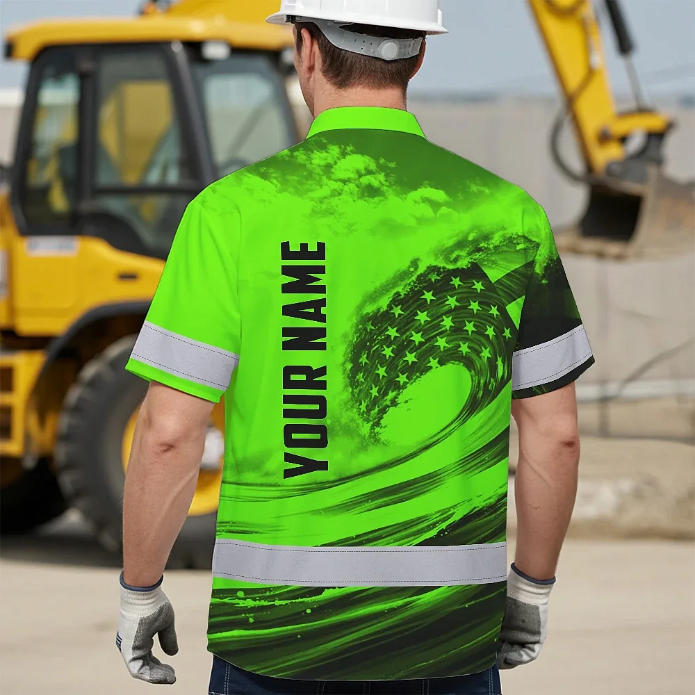 Hi Vis Hawaiian Shirt Reflective Tapes Green Waves Neon US Flag Custom Name Safety Workwear For Workers, Truckers, Operators