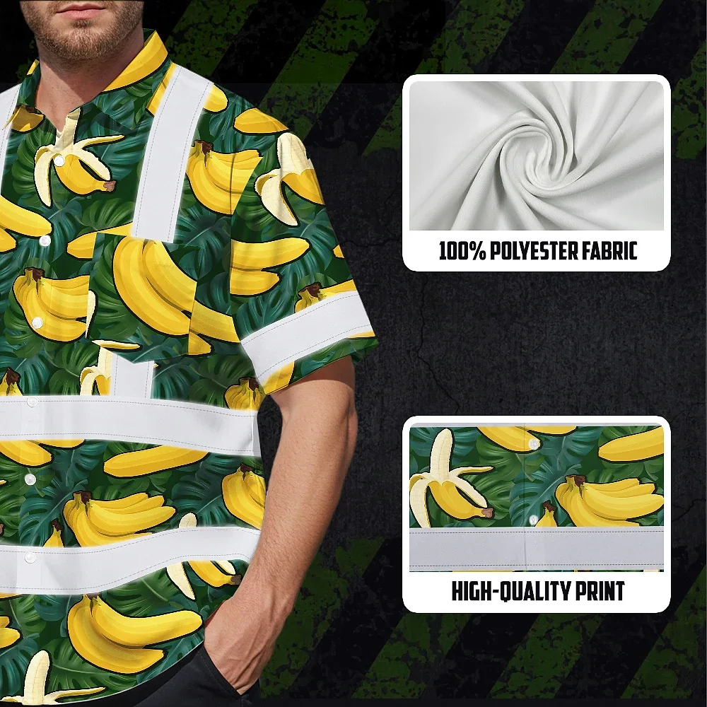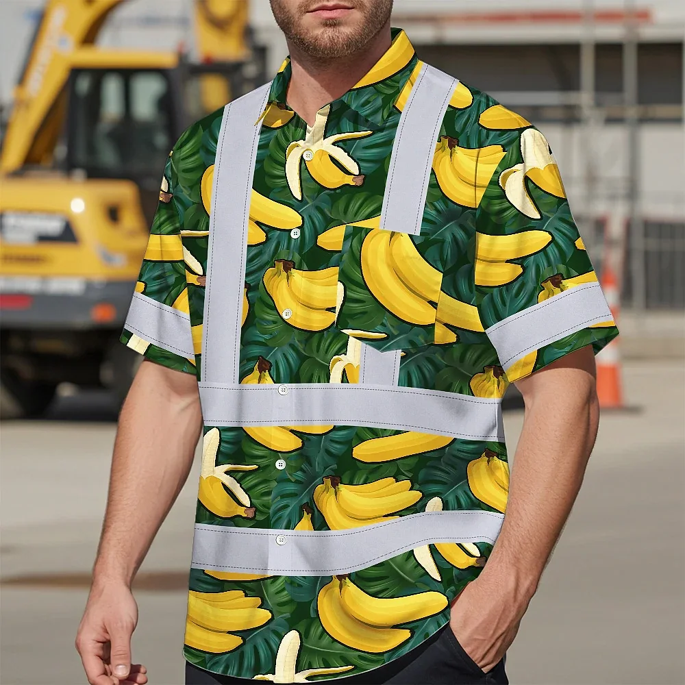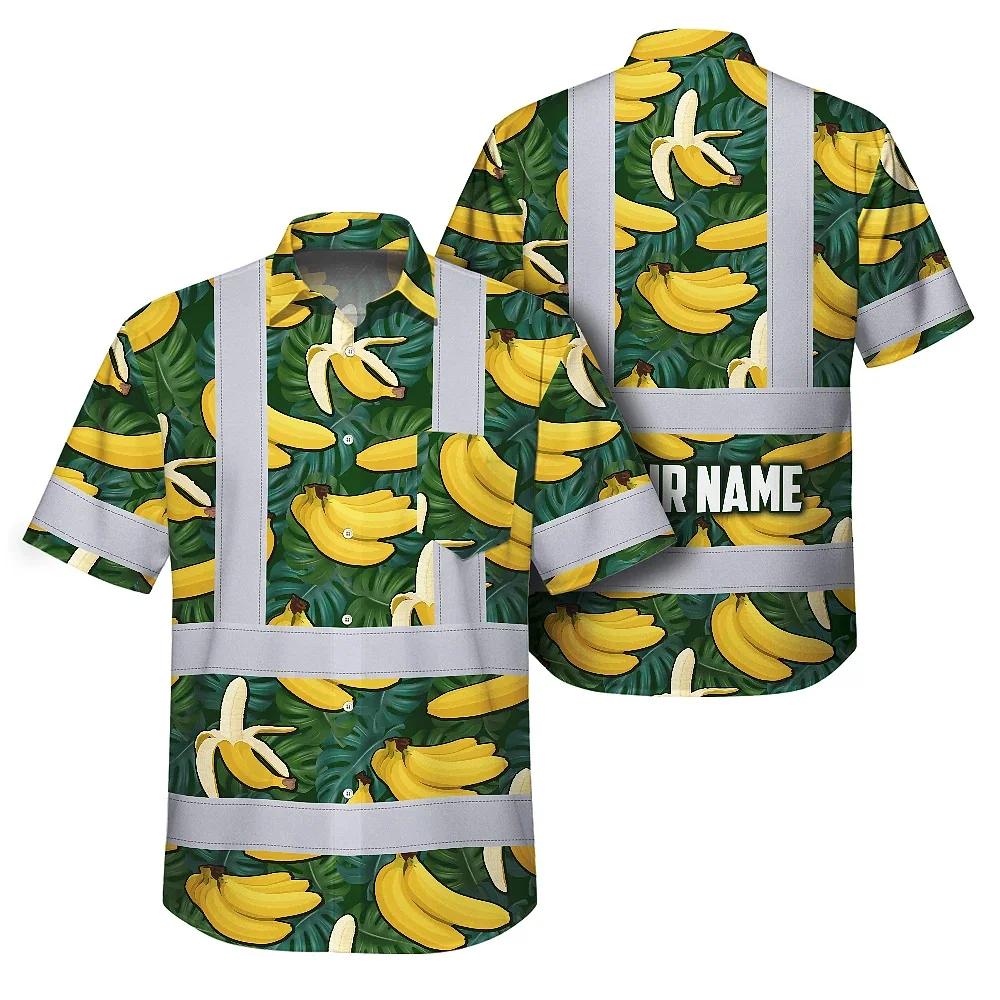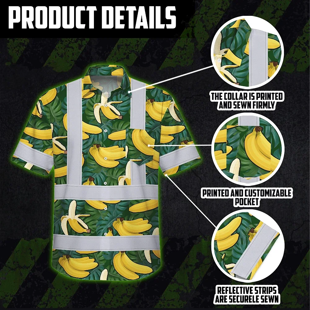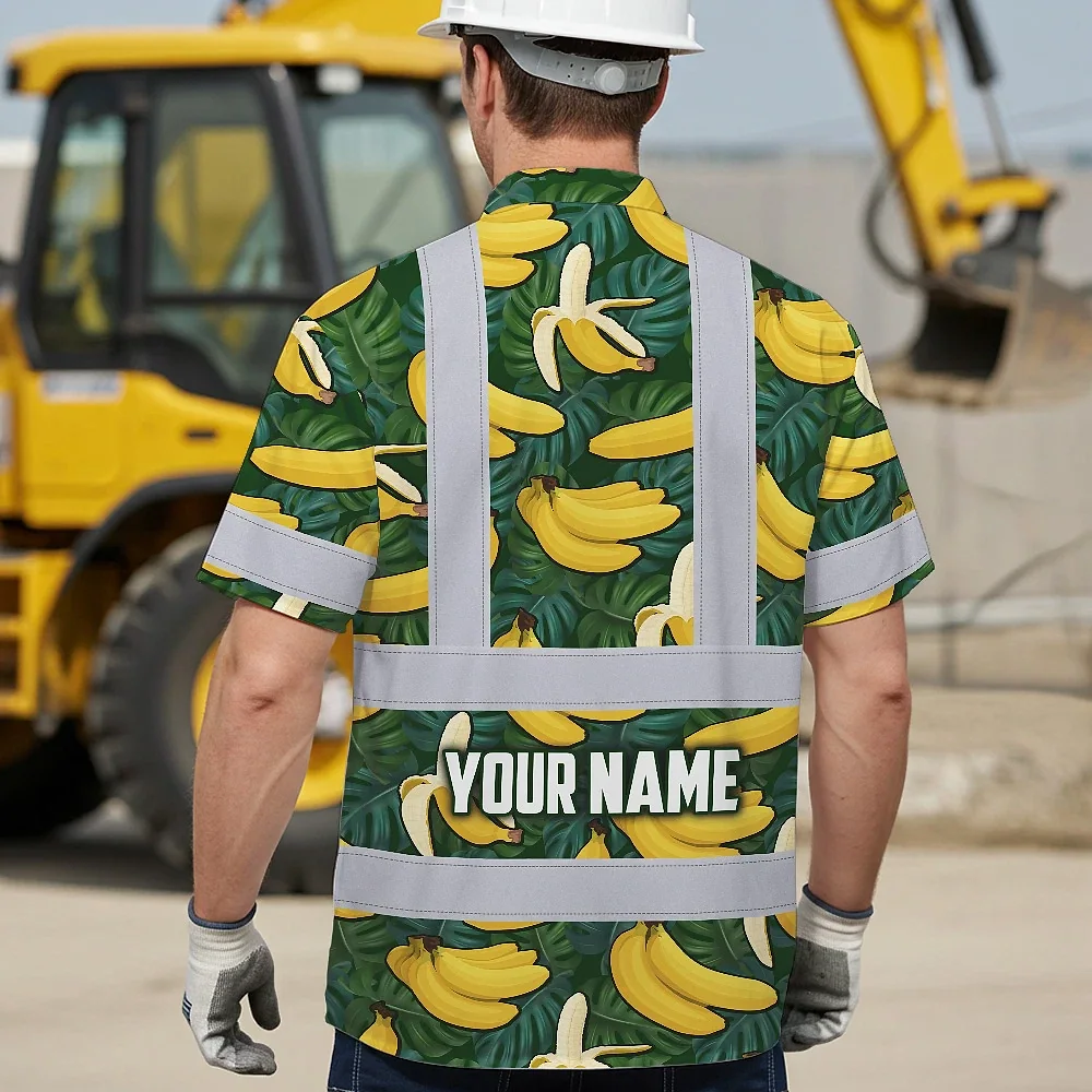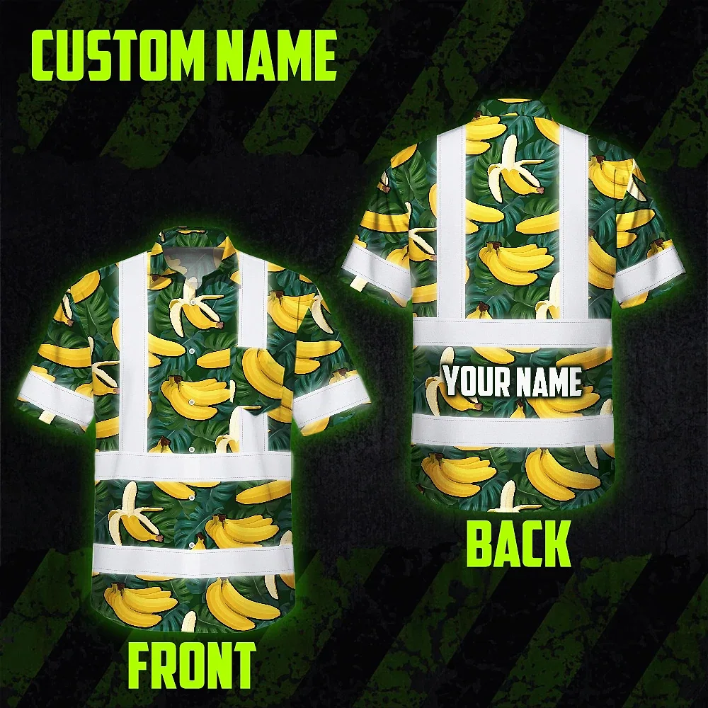 Hi Vis Hawaiian Shirt Reflective Tapes Green Yellow Banana Custom Name Safety Workwear For Workers, Truckers, Operators