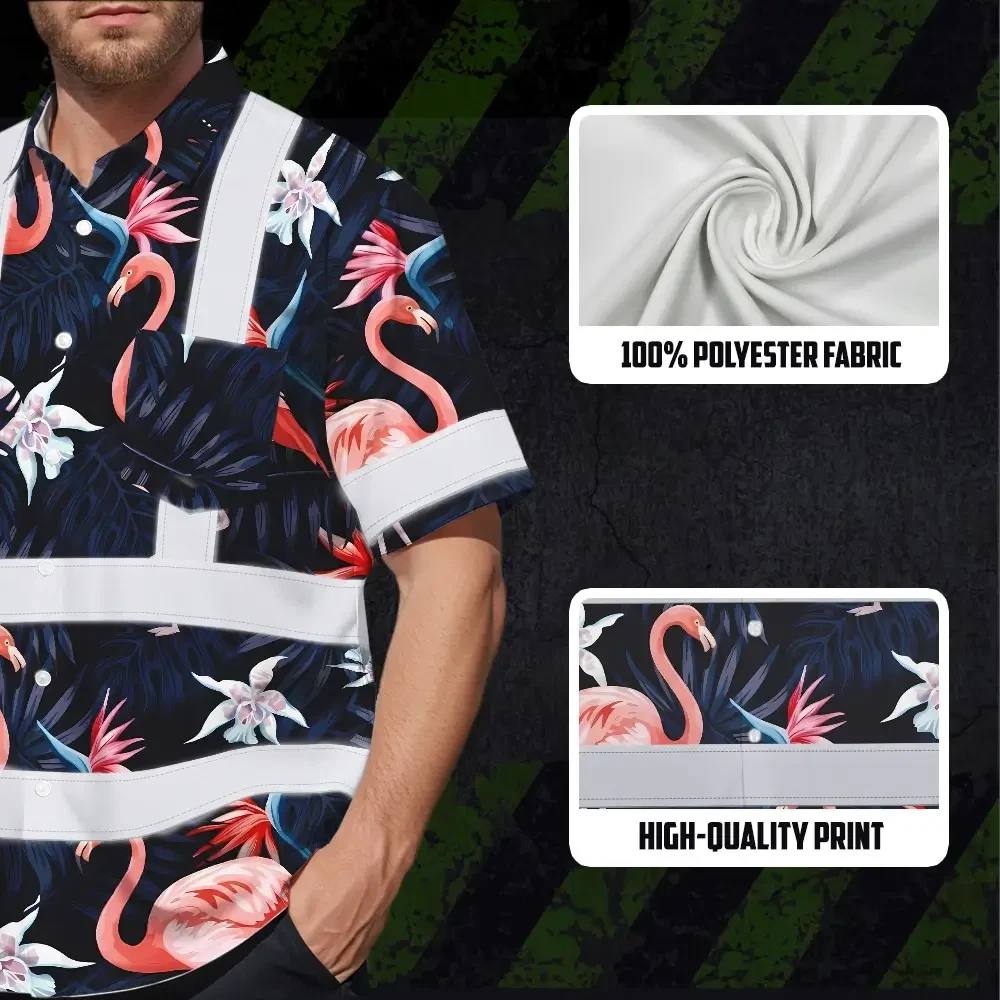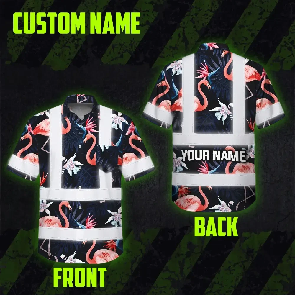 Hi Vis Hawaiian Shirt Reflective Tapes Hawaii Flamingo 2 Custom Name Safety Workwear For Workers, Truckers, Operators