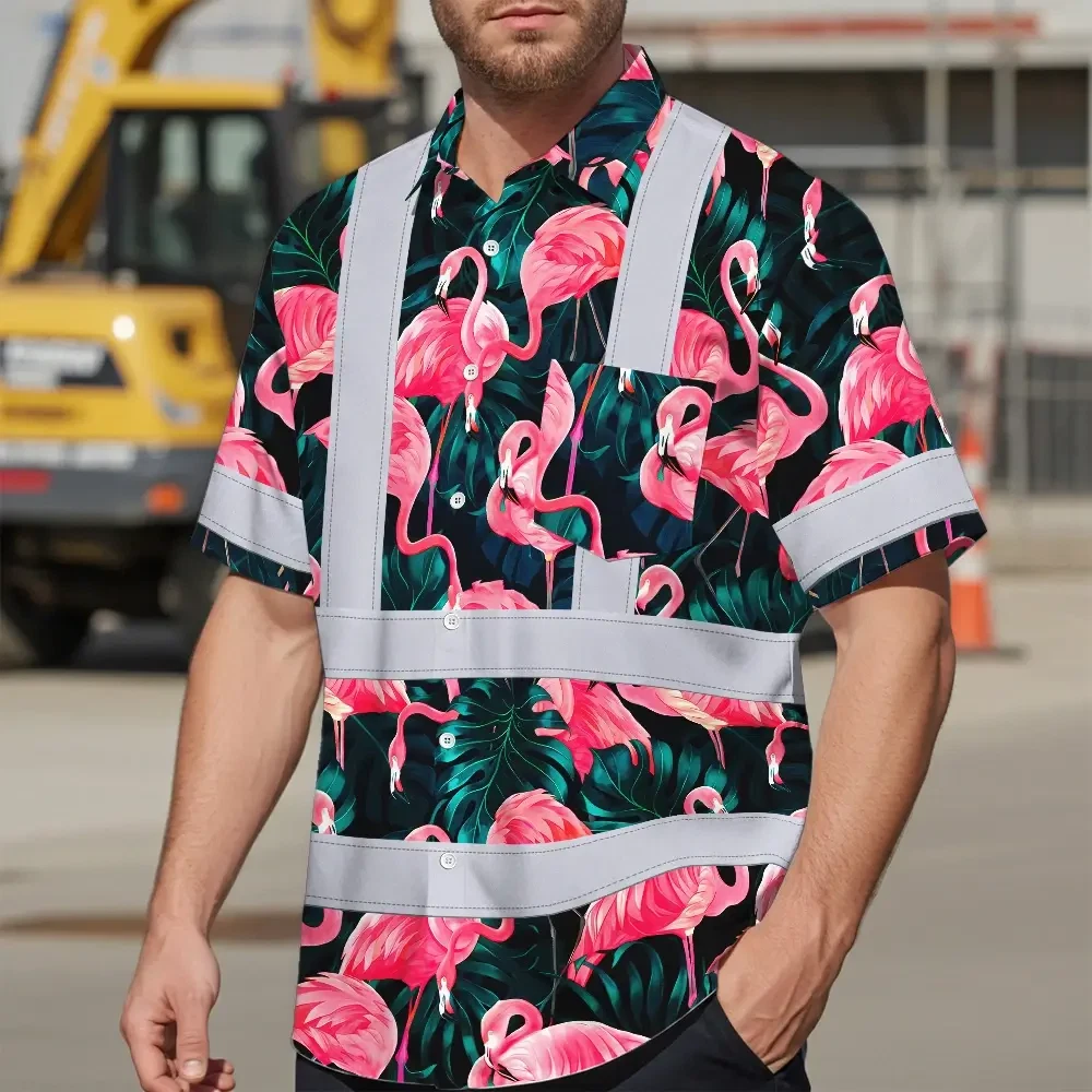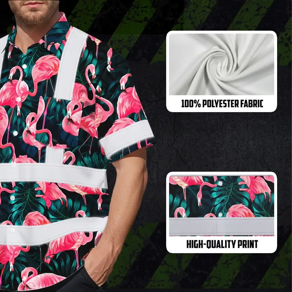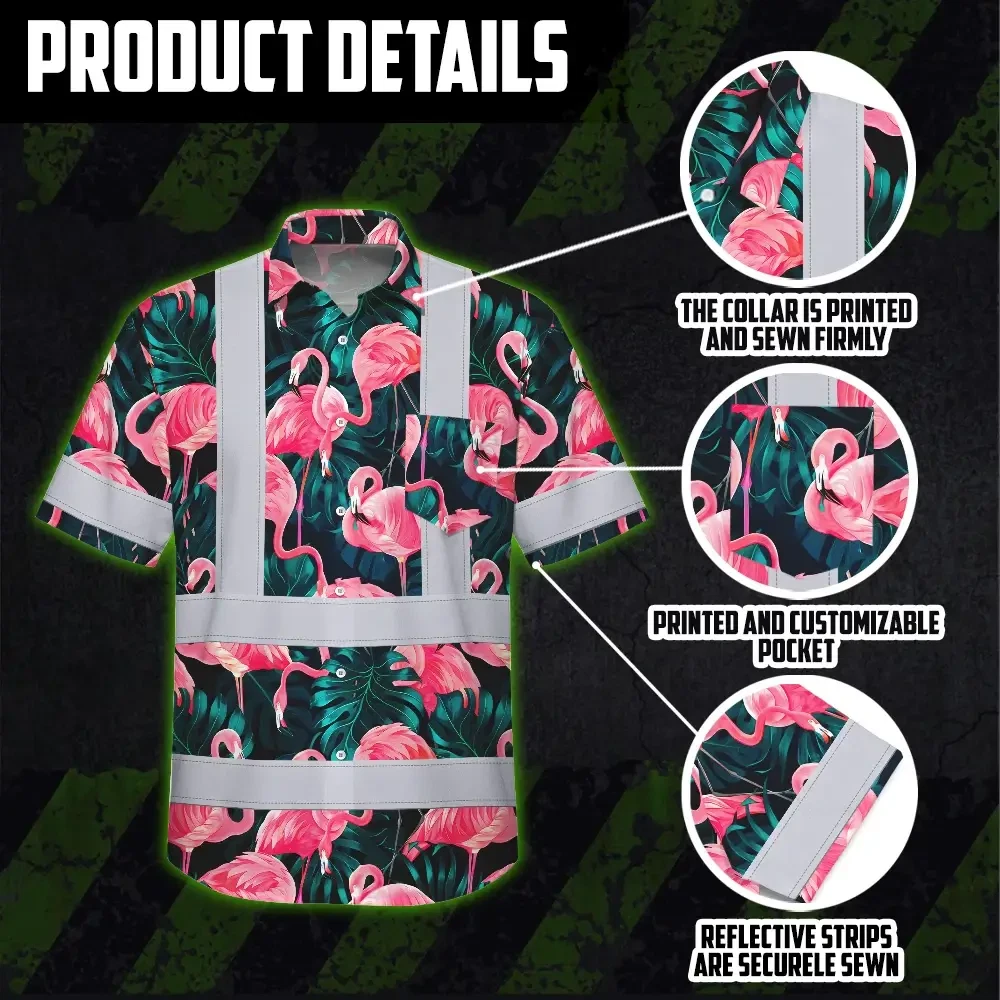 Hi Vis Hawaiian Shirt Reflective Tapes Hawaii Flamingo Custom Name Safety Workwear For Workers, Truckers, Operators