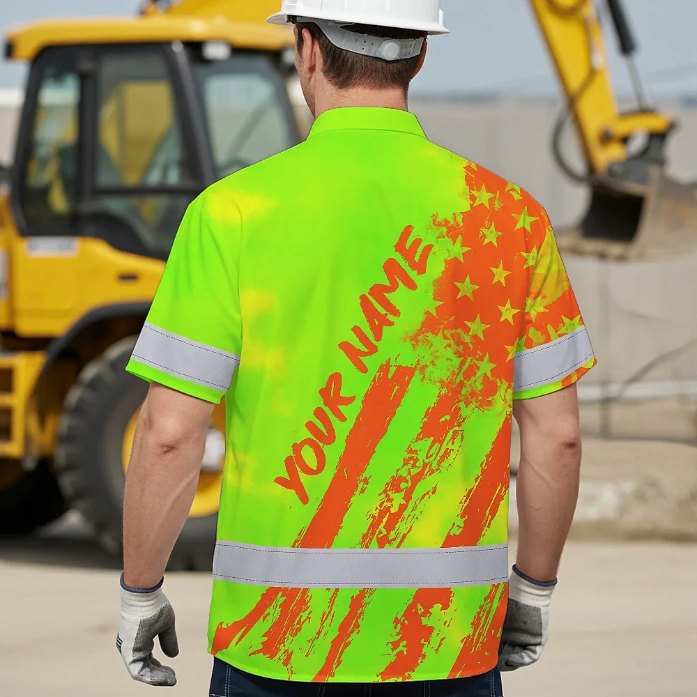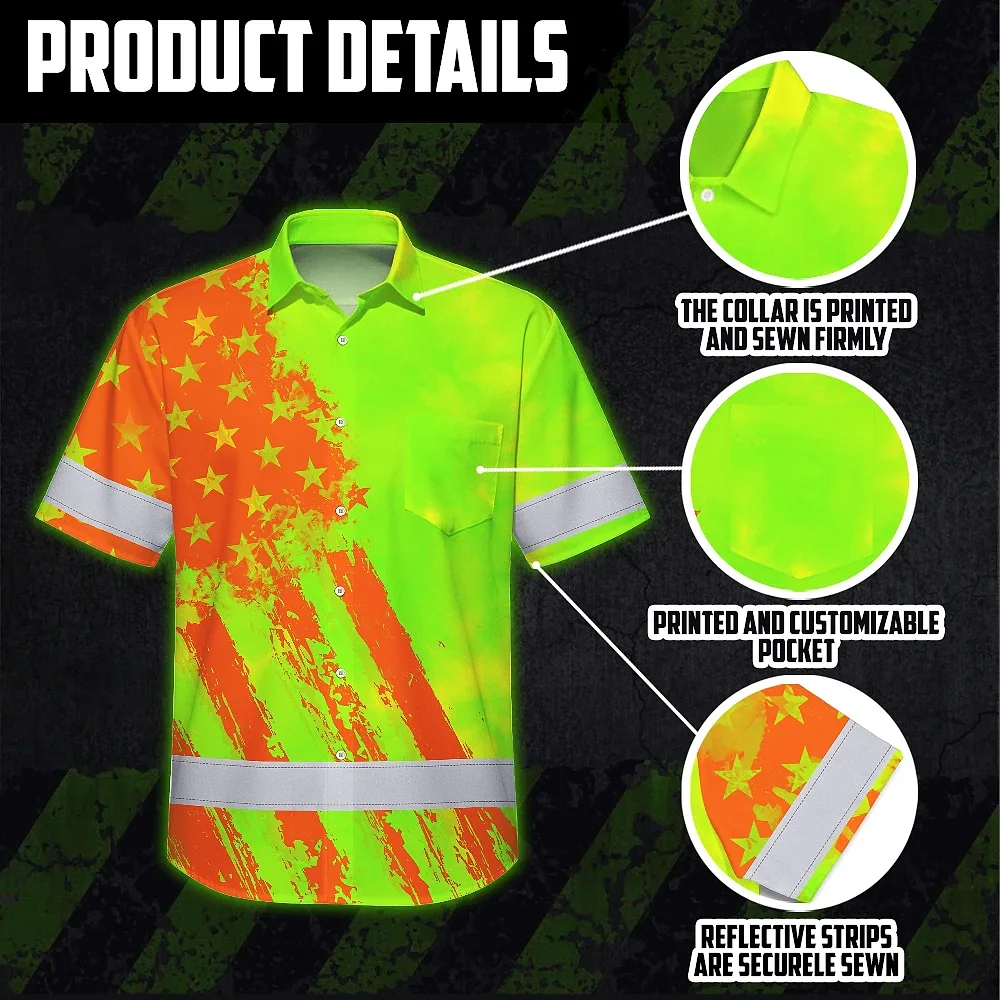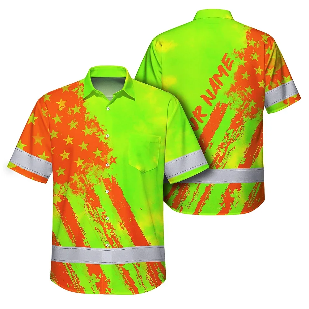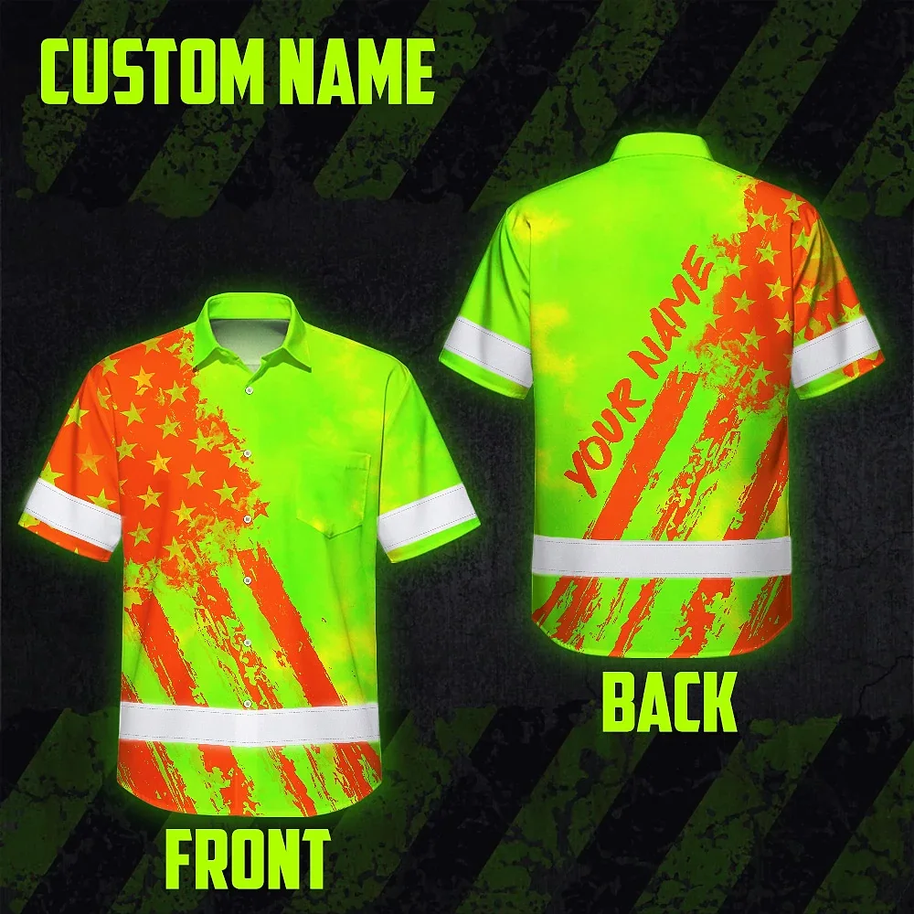 Hi Vis Hawaiian Shirt Reflective Tapes Lime Neon And Orange US Flag Custom Name