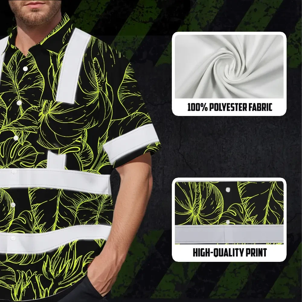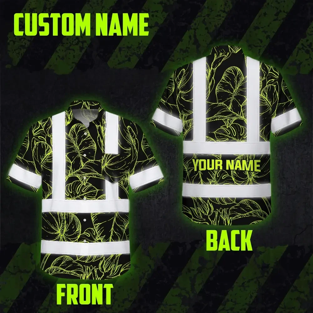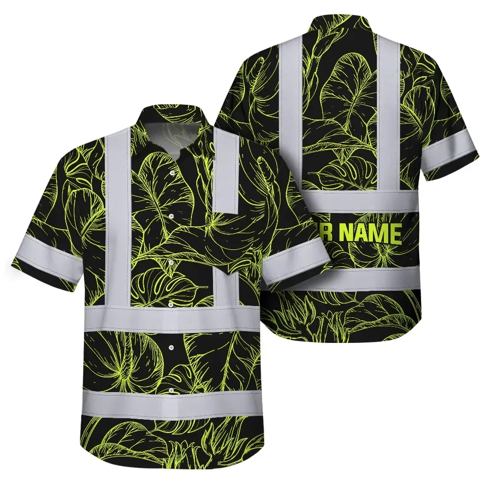Hi Vis Hawaiian Shirt Reflective Tapes Lime Neon Flowers Custom Name Safety Workwear For Workers, Truckers, Operators