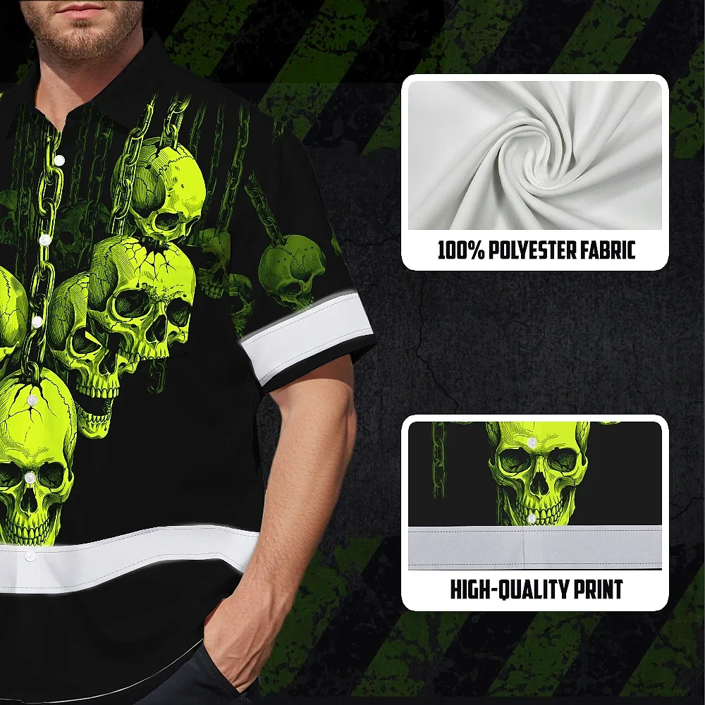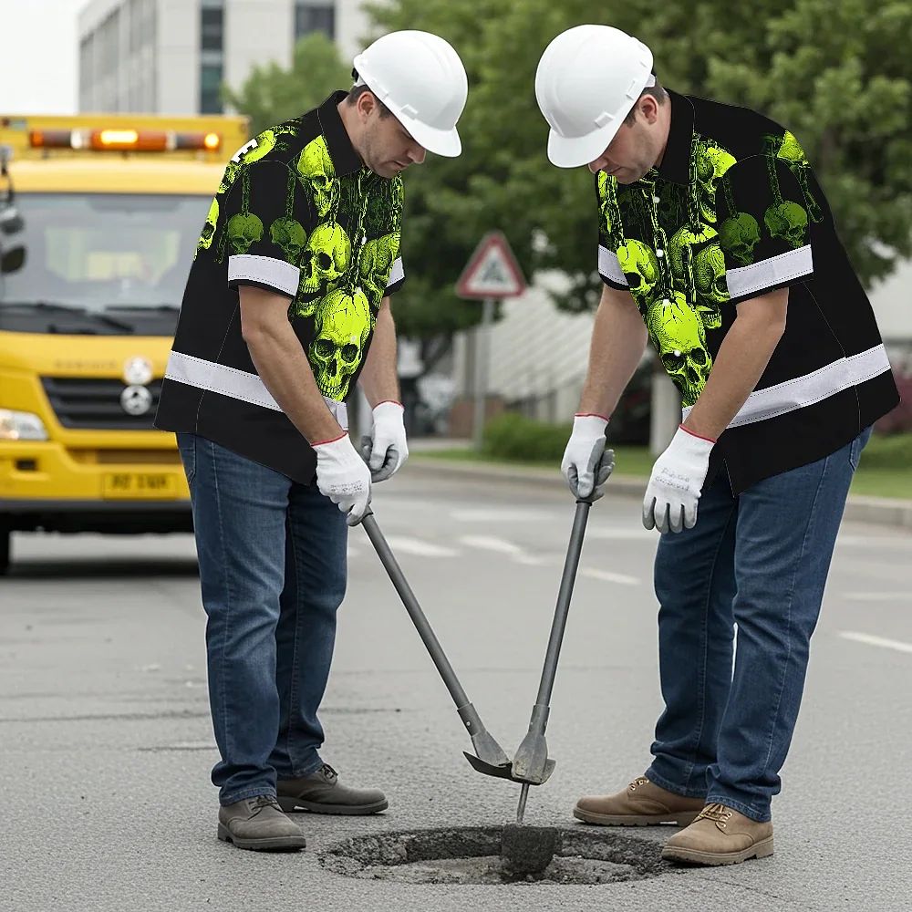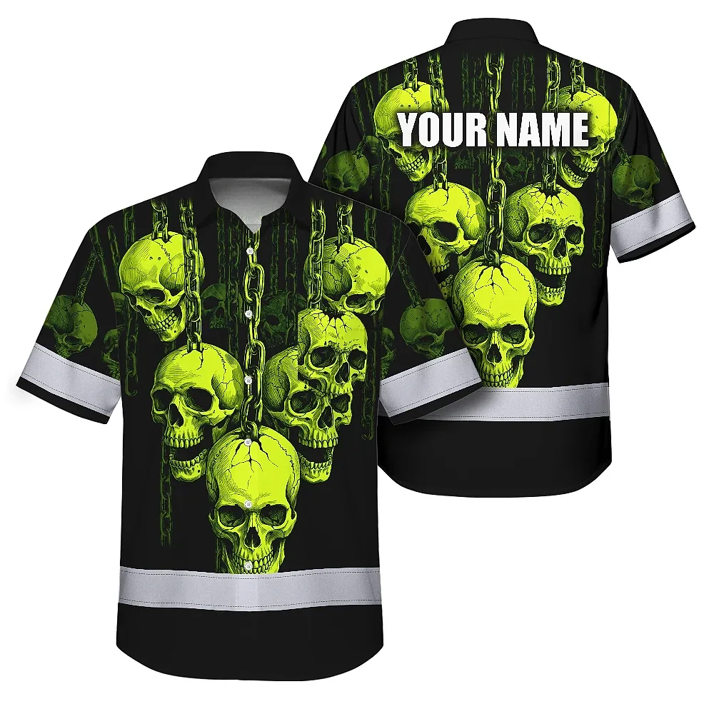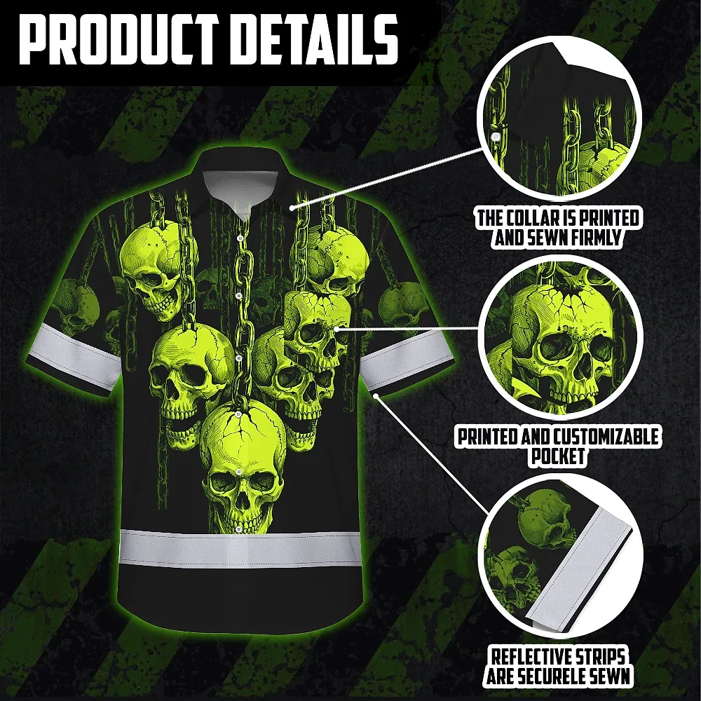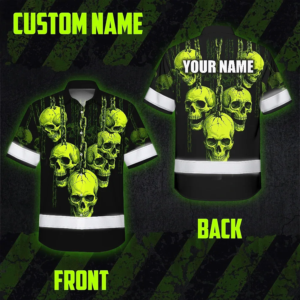 Hi Vis Hawaiian Shirt Reflective Tapes Lime Neon Skull Chain Custom Name Safety Workwear For Workers, Truckers, Operators