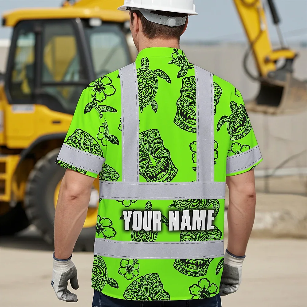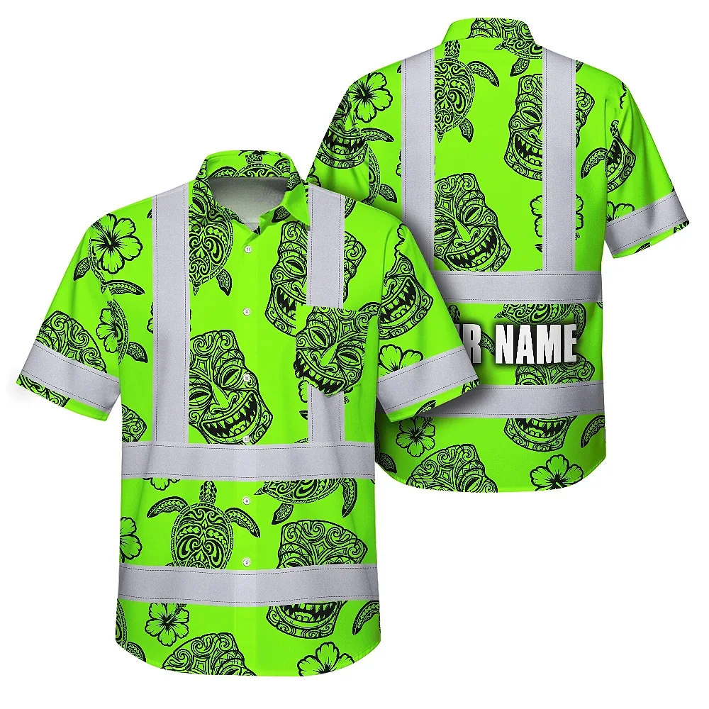 Hi Vis Hawaiian Shirt Reflective Tapes Lime Neon Tiki Custom Name Safety Workwear For Workers, Truckers, Operators