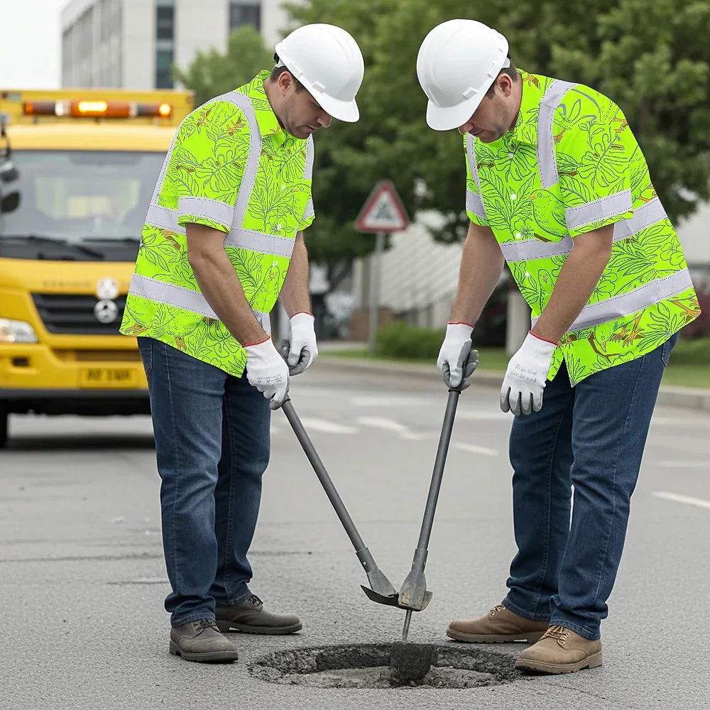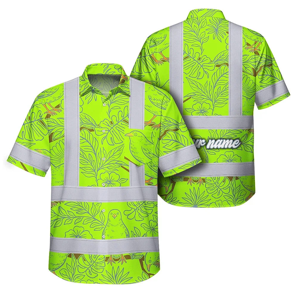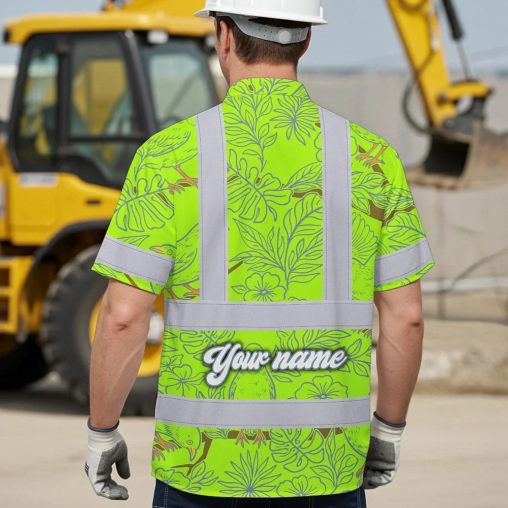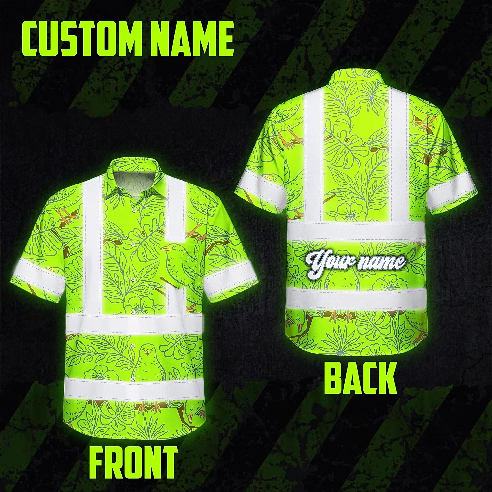 Hi Vis Hawaiian Shirt Reflective Tapes Lime Neon White 2 Flowers Custom Name Safety Workwear For Workers, Truckers, Operators