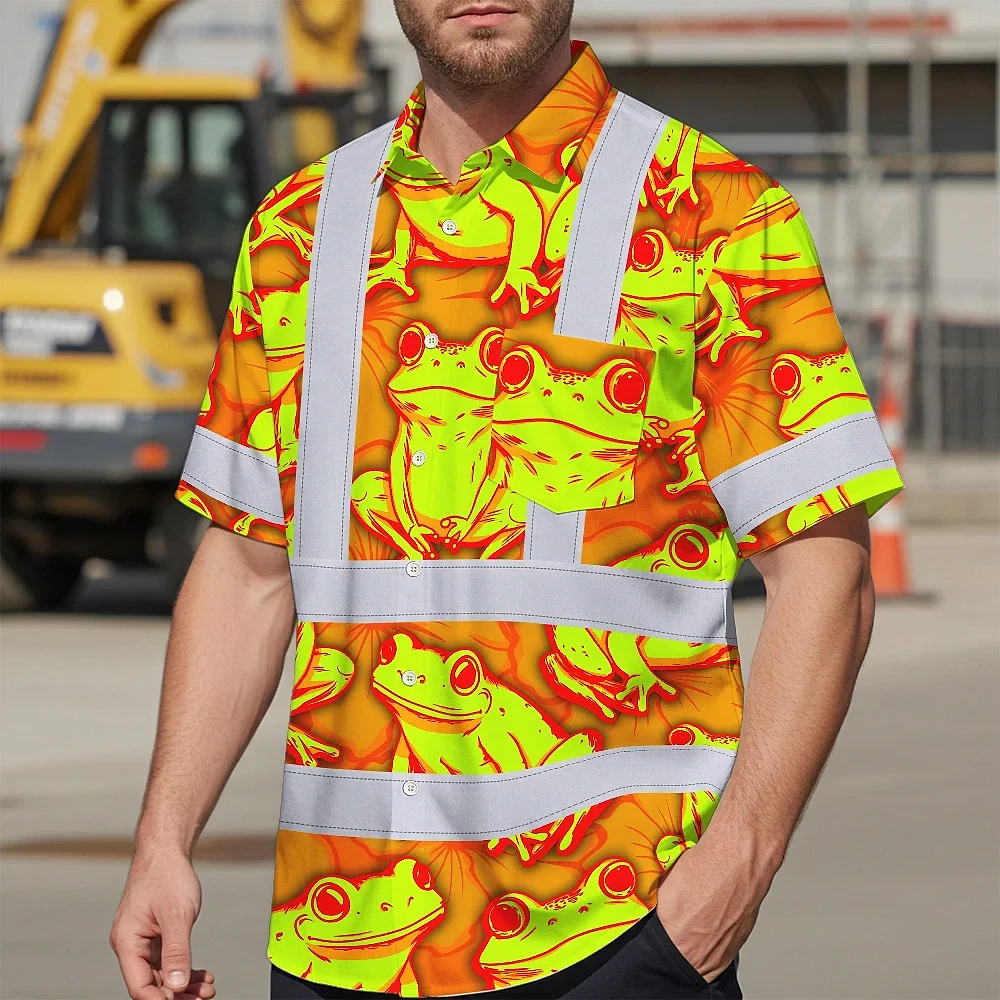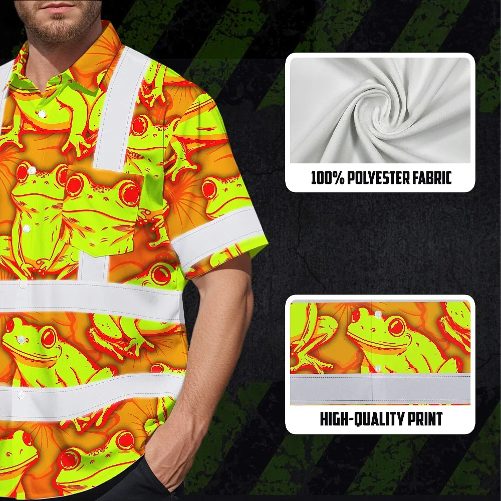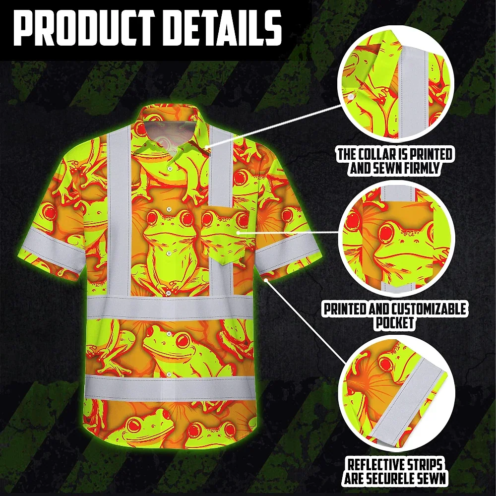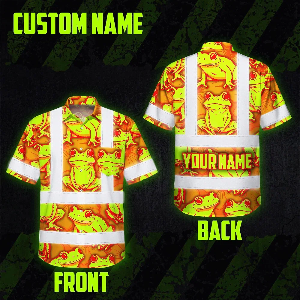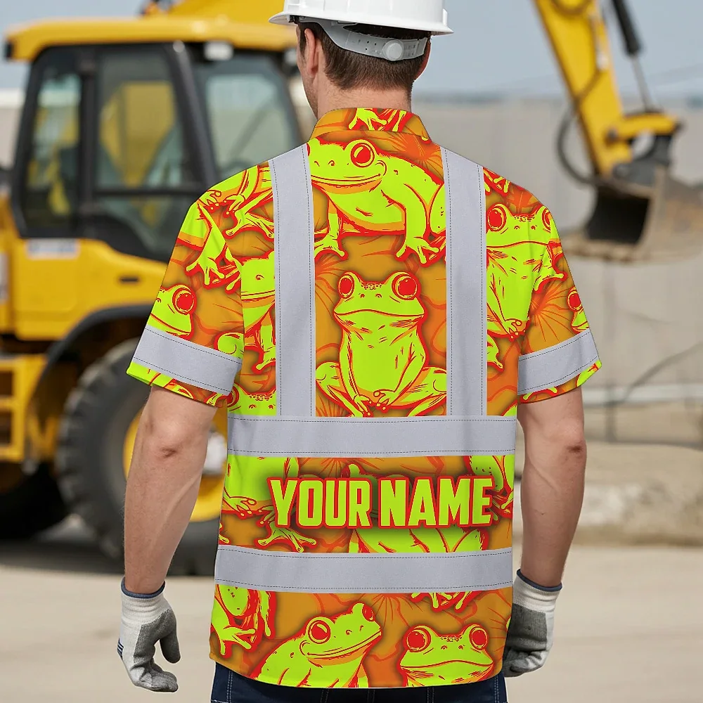 Hi Vis Hawaiian Shirt Reflective Tapes Orange And Lime Neon Frog Custom Name Safety Workwear For Workers, Truckers, Operators
