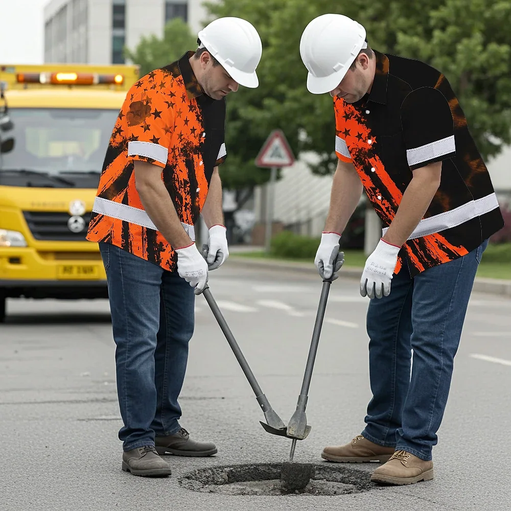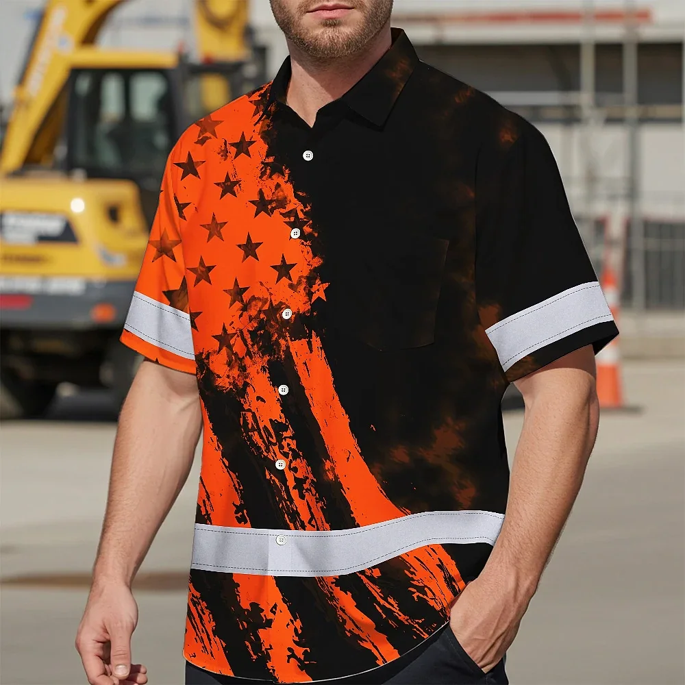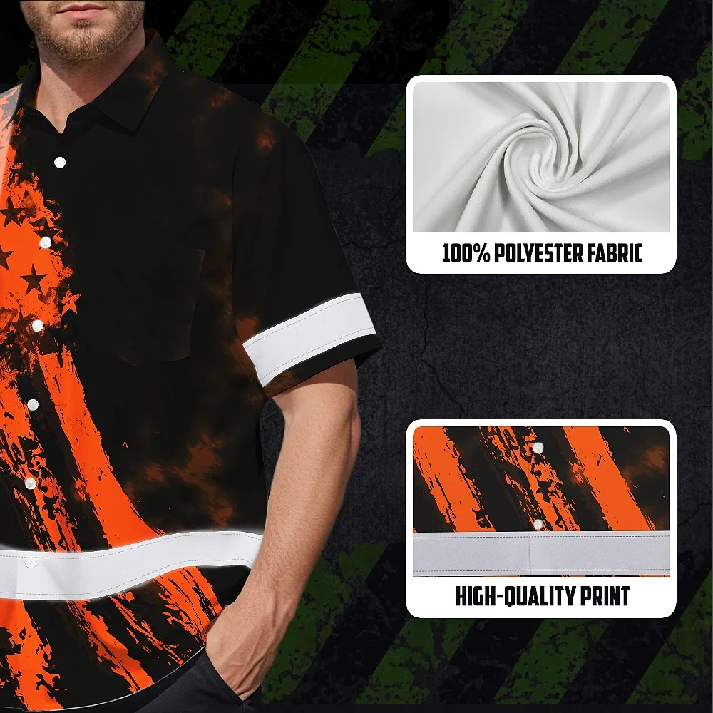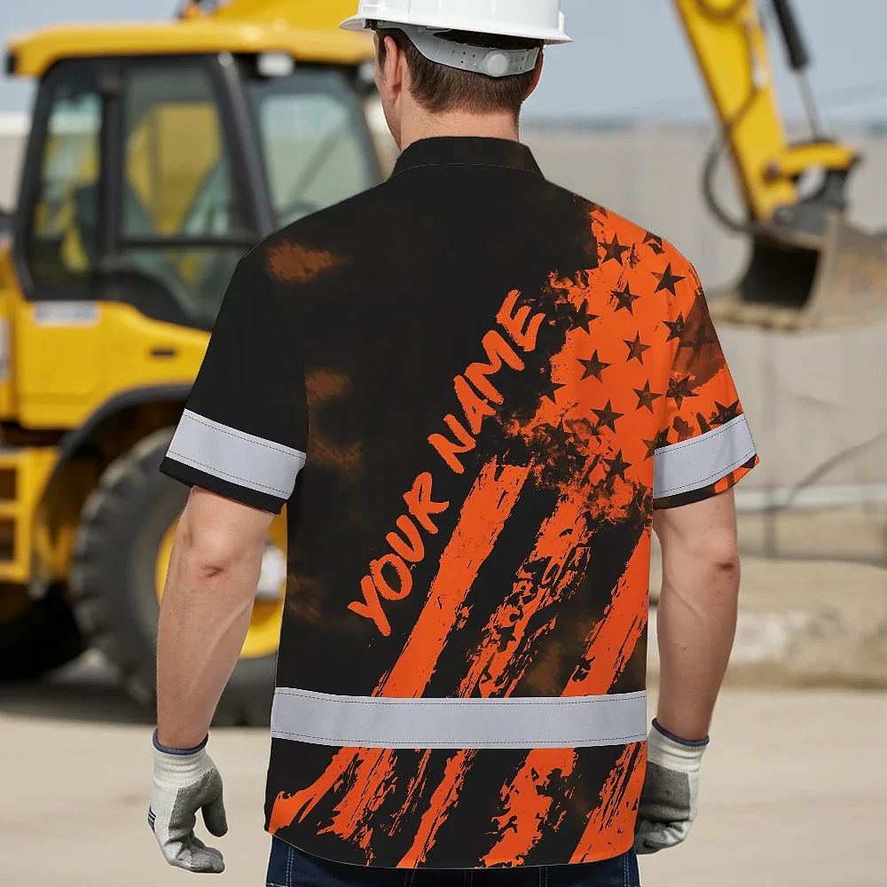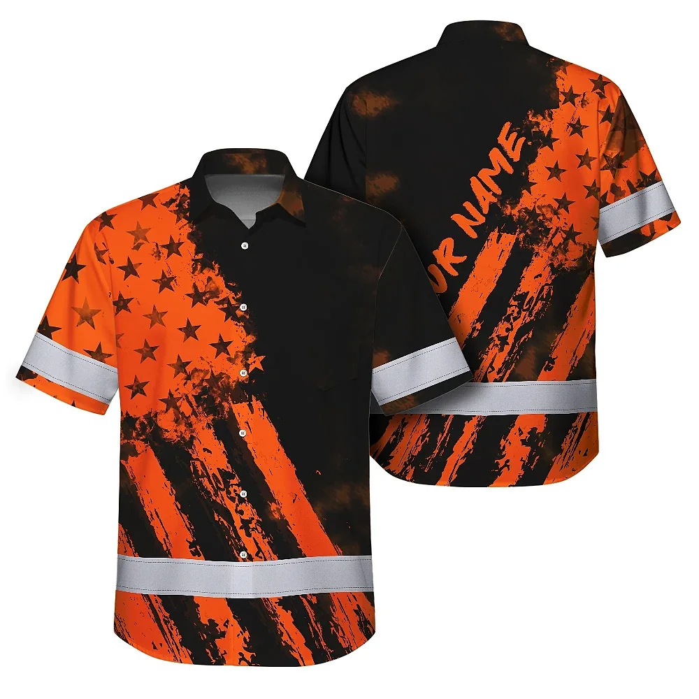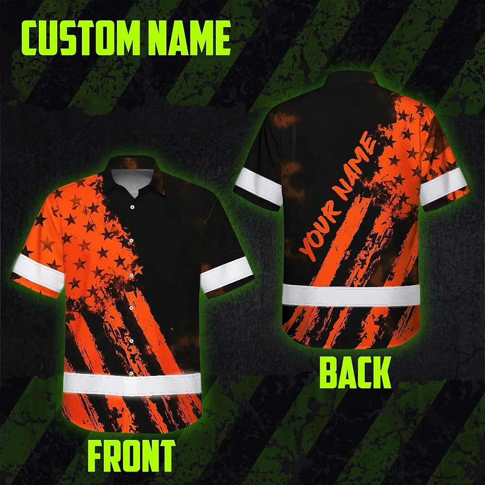 Hi Vis Hawaiian Shirt Reflective Tapes Orange Neon And Black US Flag Custom Name