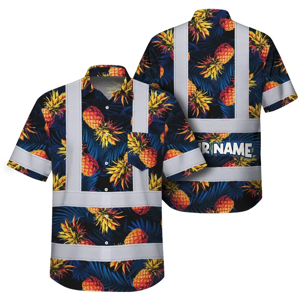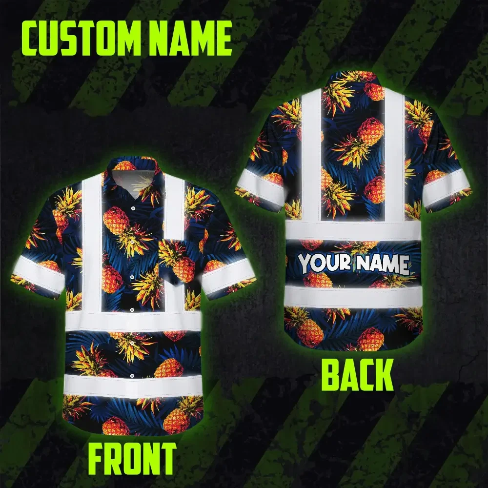 Hi Vis Hawaiian Shirt Reflective Tapes Orange Neon And Dark Blue Custom Name Safety Workwear For Workers, Truckers, Operators