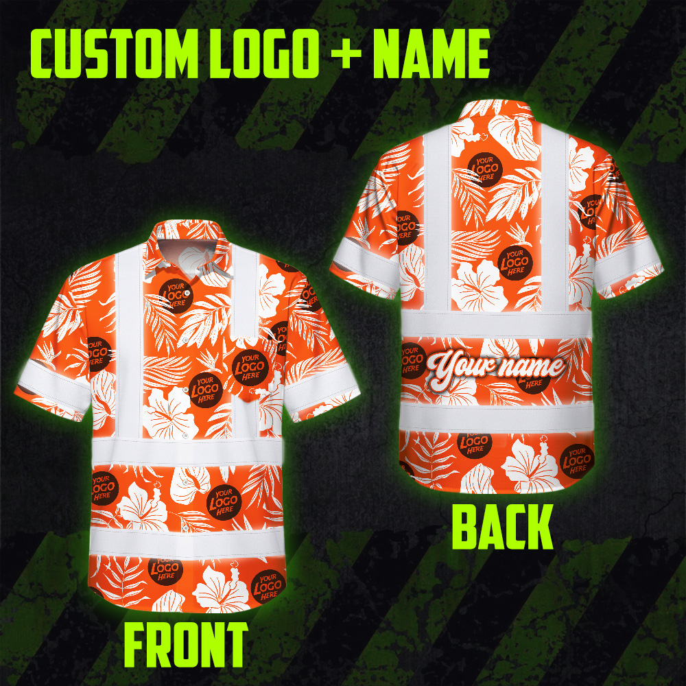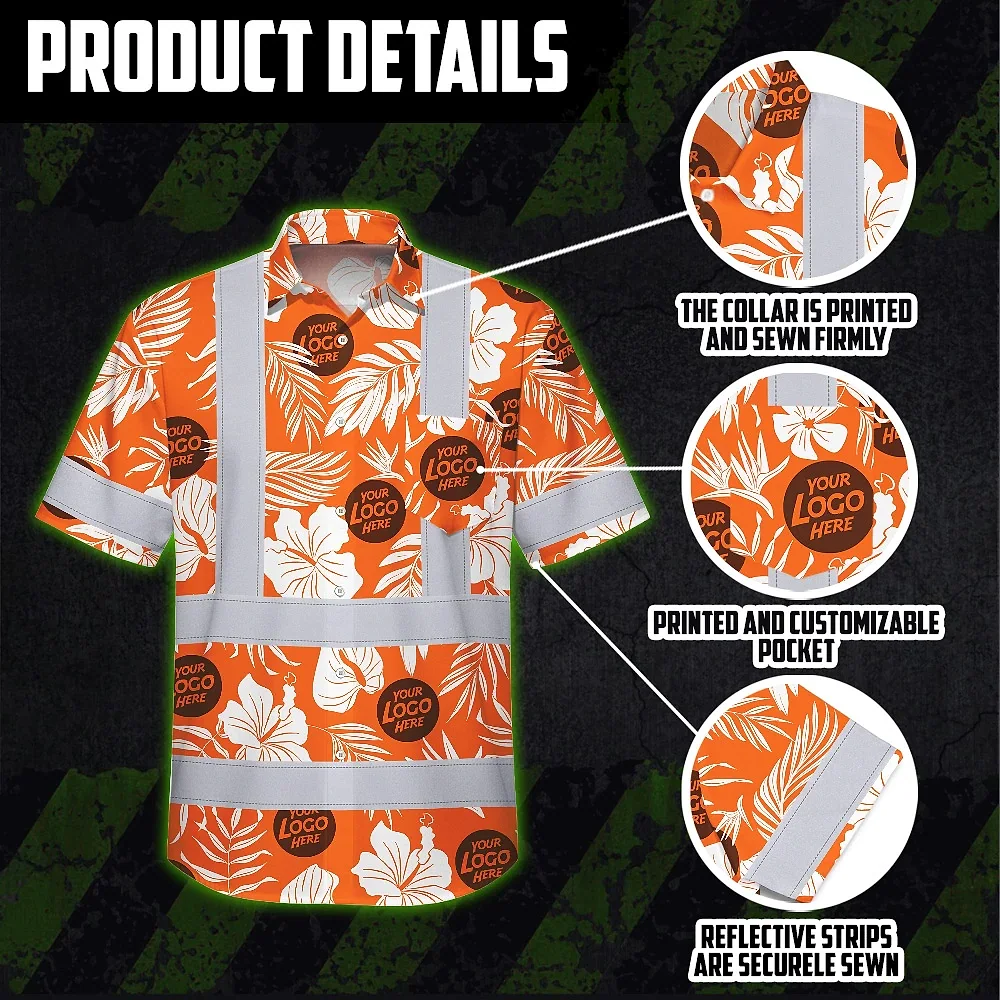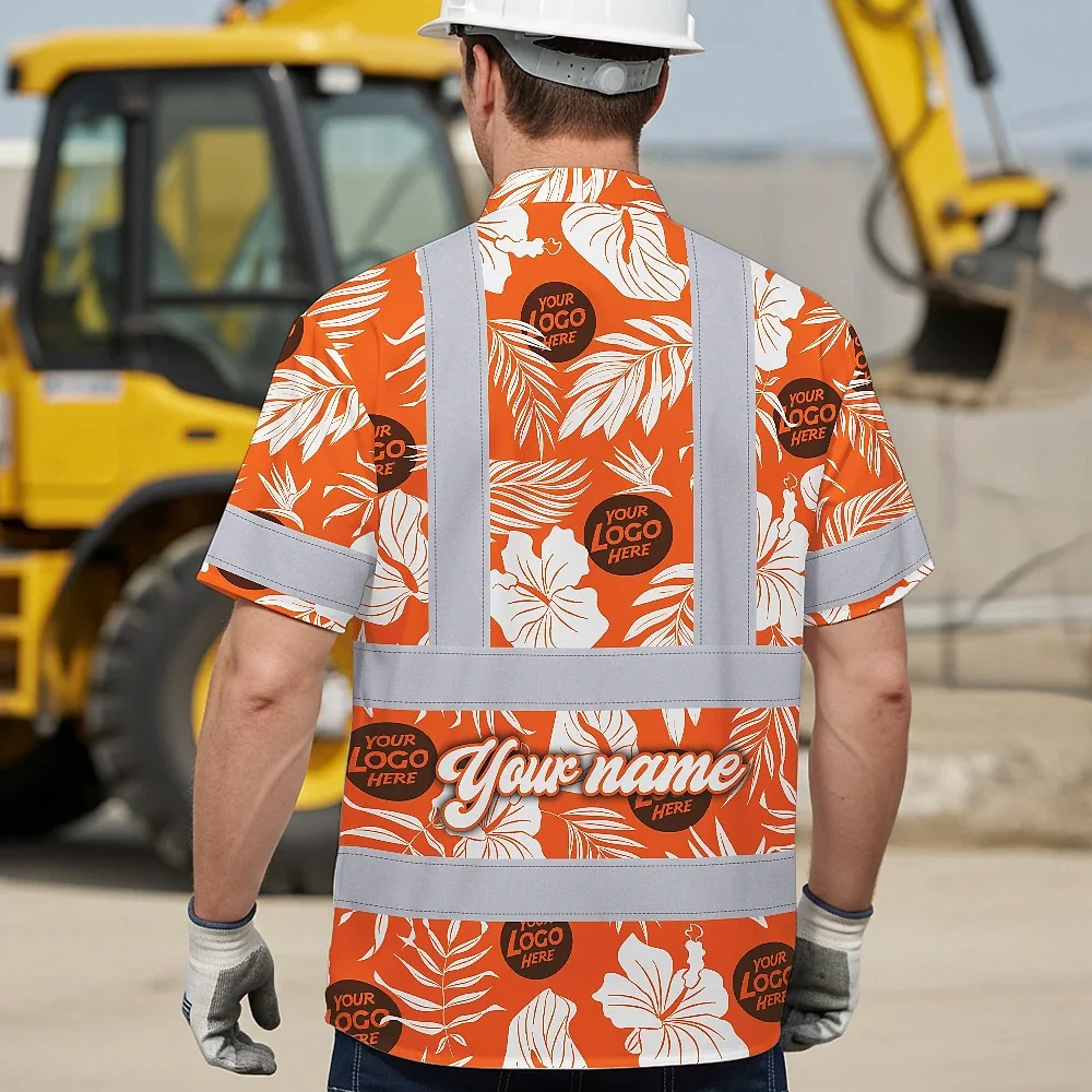 Hi Vis Hawaiian Shirt Reflective Tapes Orange Neon And White Flowers Custom Name And Logo Safety Workwear For Workers, Truckers, Operators, Company
