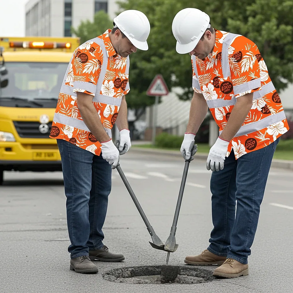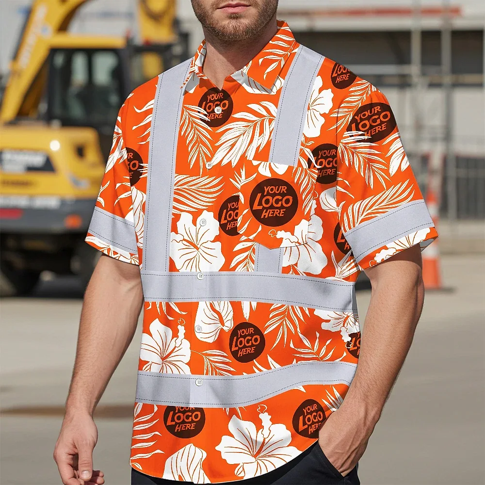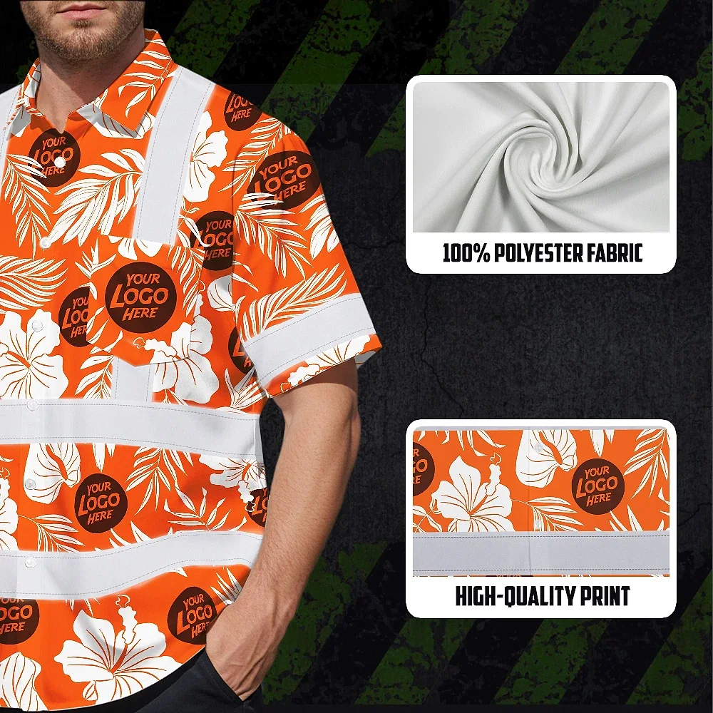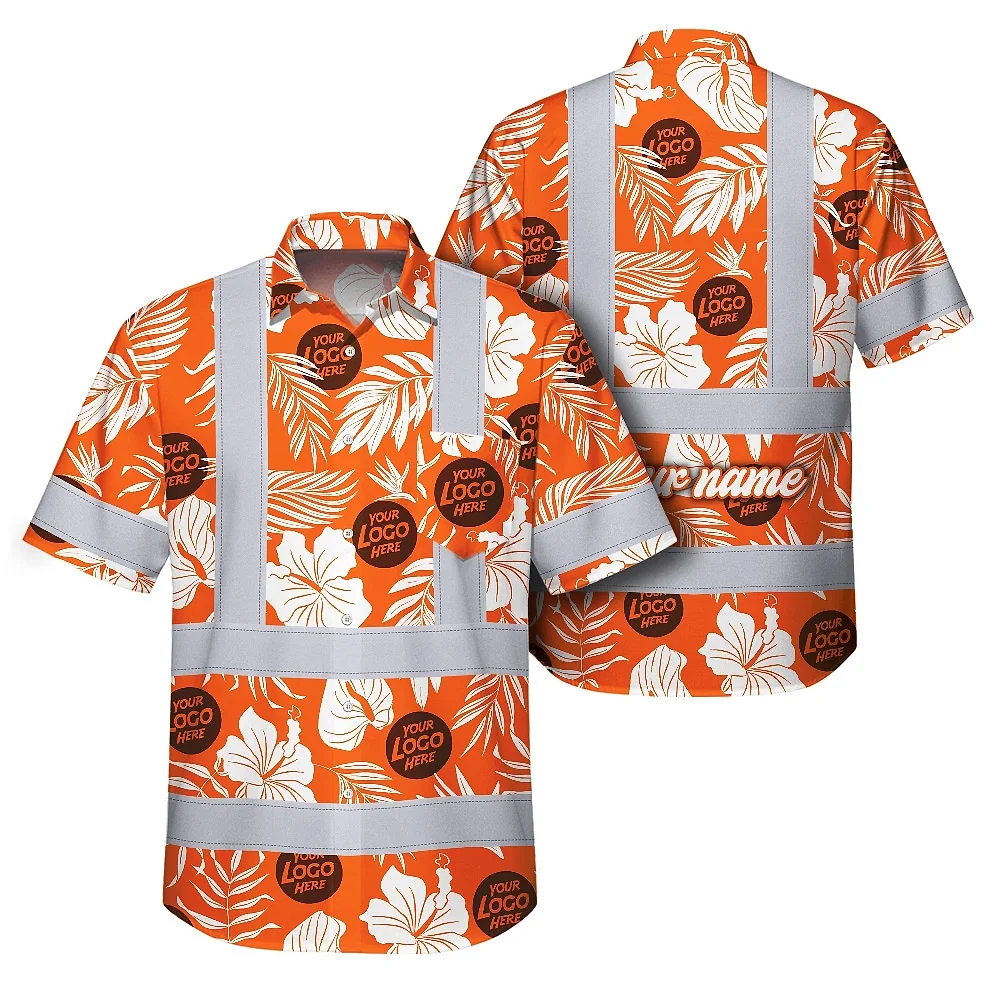 Hi Vis Hawaiian Shirt Reflective Tapes Orange Neon And White Flowers Custom Name And Logo Safety Workwear For Workers, Truckers, Operators, Company