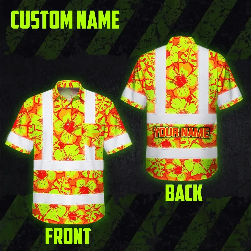 Hi Vis Hawaiian Shirt Reflective Tapes Orange Neon And Yellow Flowers Custom Name Safety Workwear For Workers, Truckers, Operators