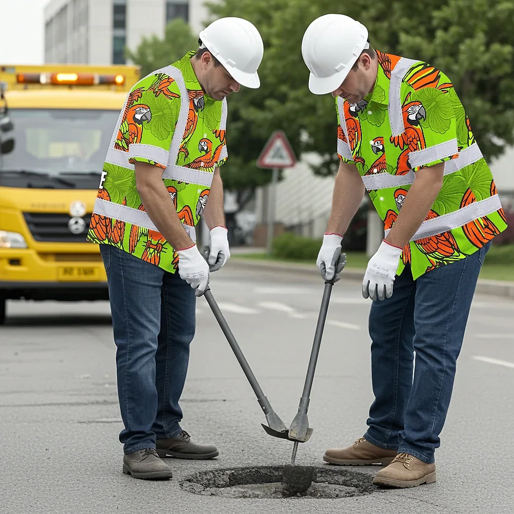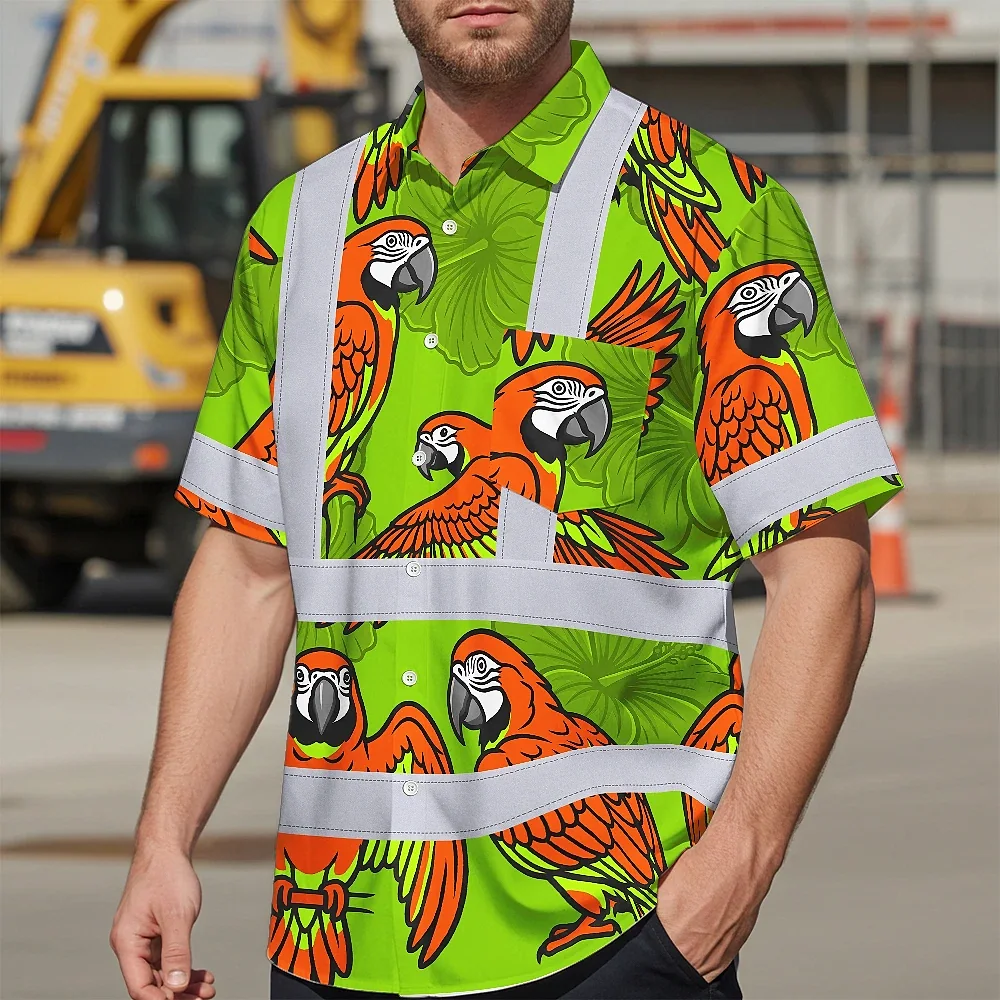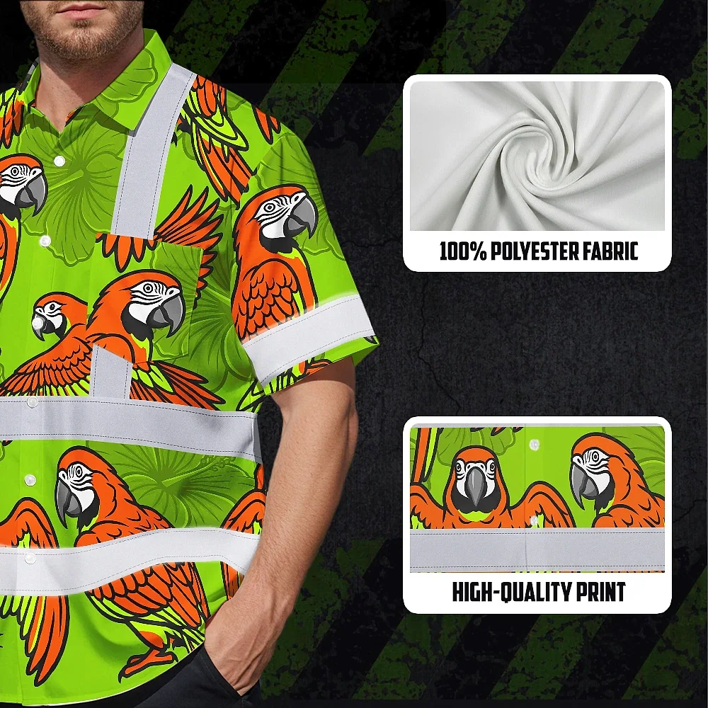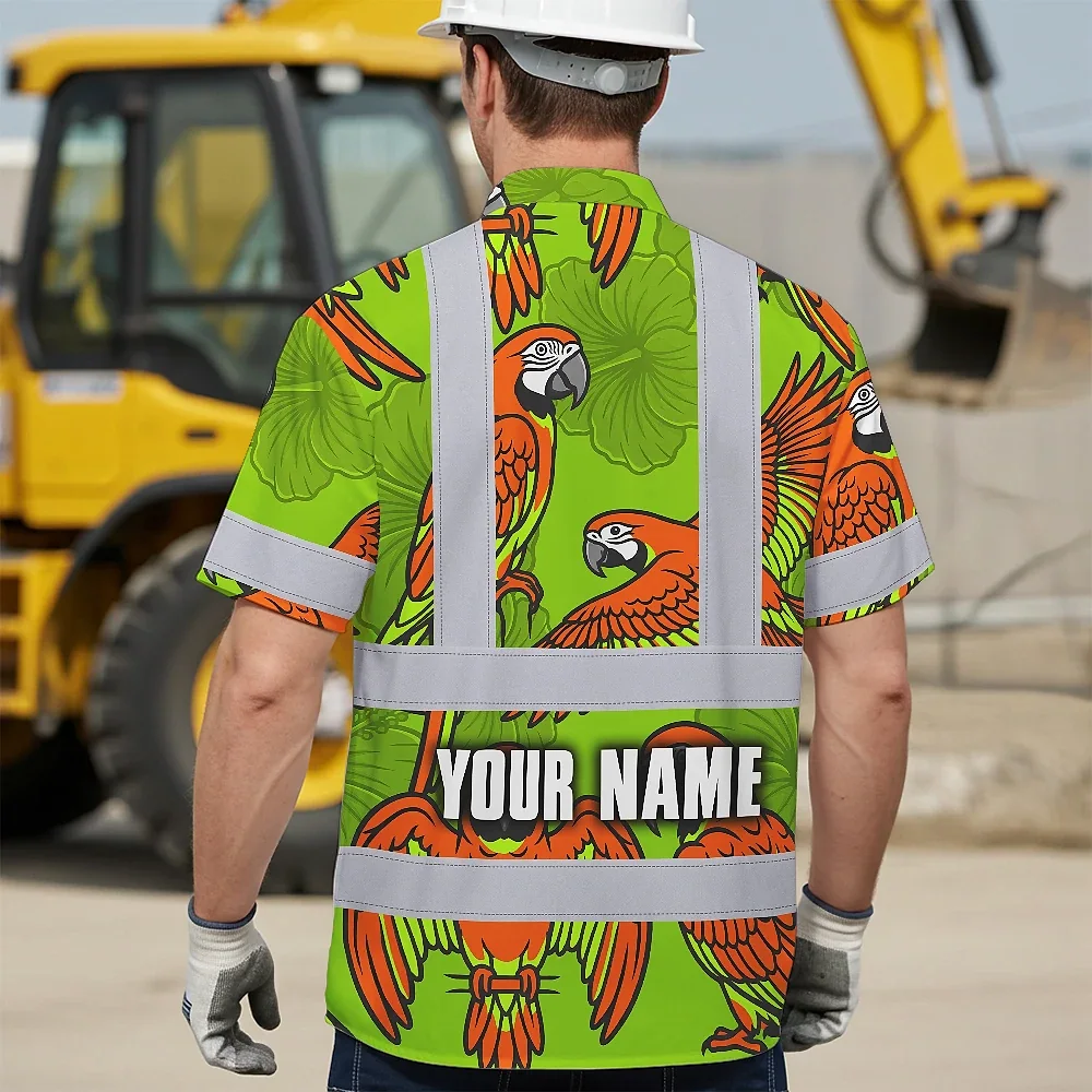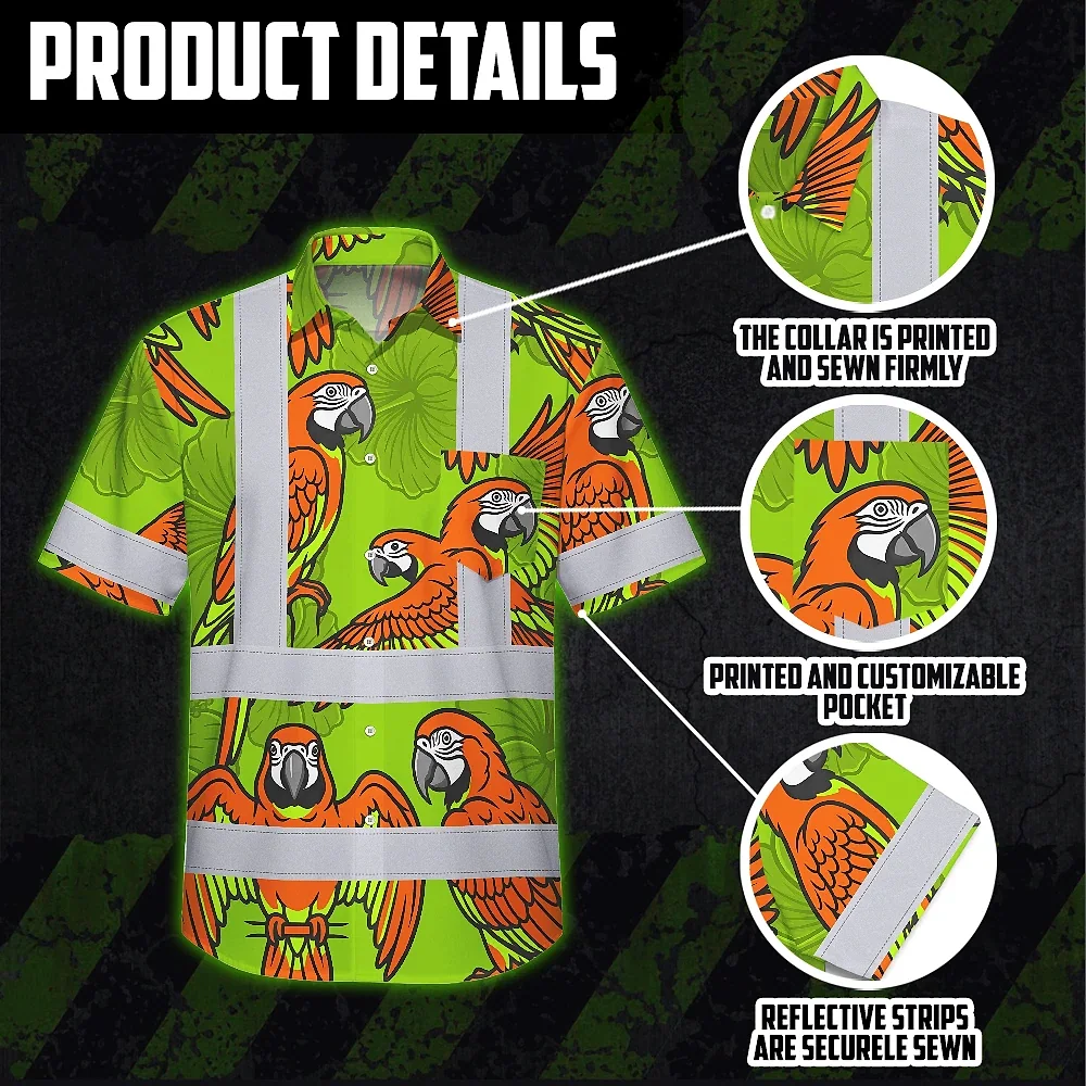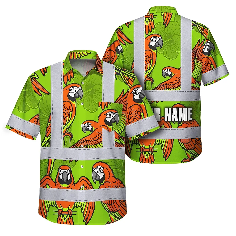 Hi Vis Hawaiian Shirt Reflective Tapes Orange Neon Lime Parrot Custom Name Safety Workwear For Workers, Truckers, Operators