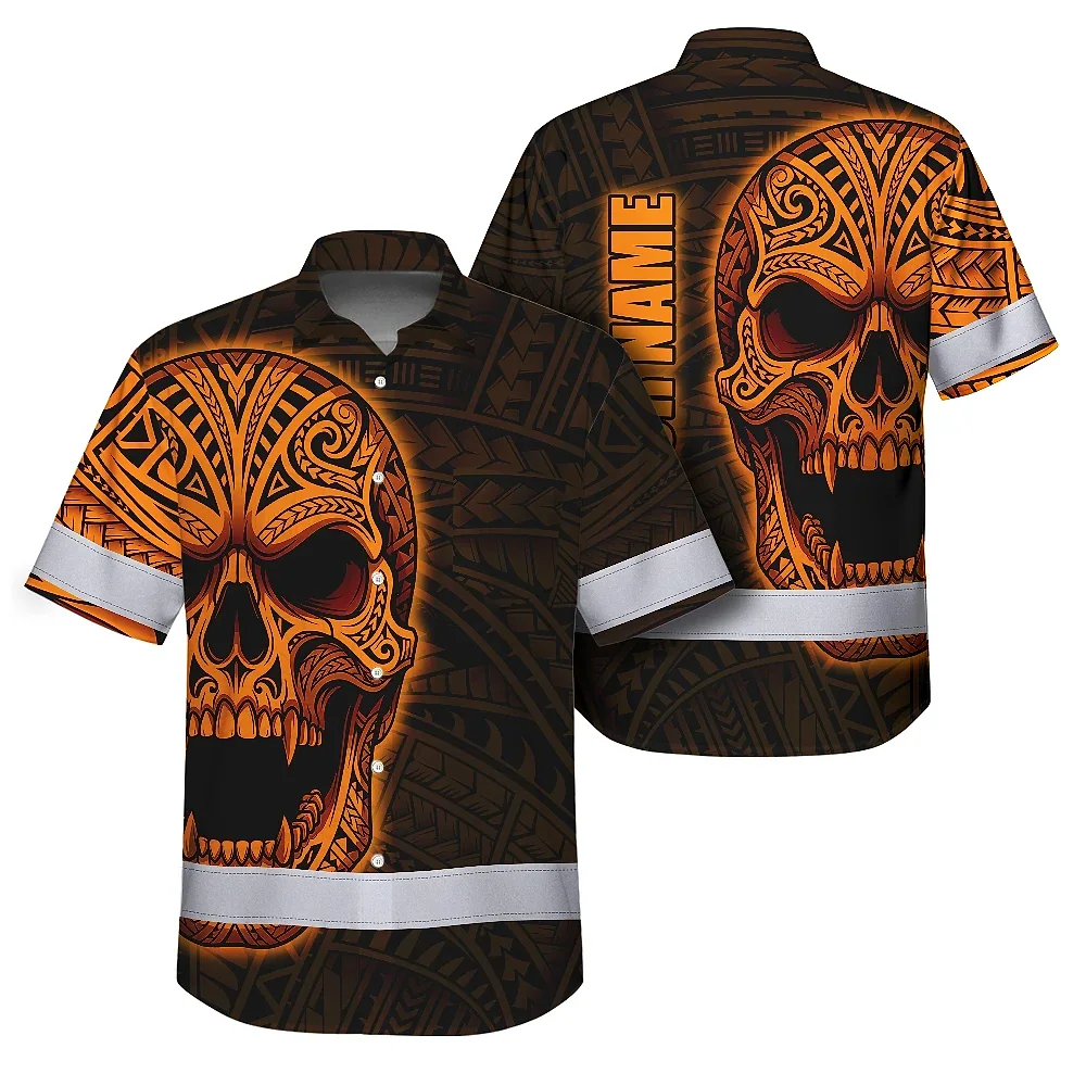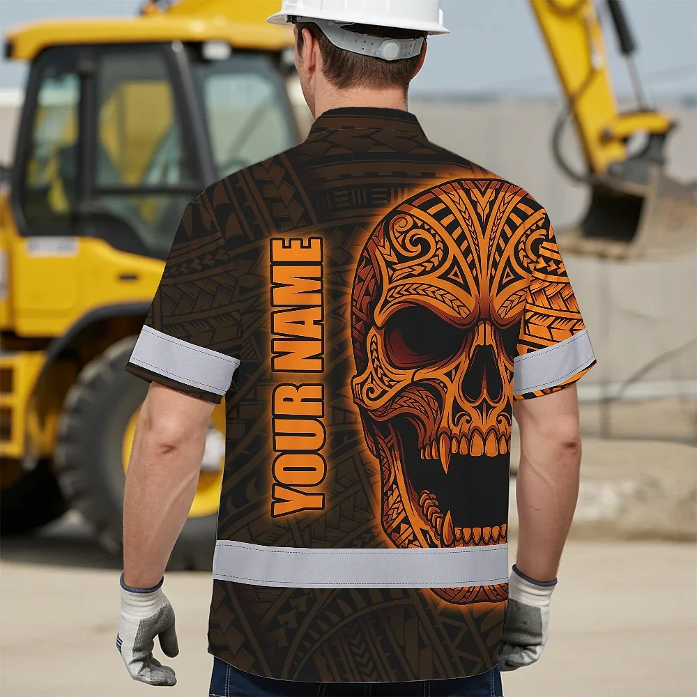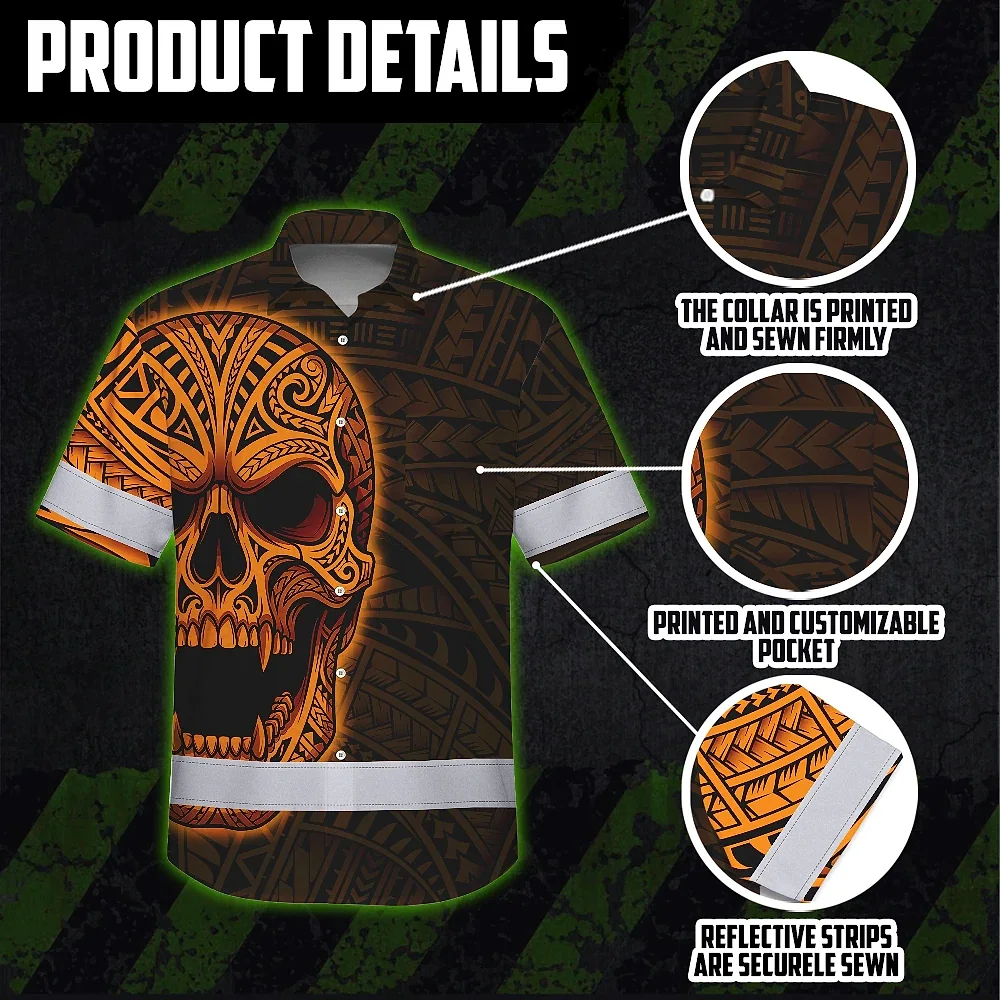 Hi Vis Hawaiian Shirt Reflective Tapes Orange Neon Polynesian Half Skull Custom Name Safety Workwear For Workers, Truckers, Operators