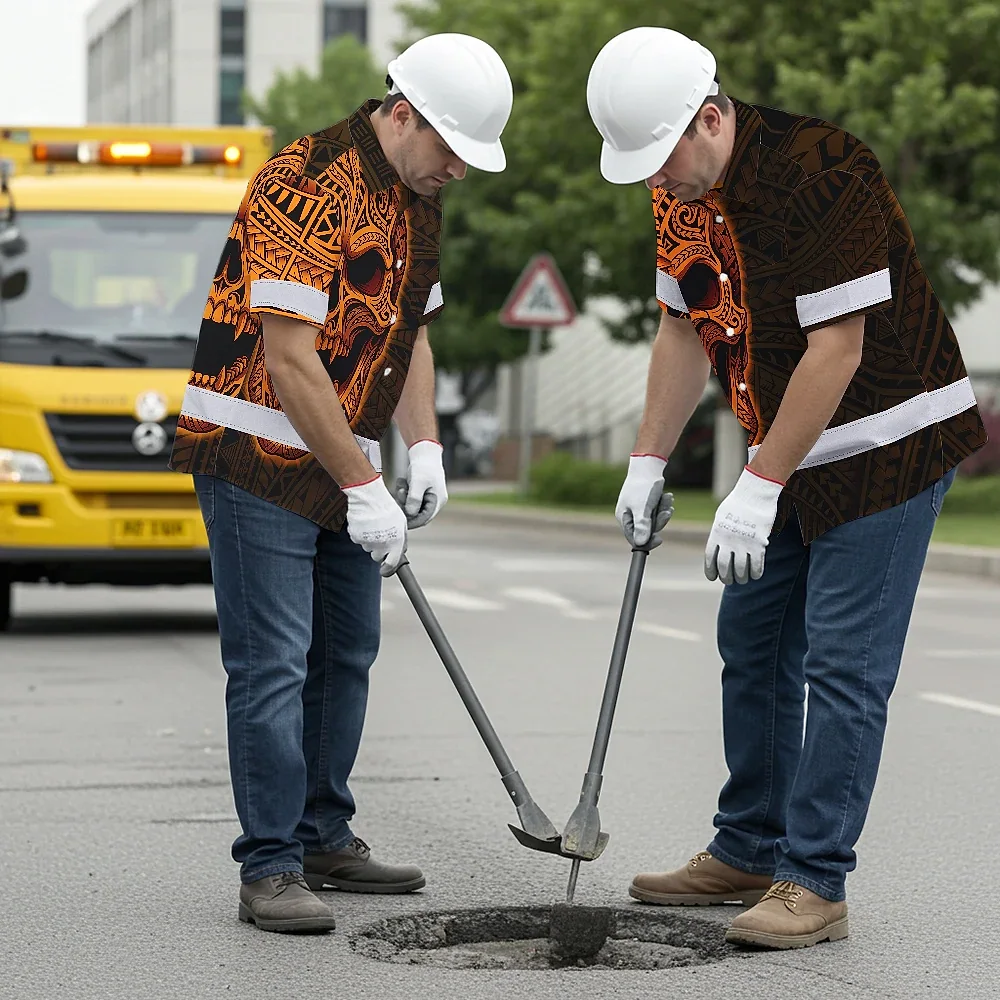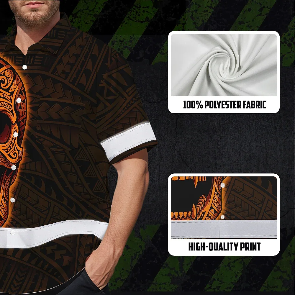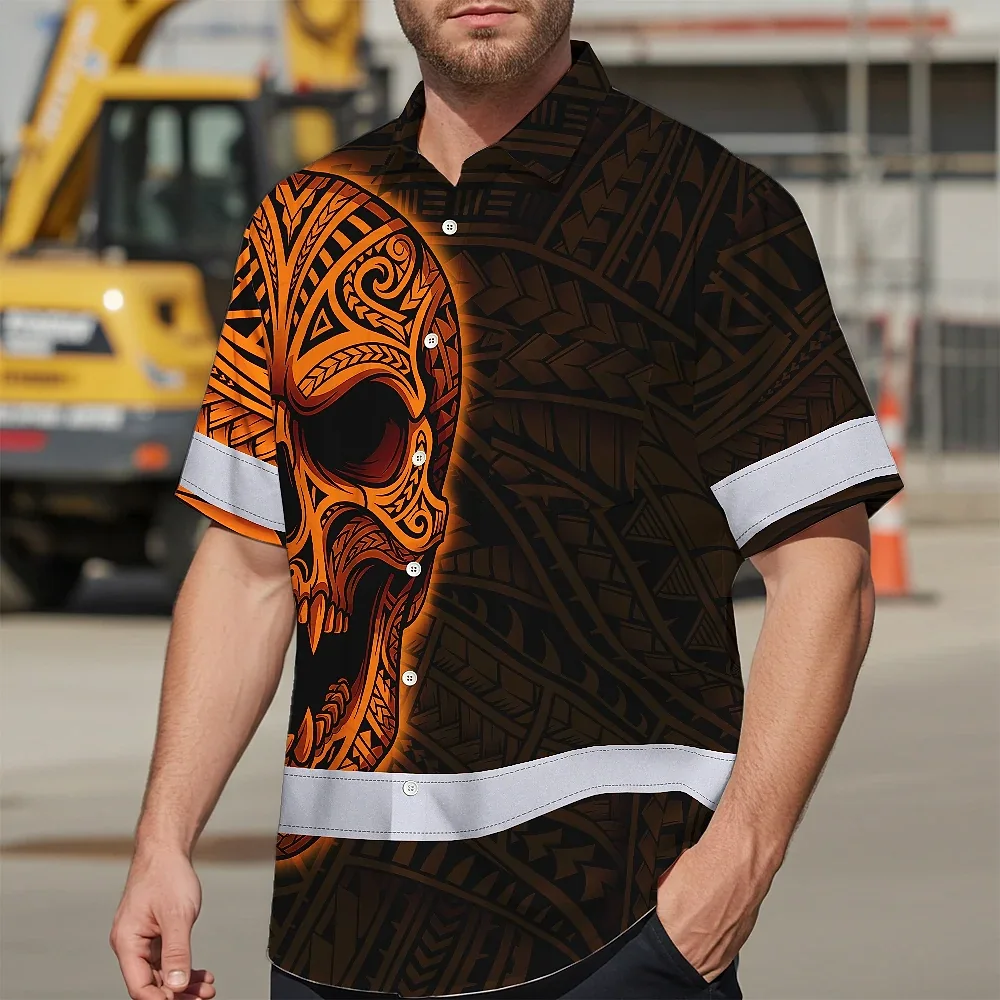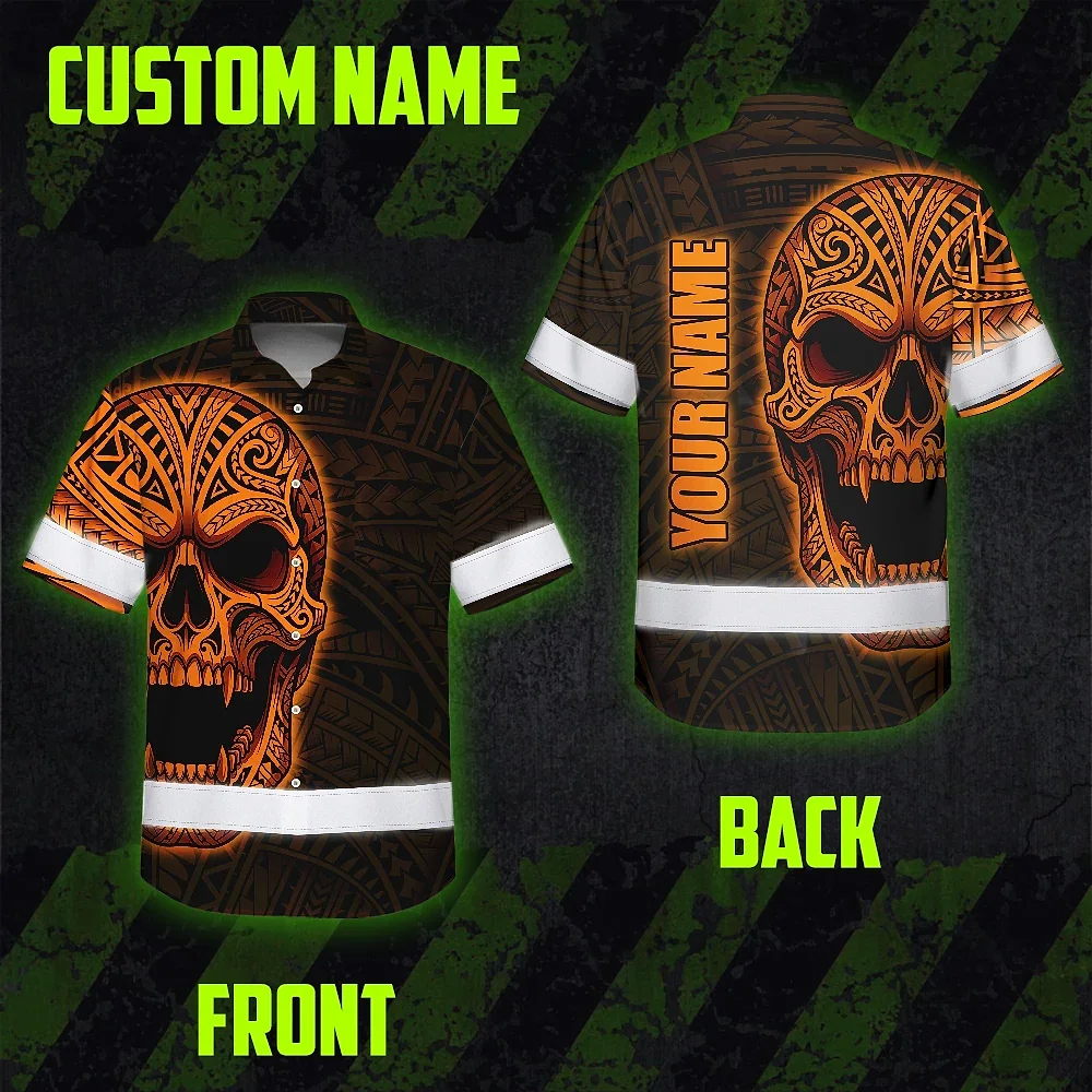 Hi Vis Hawaiian Shirt Reflective Tapes Orange Neon Polynesian Half Skull Custom Name Safety Workwear For Workers, Truckers, Operators