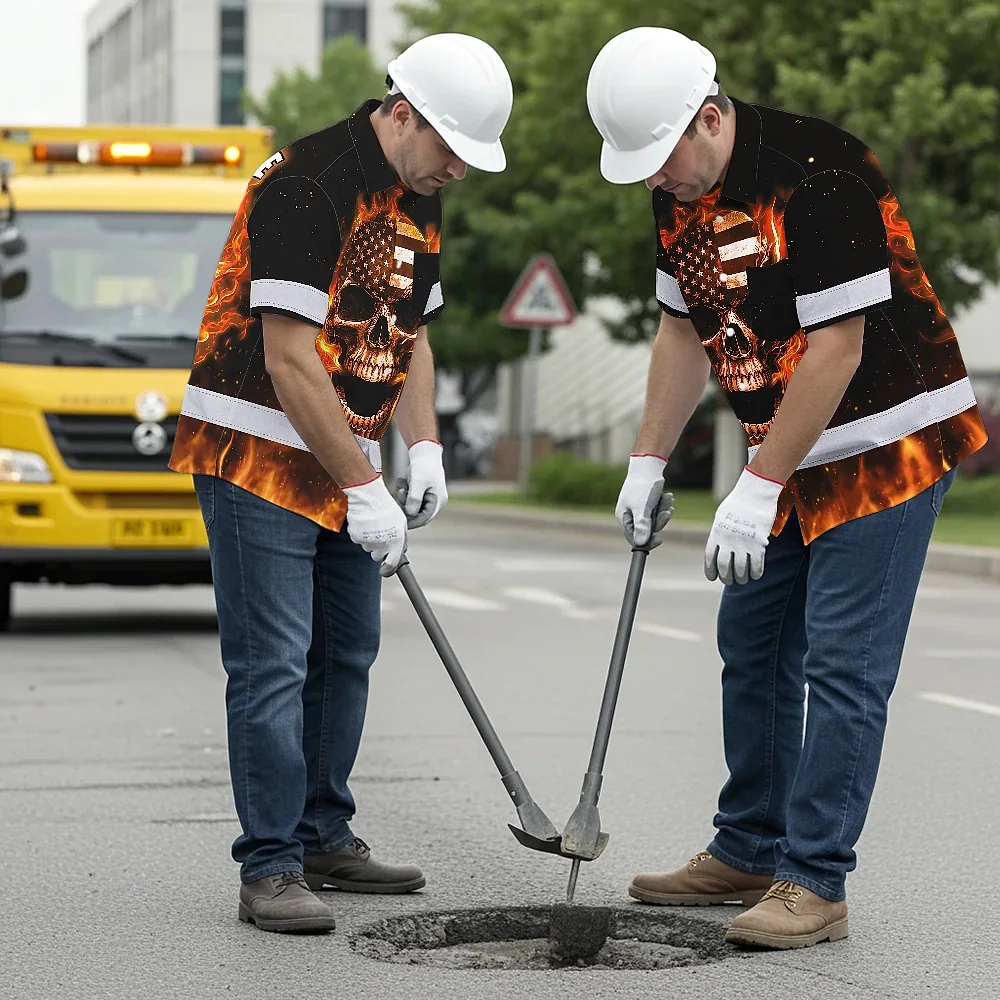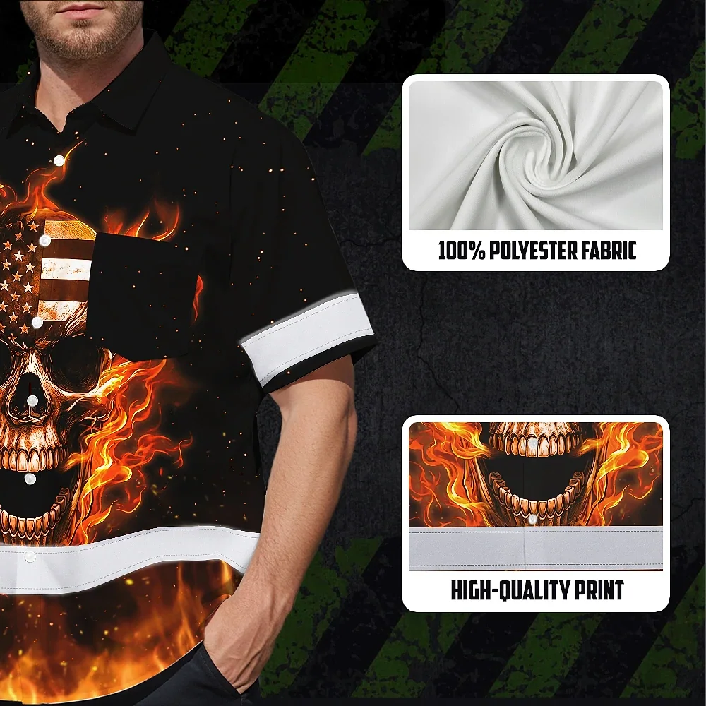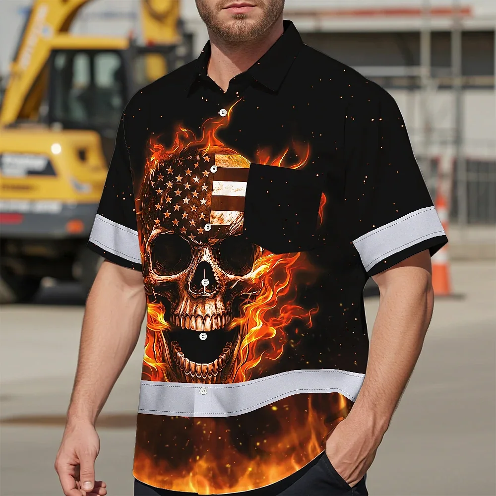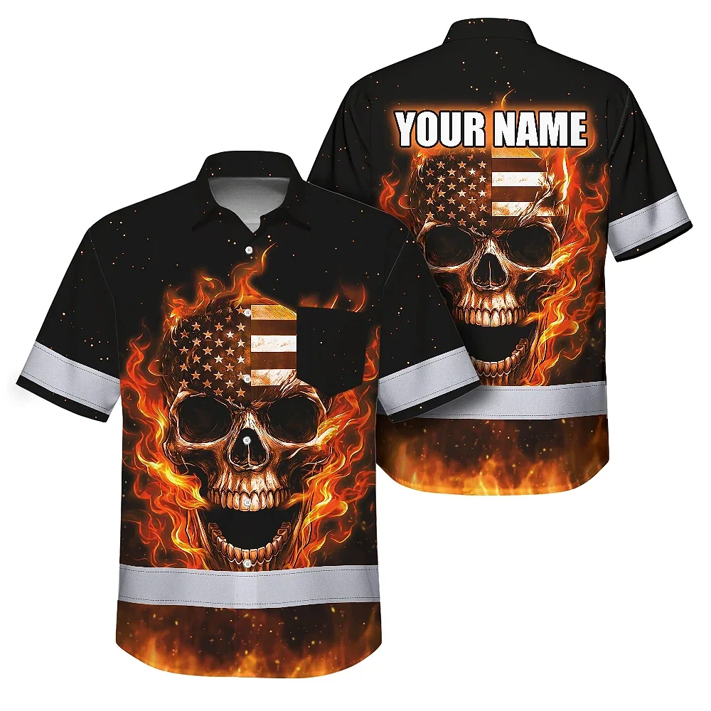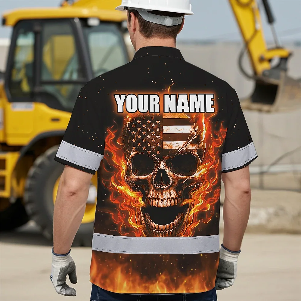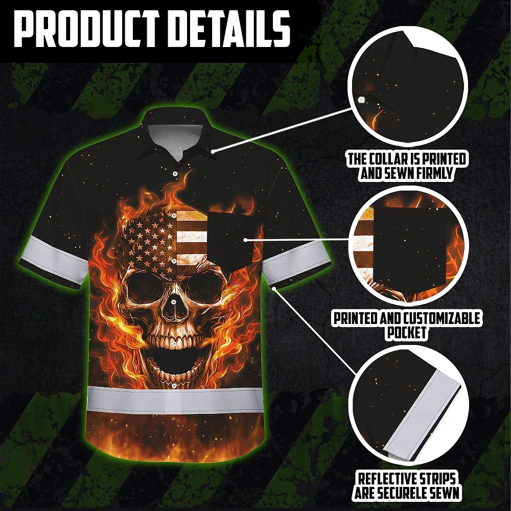 Hi Vis Hawaiian Shirt Reflective Tapes Orange Neon US Skull Custom Name Safety Workwear For Workers, Truckers, Operators