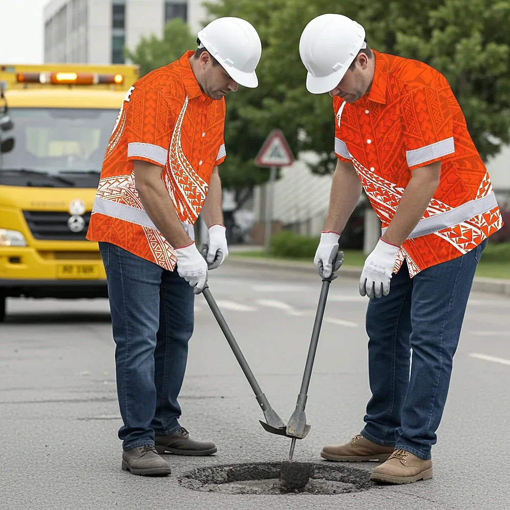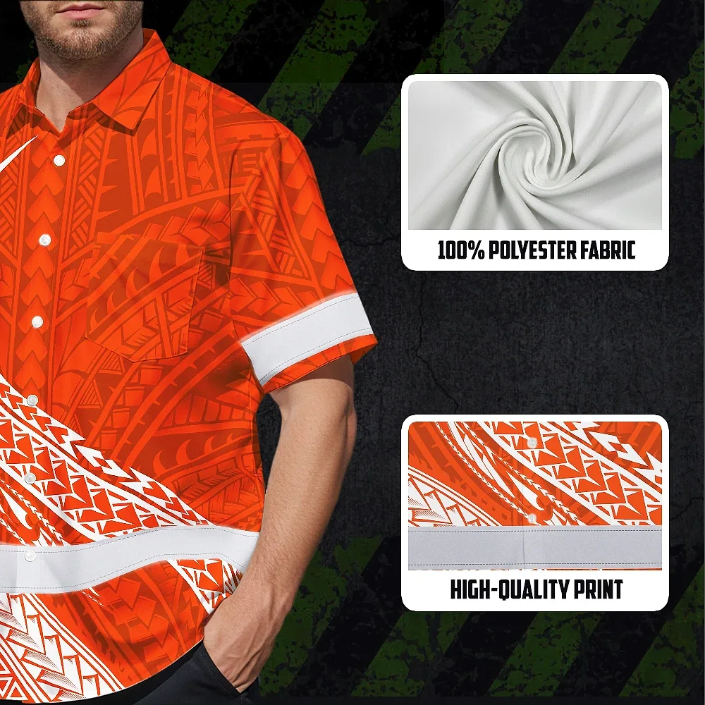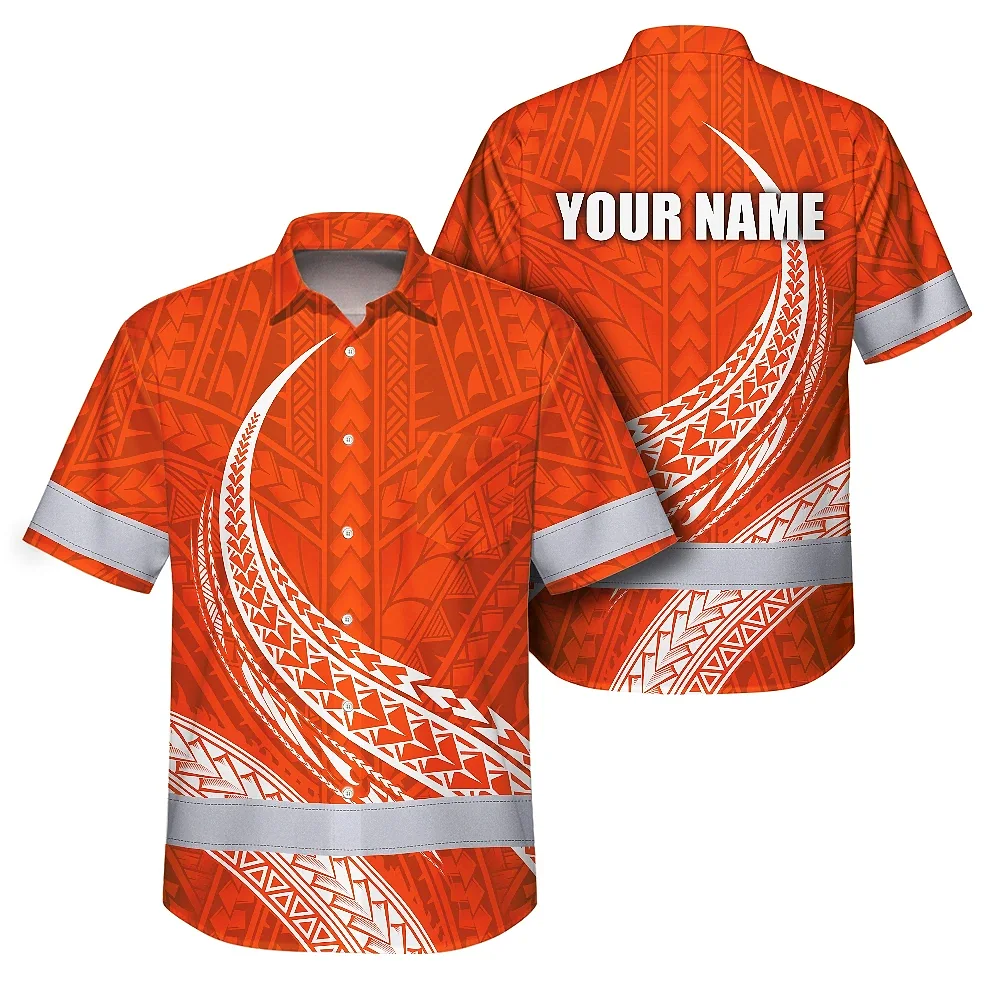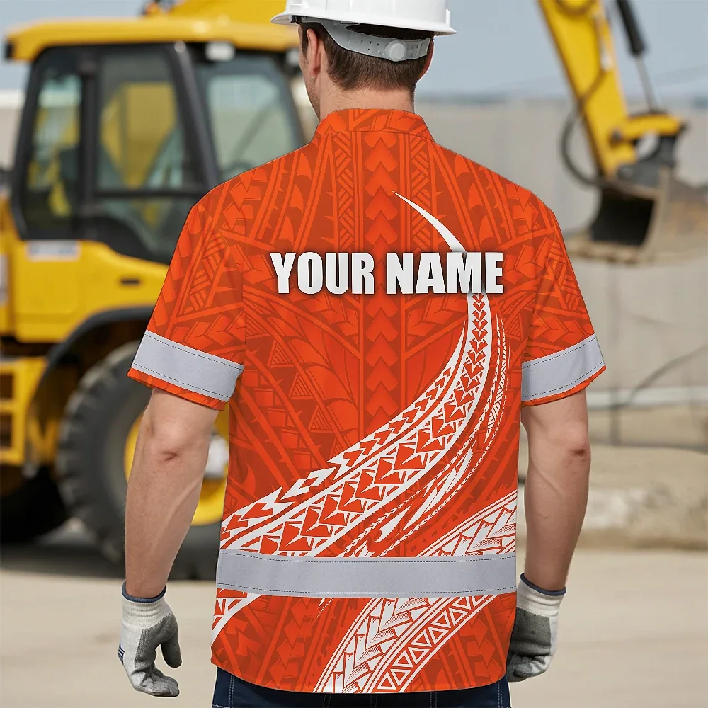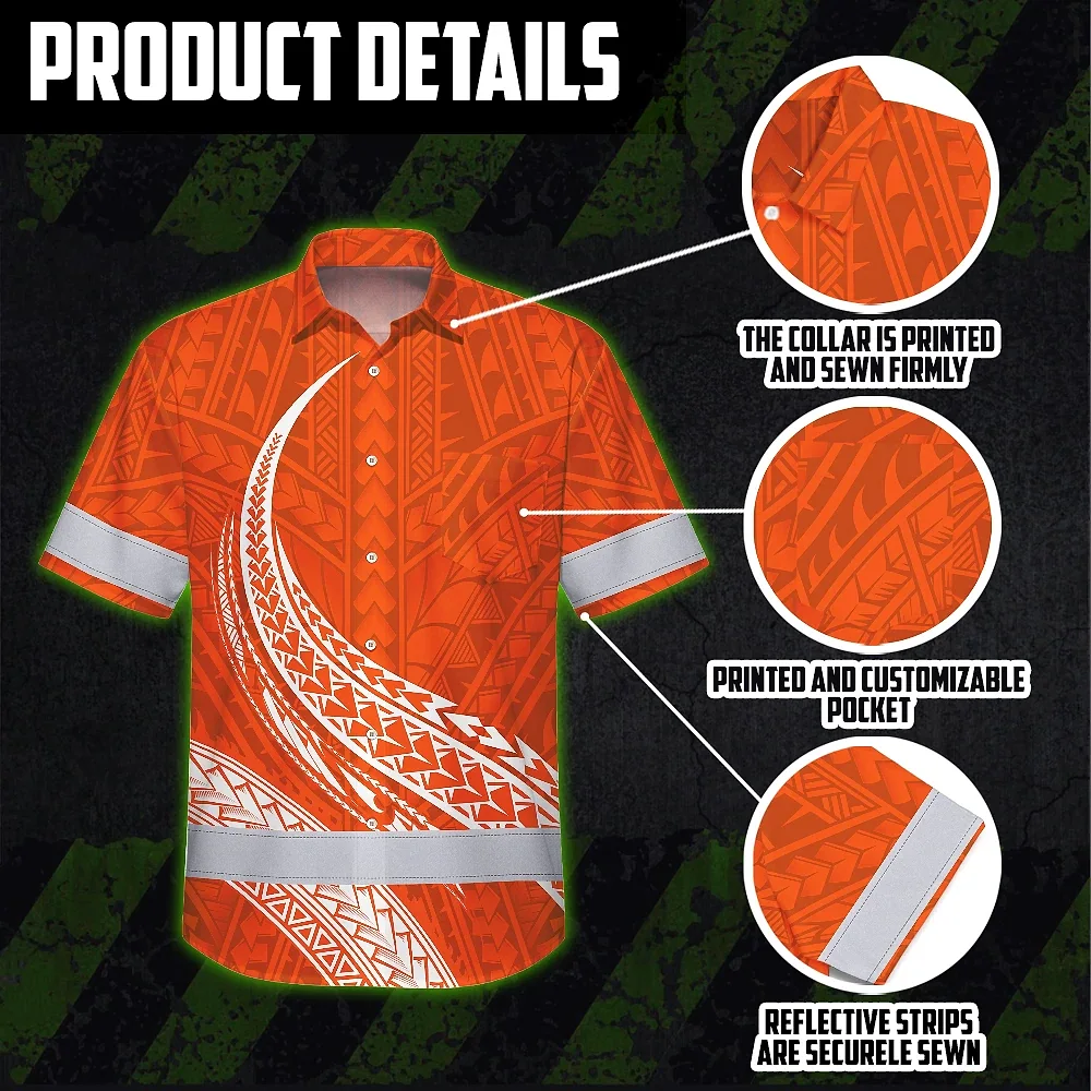 Hi Vis Hawaiian Shirt Reflective Tapes Orange White Polynesian Custom Name Safety Workwear For Workers, Truckers, Operators