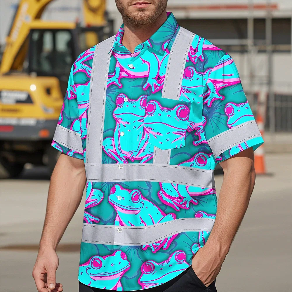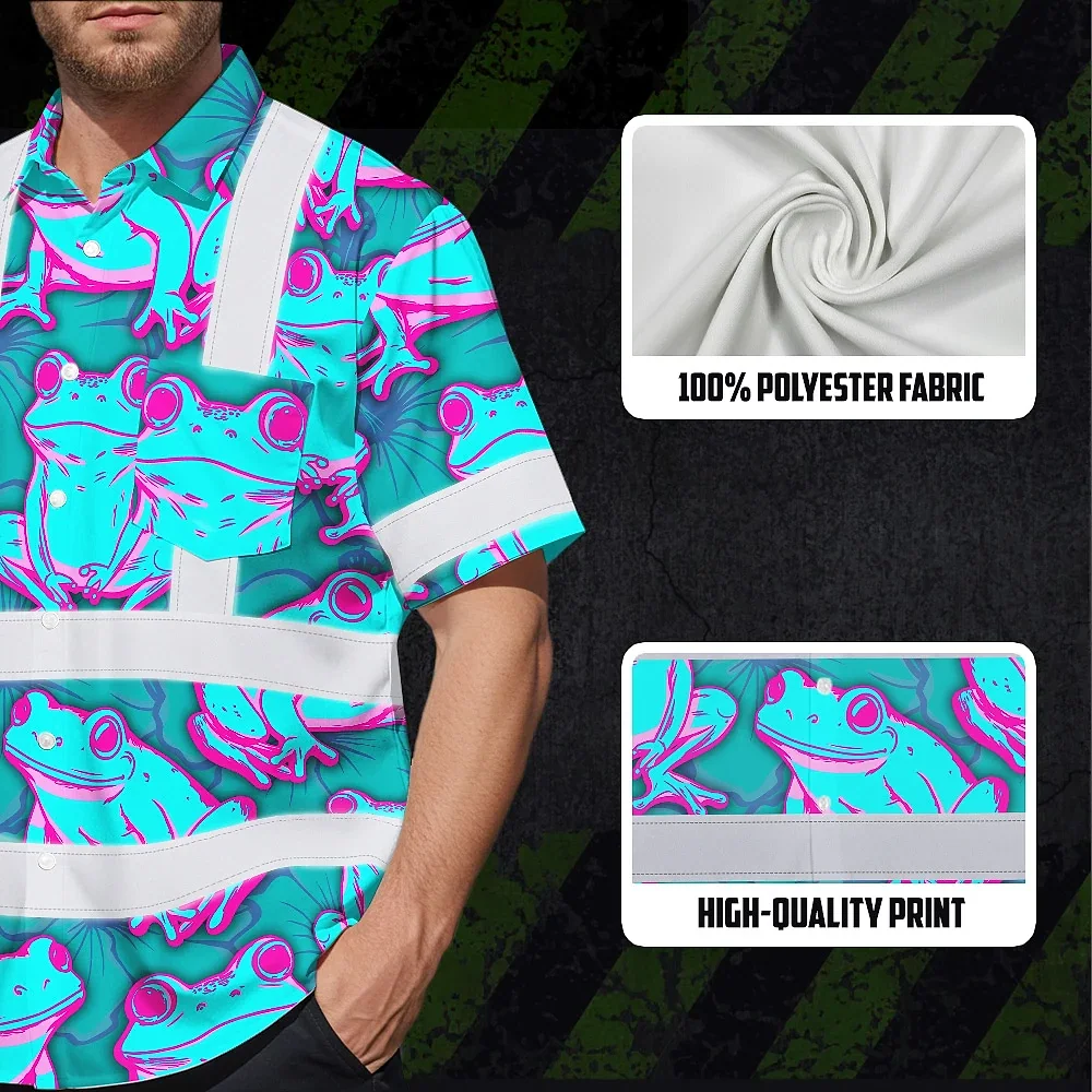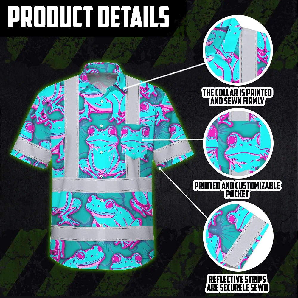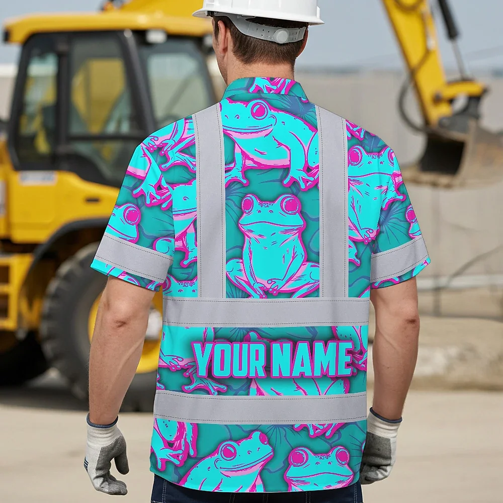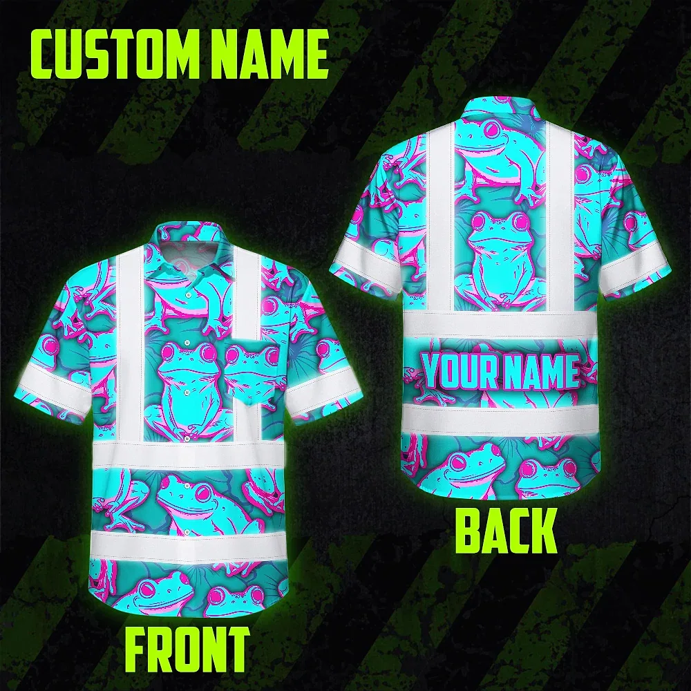 Hi Vis Hawaiian Shirt Reflective Tapes Pink And Blue Neon Frog Custom Name Safety Workwear For Workers, Truckers, Operators