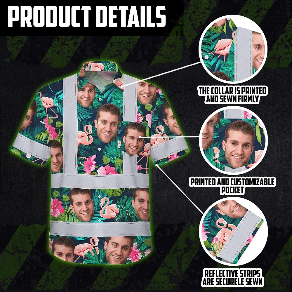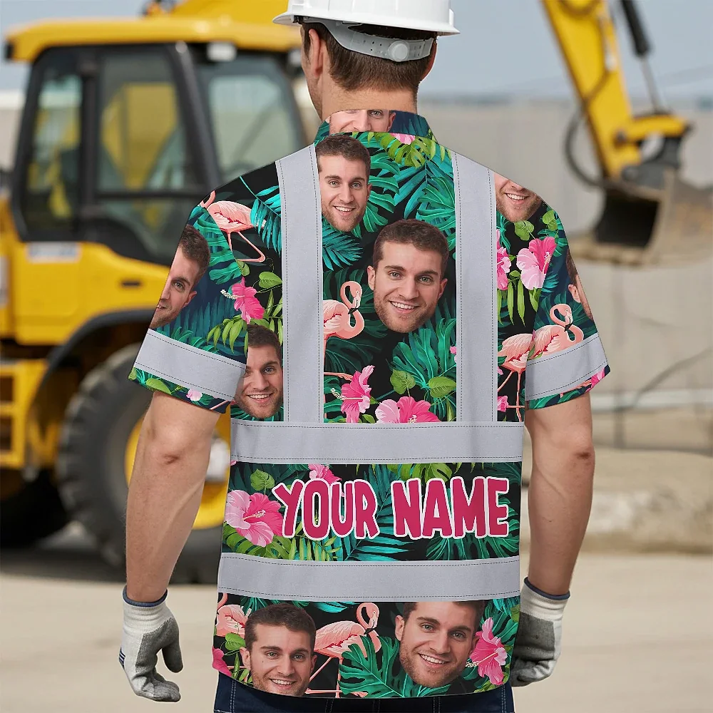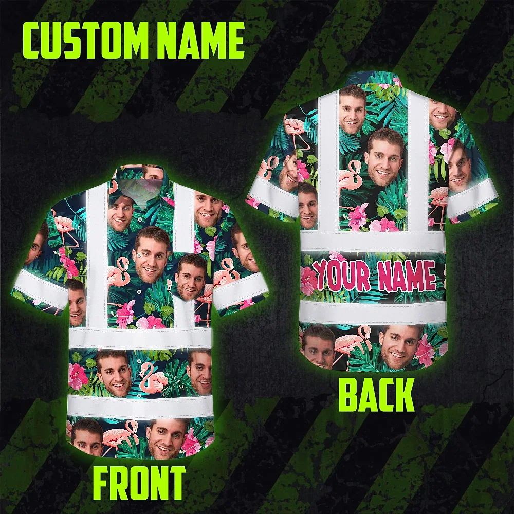 Hi Vis Hawaiian Shirt Reflective Tapes Pink And Green 2 Custom Name And Photo Safety Workwear For Workers, Truckers, Operators