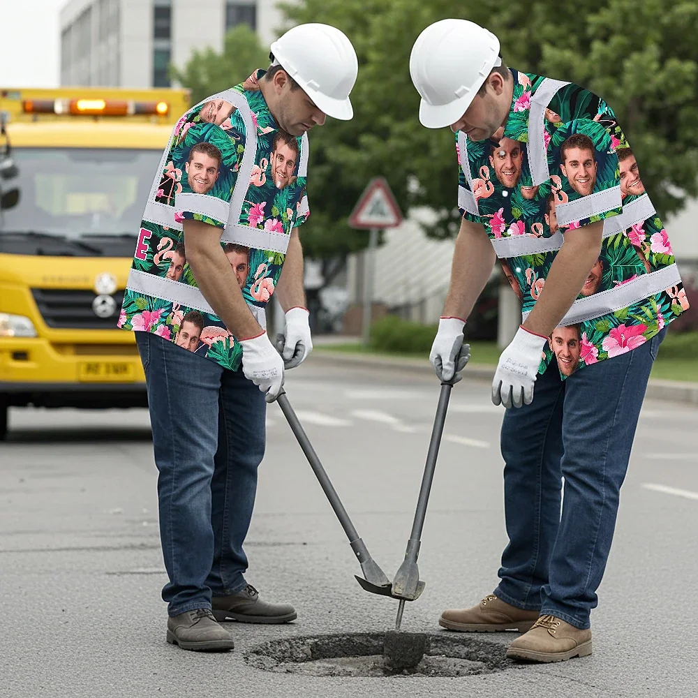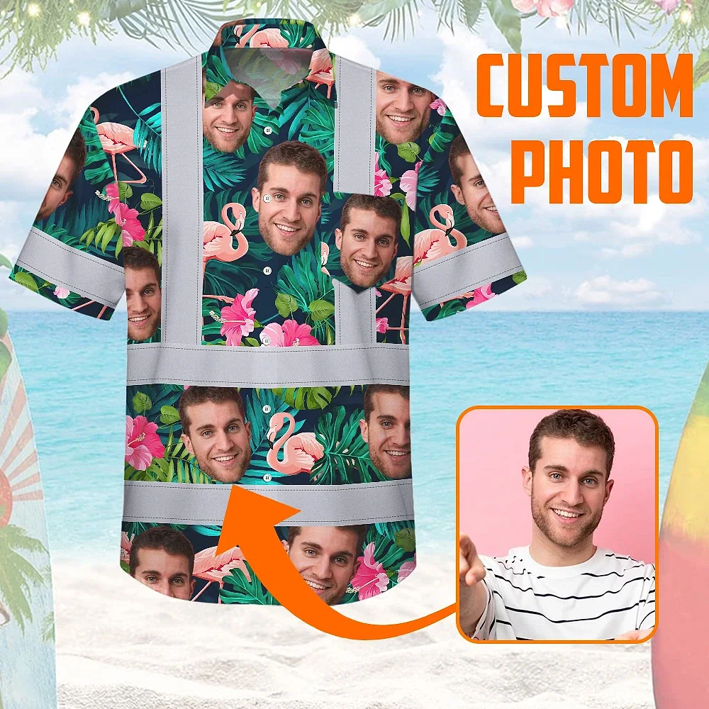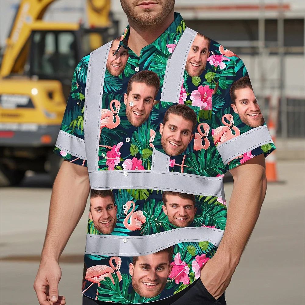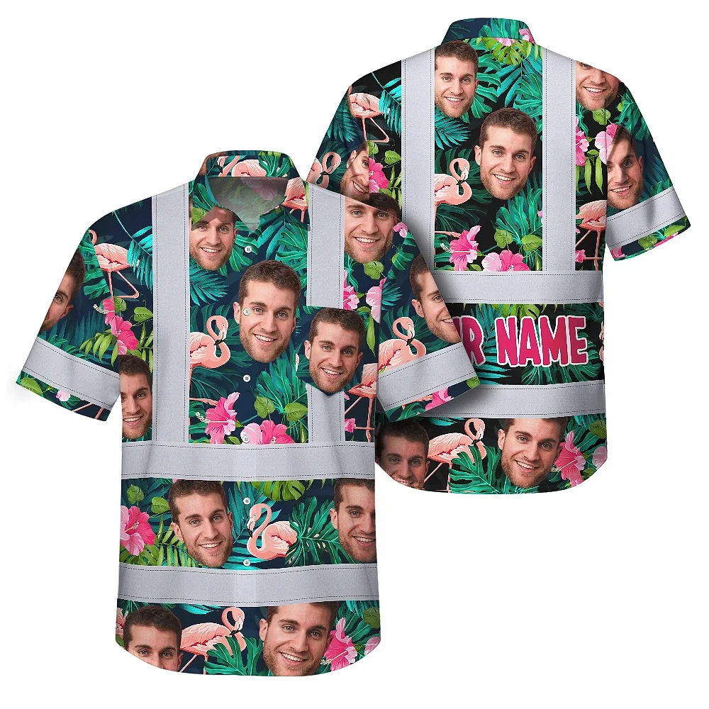 Hi Vis Hawaiian Shirt Reflective Tapes Pink And Green 2 Custom Name And Photo Safety Workwear For Workers, Truckers, Operators