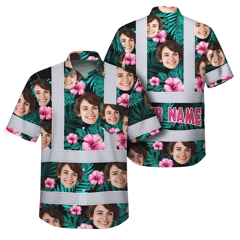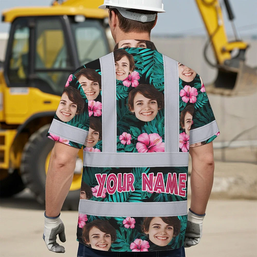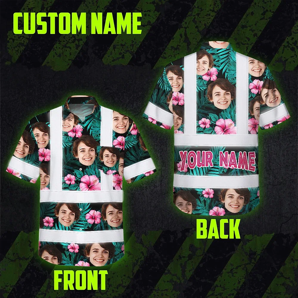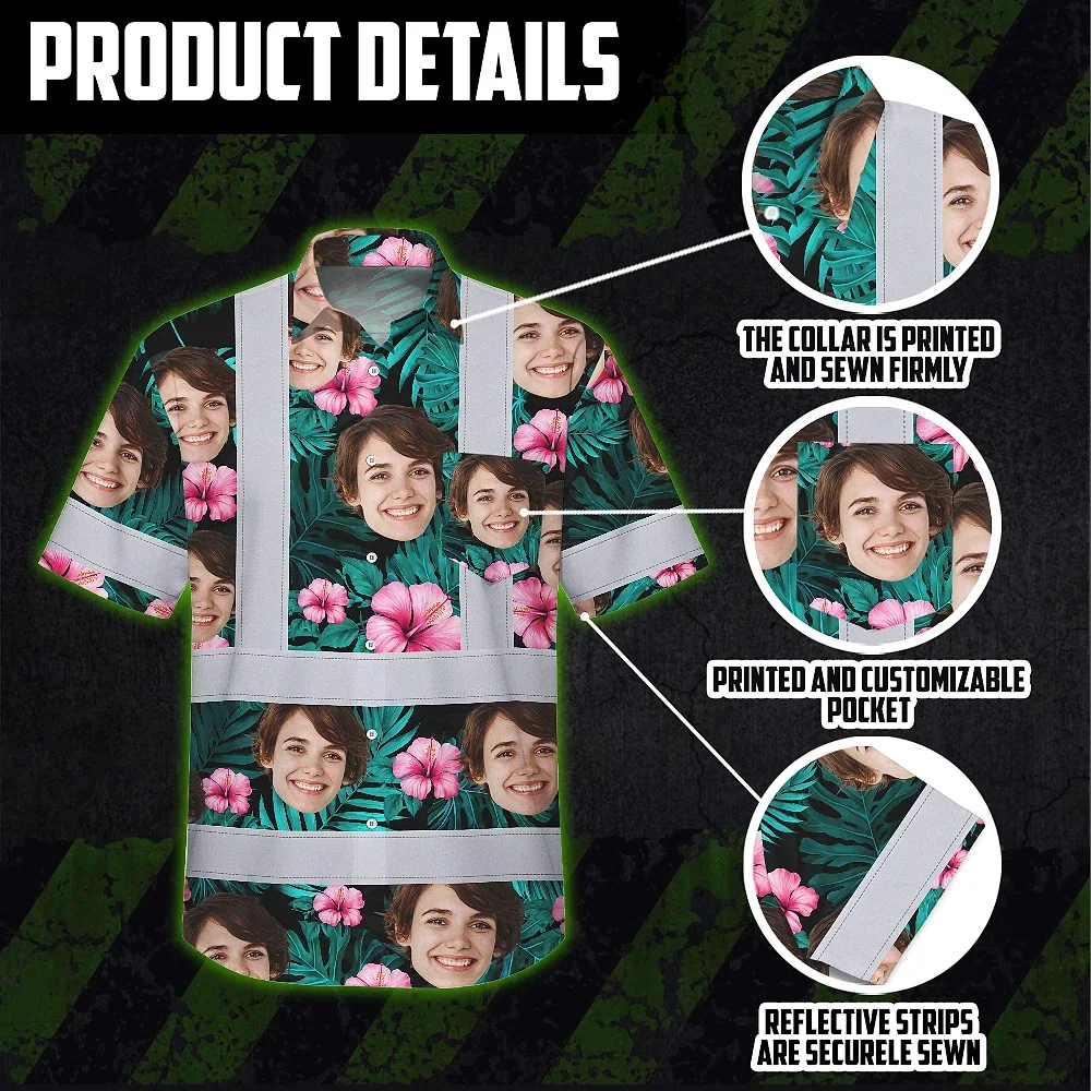 Hi Vis Hawaiian Shirt Reflective Tapes Pink And Green Custom Name And Photo Safety Workwear For Workers, Truckers, Operators