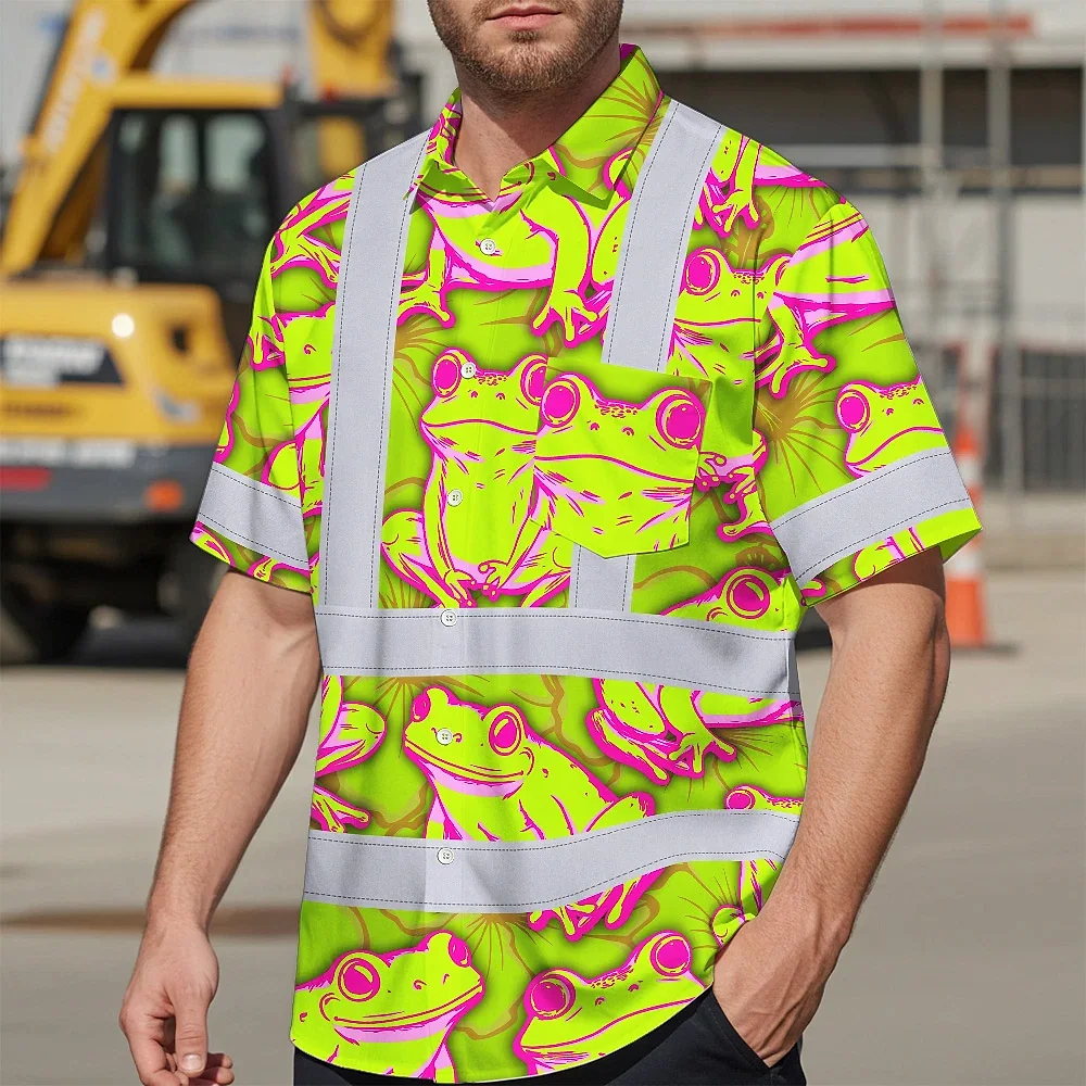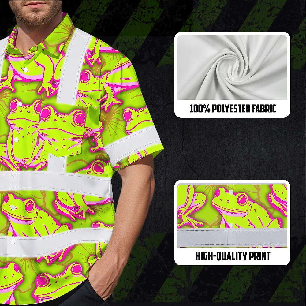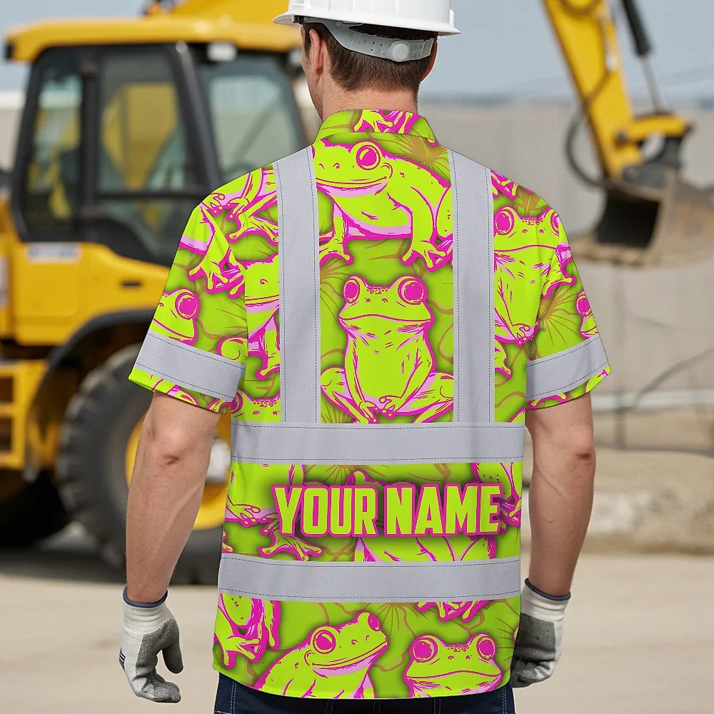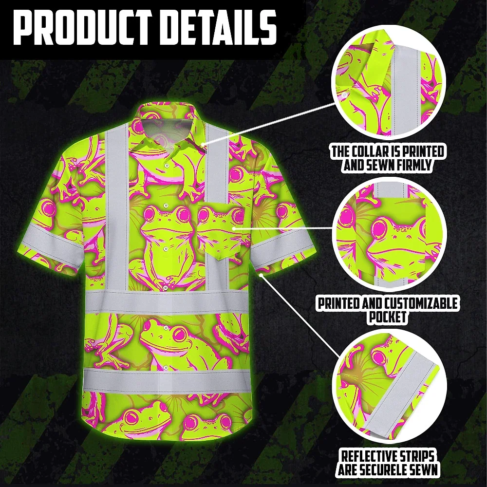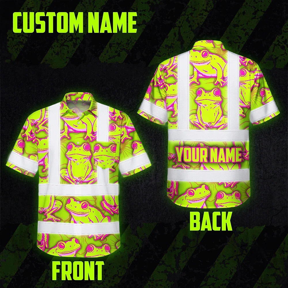 Hi Vis Hawaiian Shirt Reflective Tapes Pink And Lime Neon Frog Custom Name Safety Workwear For Workers, Truckers, Operators