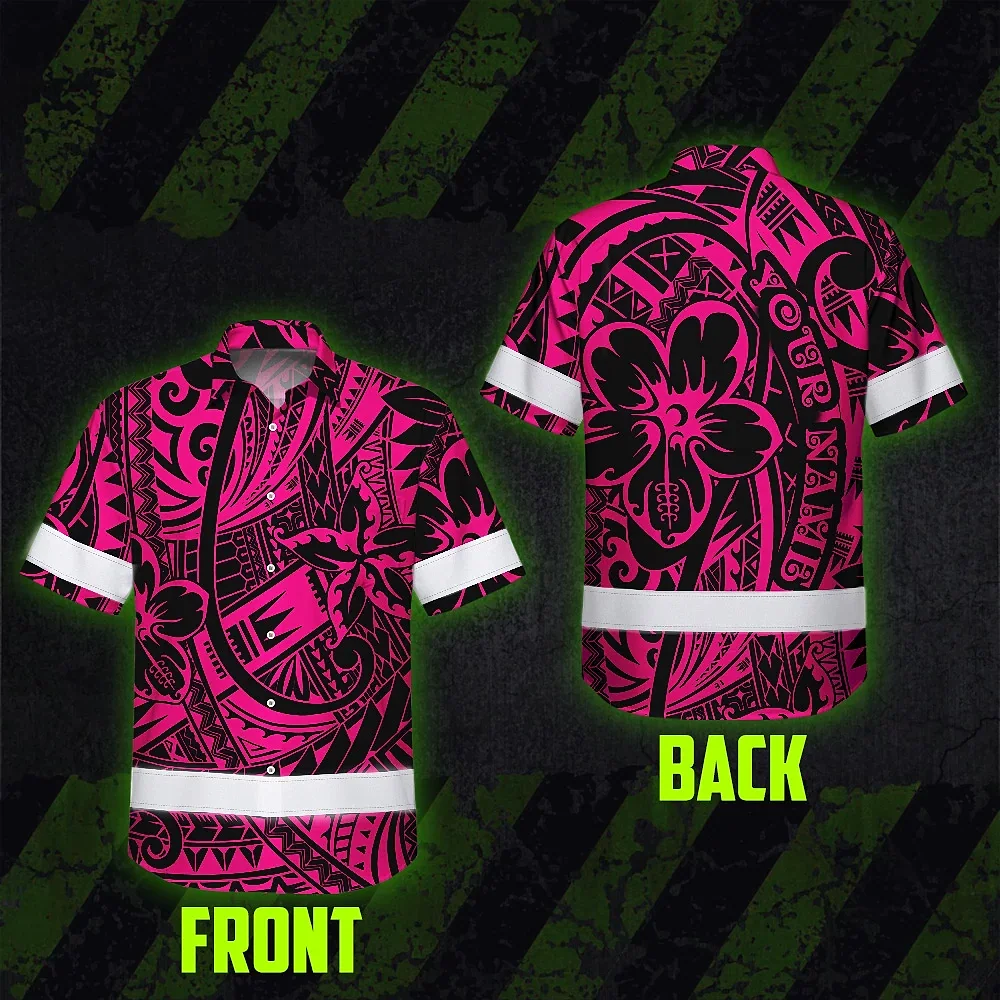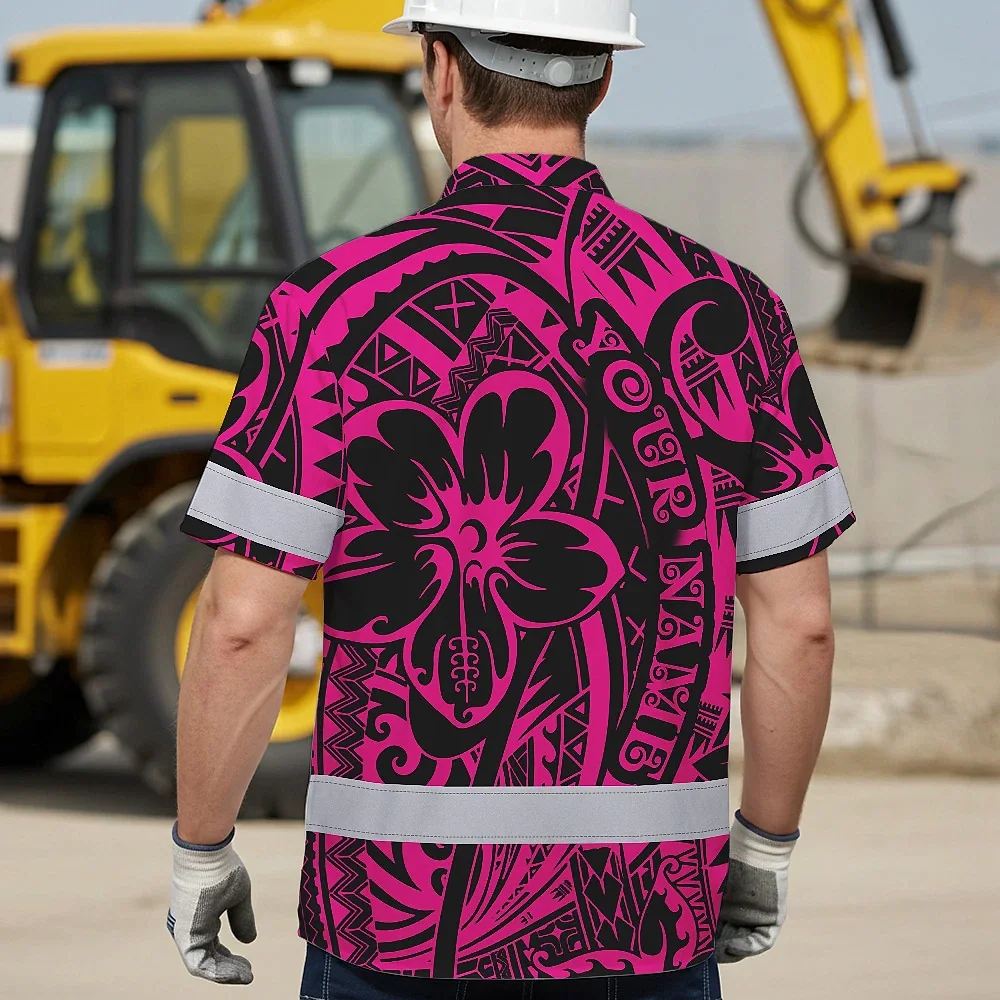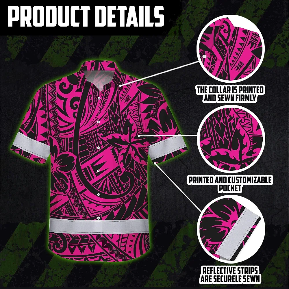 Hi Vis Hawaiian Shirt Reflective Tapes Pink Flower Hawaiian Polynesian Tribal Custom Name Safety Workwear For Workers, Runners, Cyclists