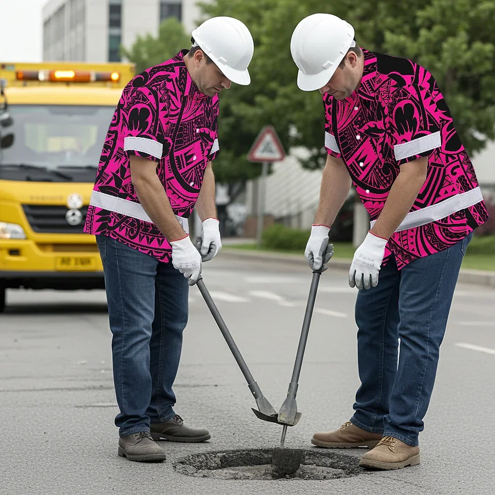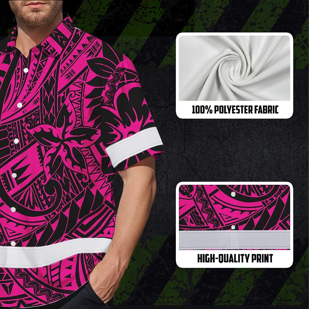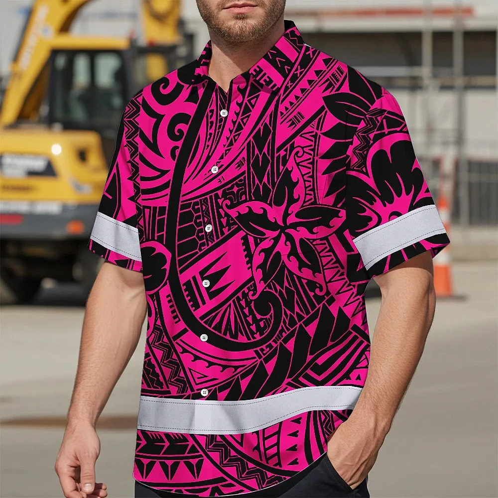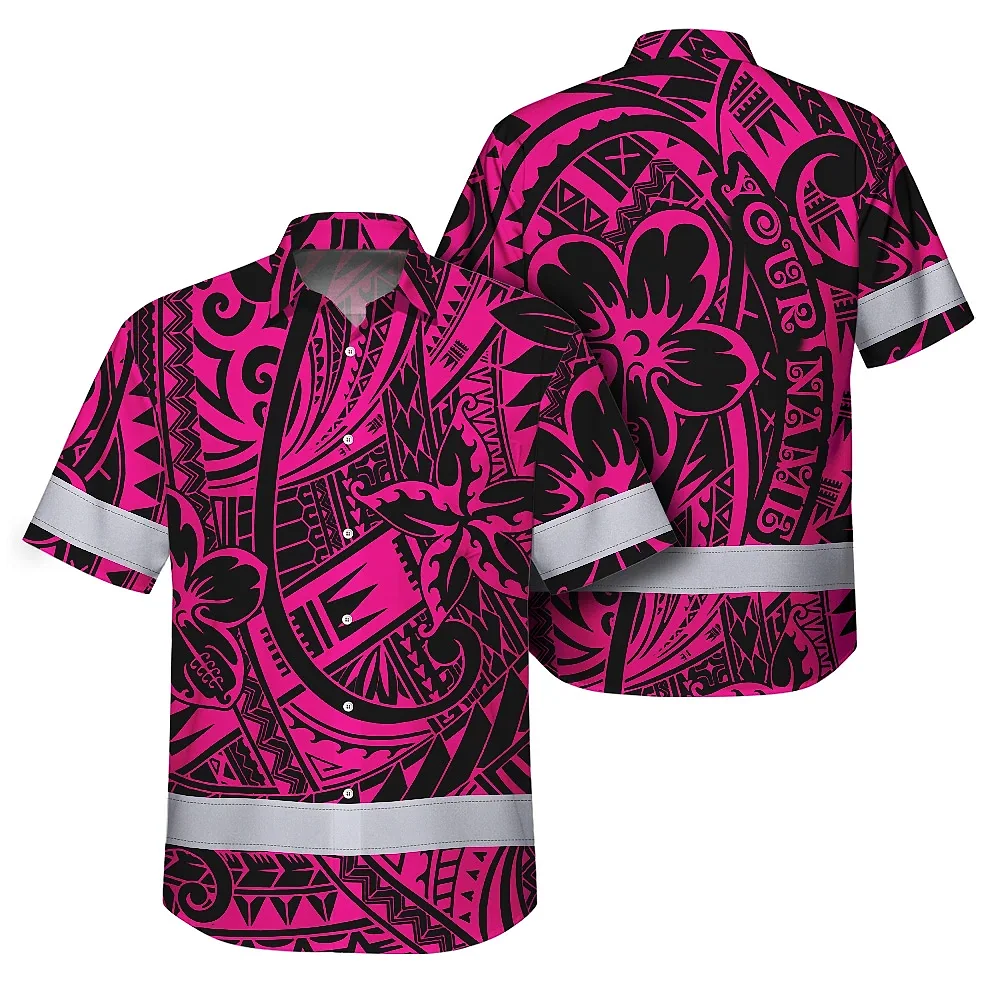 Hi Vis Hawaiian Shirt Reflective Tapes Pink Flower Hawaiian Polynesian Tribal Custom Name Safety Workwear For Workers, Runners, Cyclists