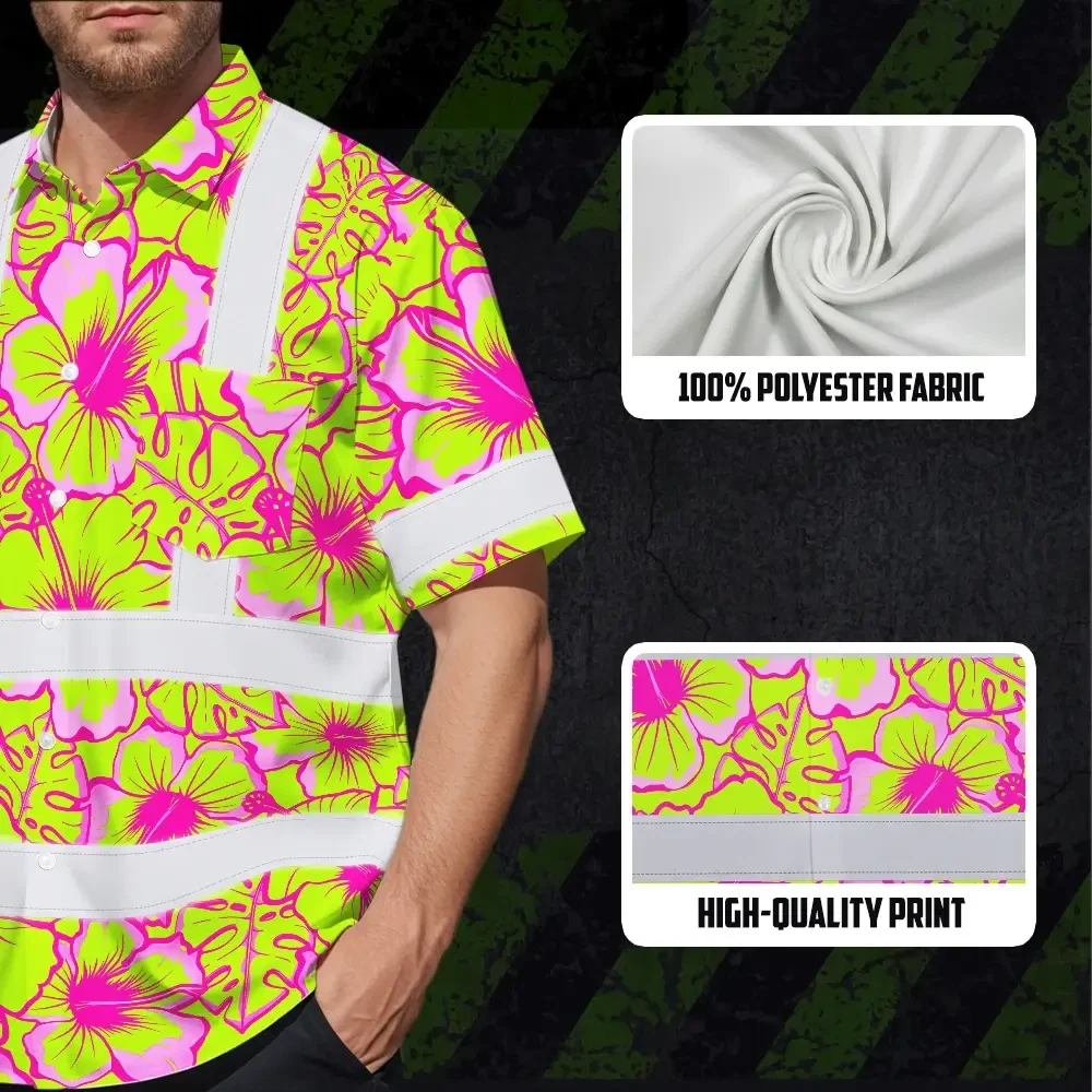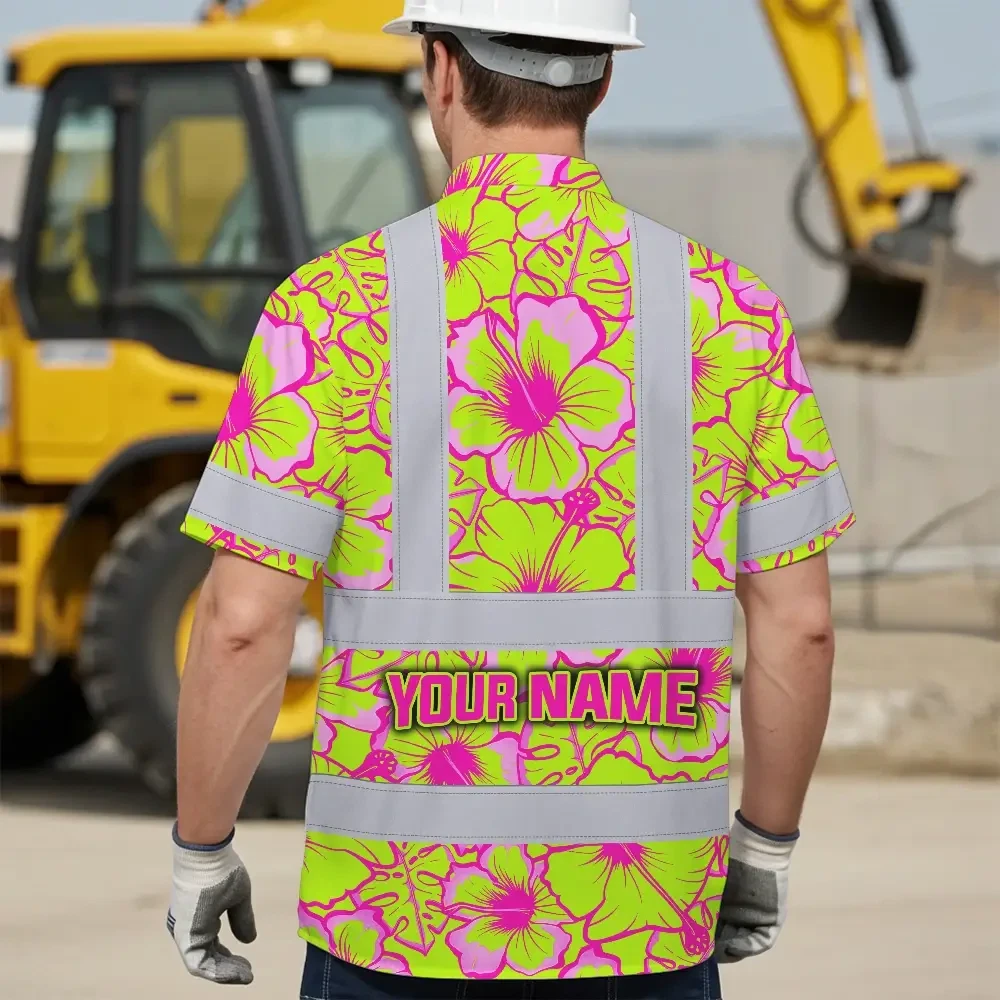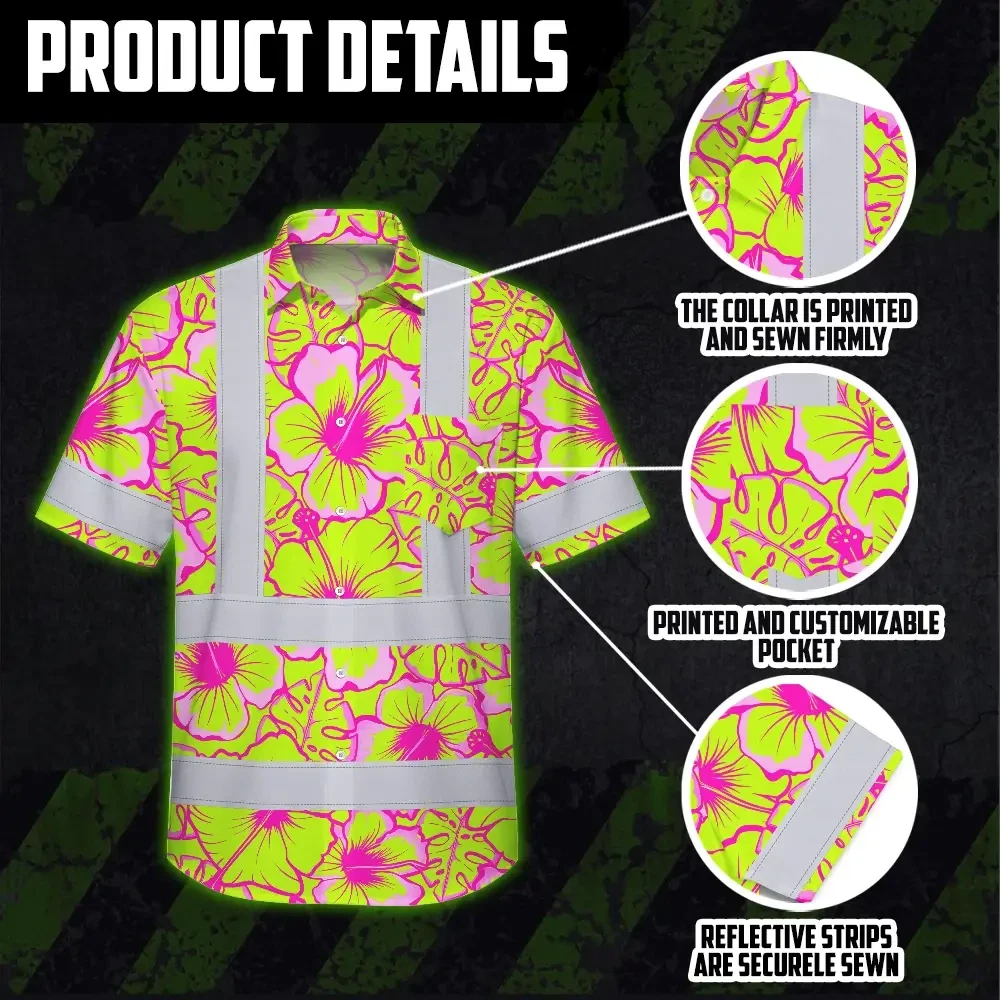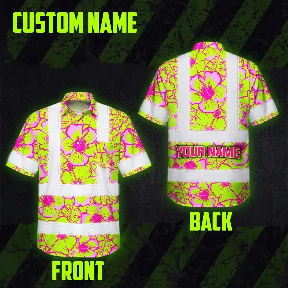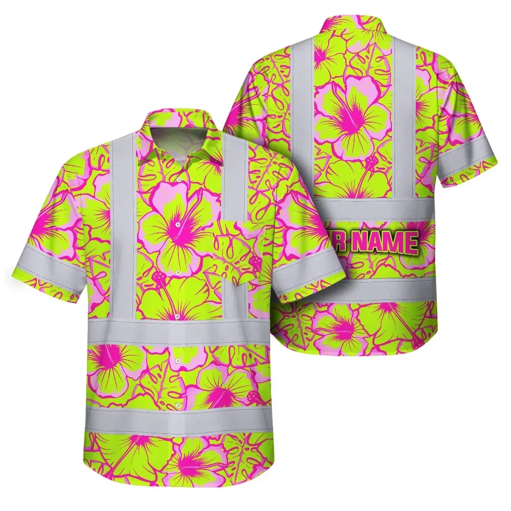 Hi Vis Hawaiian Shirt Reflective Tapes Pink Neon And Lime Flowers Custom Name Safety Workwear For Workers, Truckers, Operators