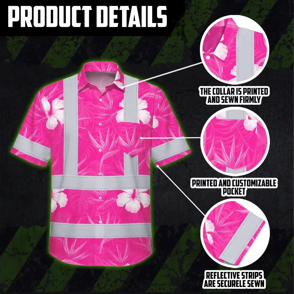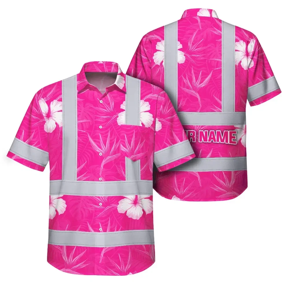 Hi Vis Hawaiian Shirt Reflective Tapes Pink Neon Flowers Custom Name Safety Workwear For Workers, Truckers, Operators