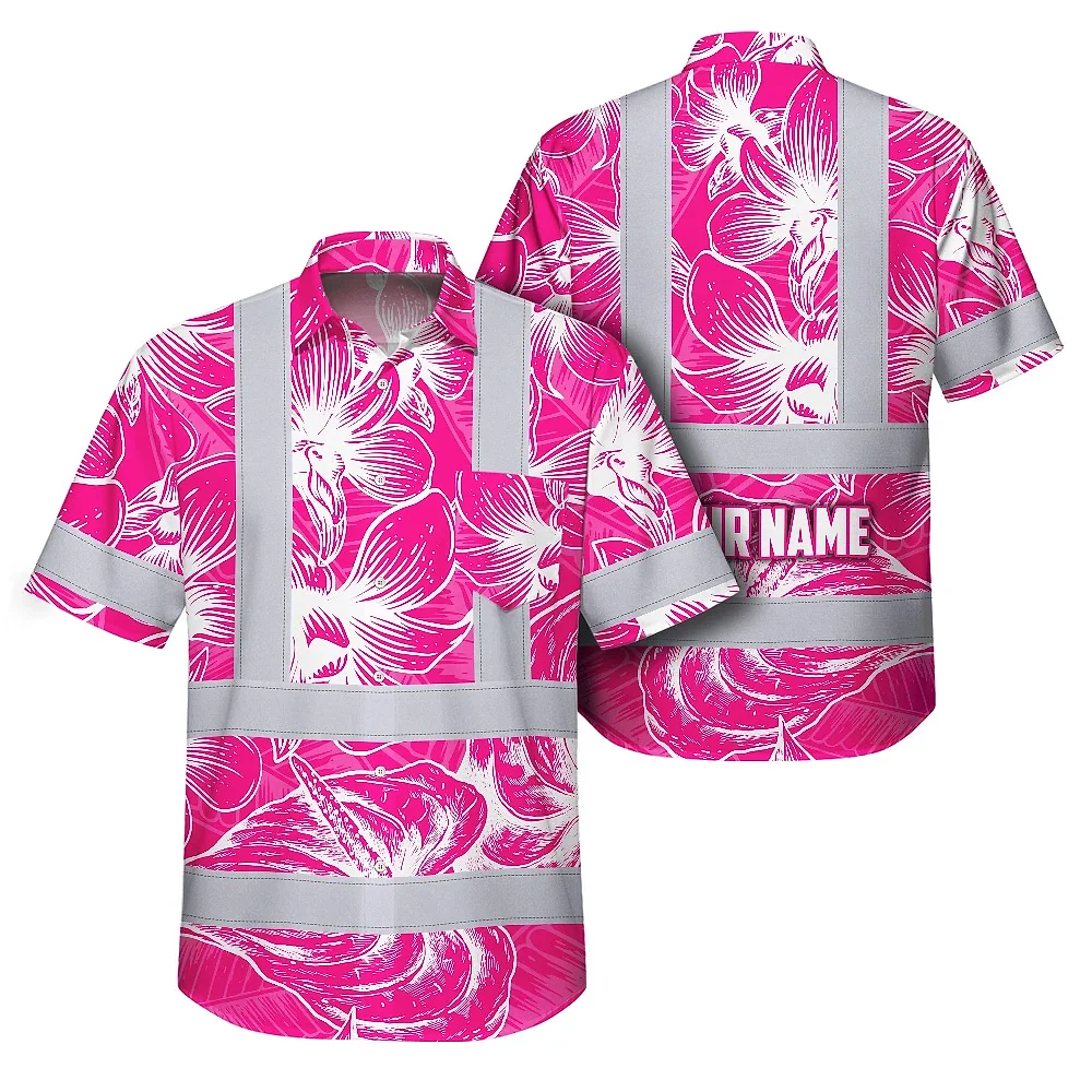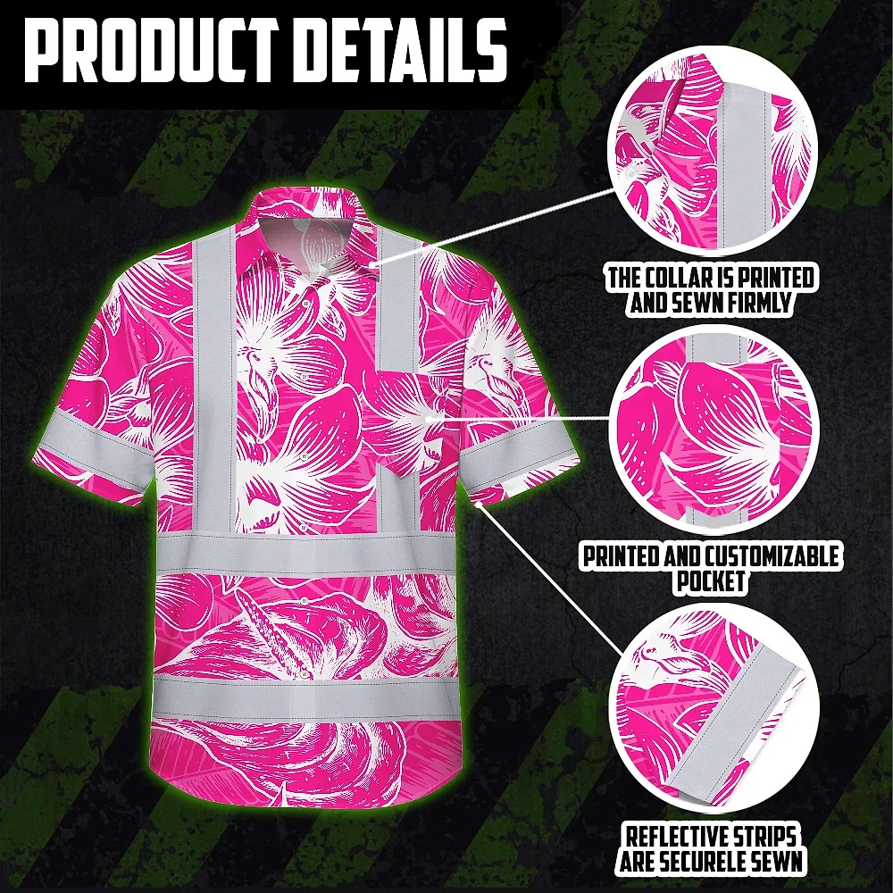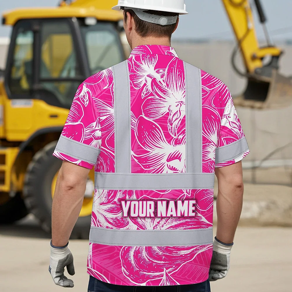 Hi Vis Hawaiian Shirt Reflective Tapes Pink Neon Flowers Custom Name Safety Workwear For Workers, Truckers, Operators