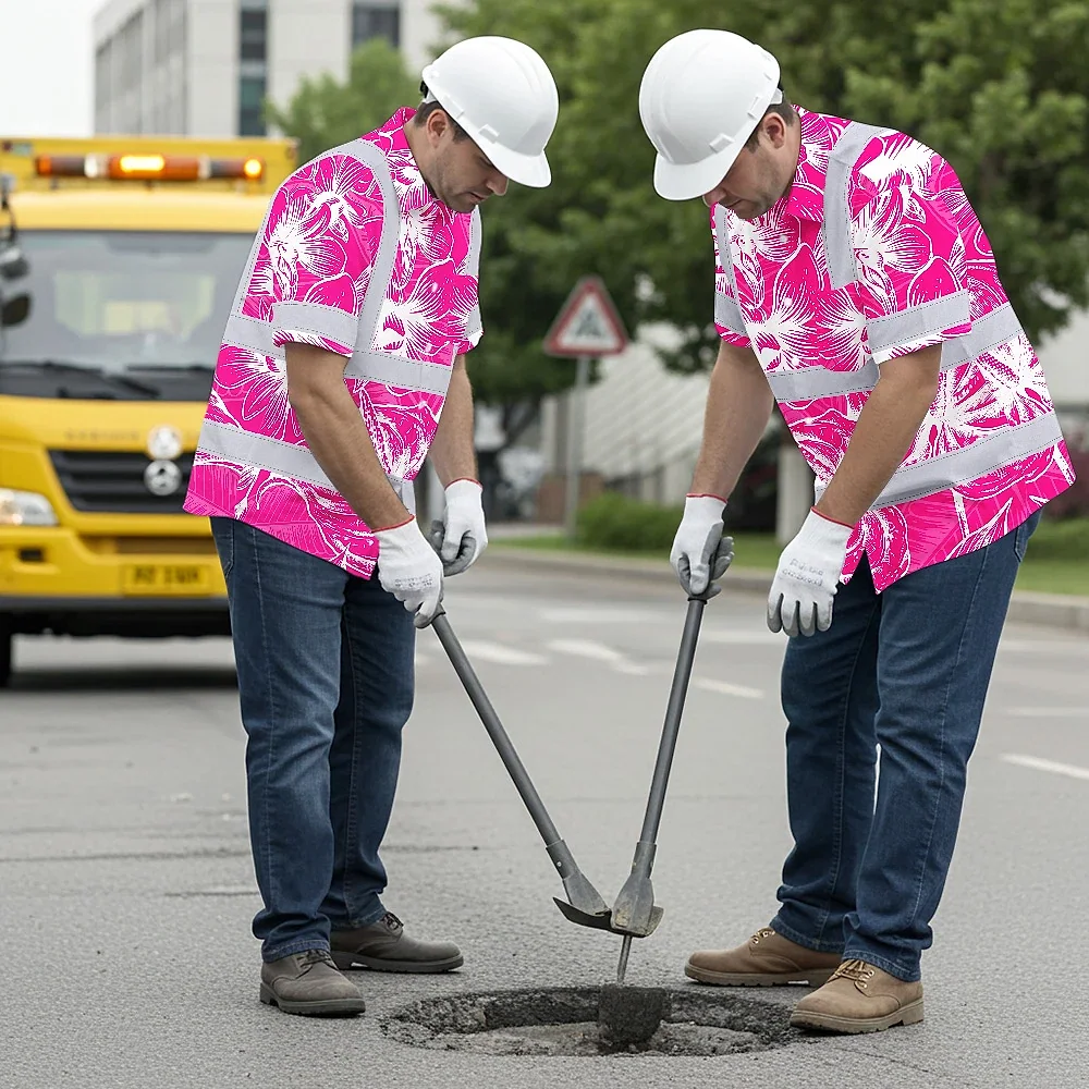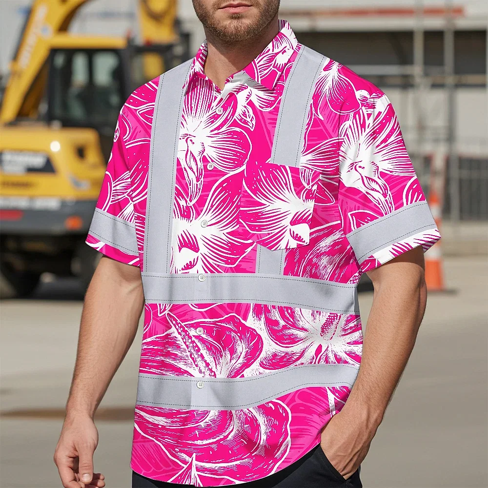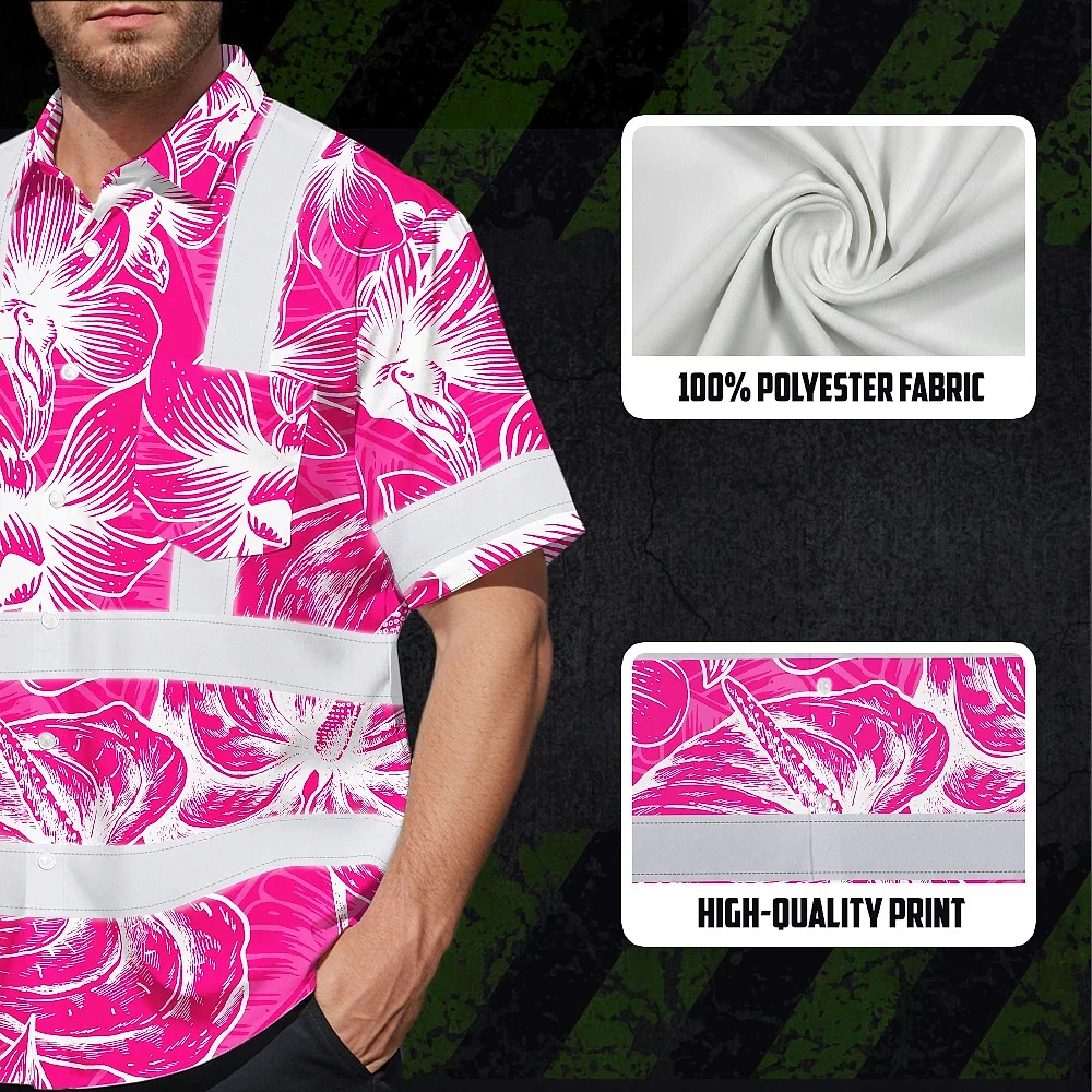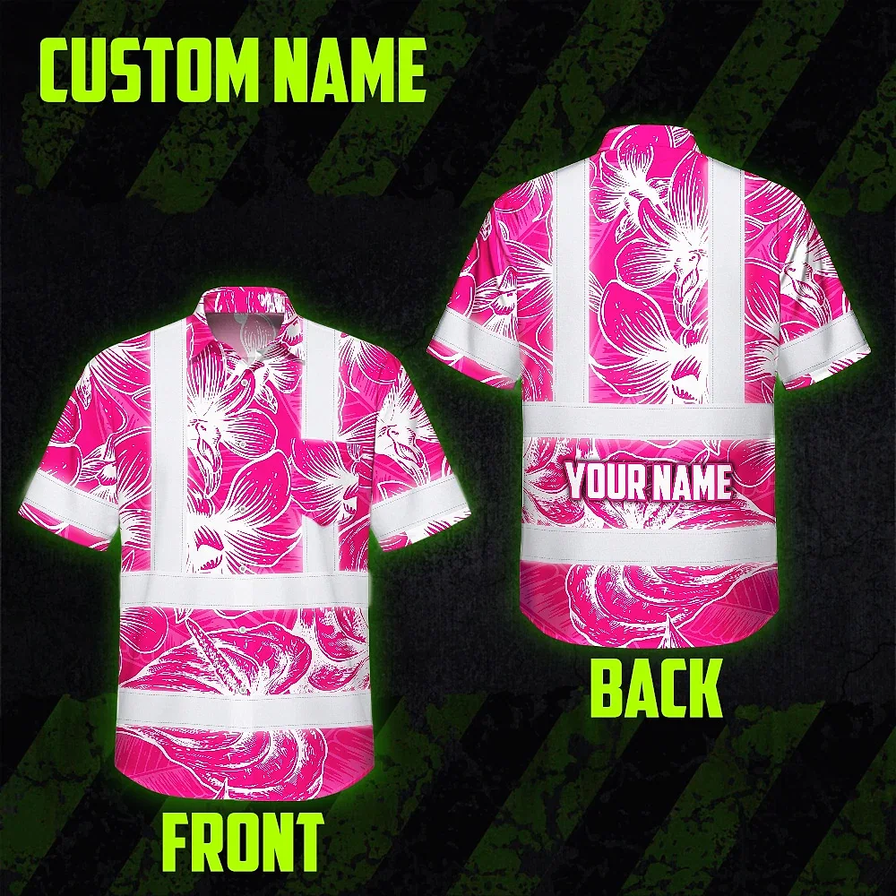 Hi Vis Hawaiian Shirt Reflective Tapes Pink Neon Flowers Custom Name Safety Workwear For Workers, Truckers, Operators