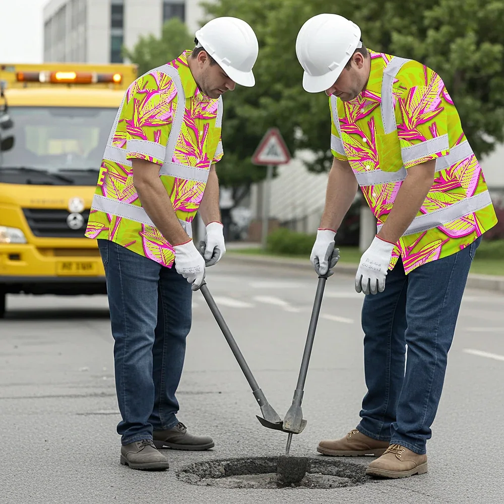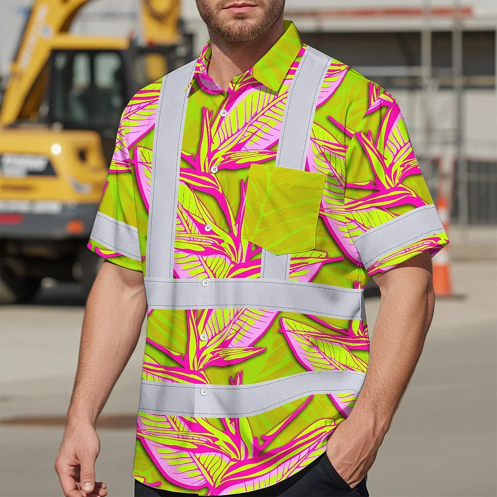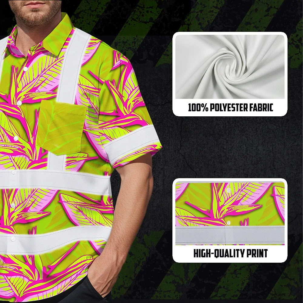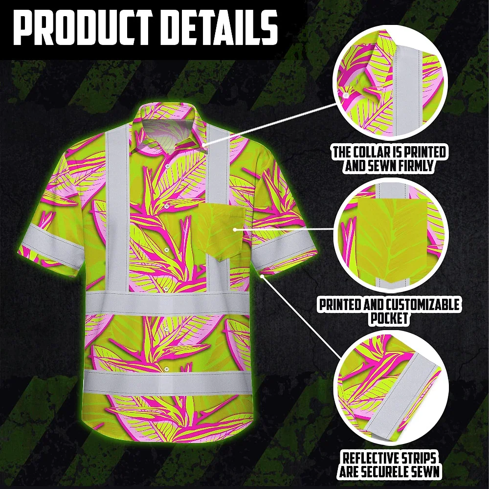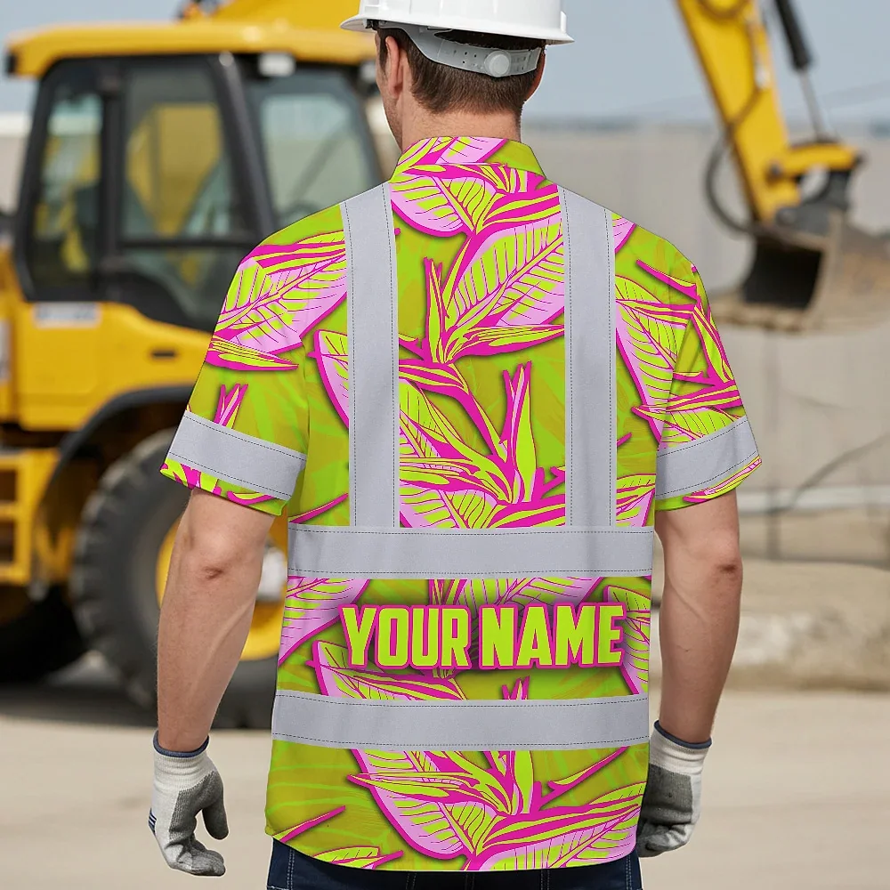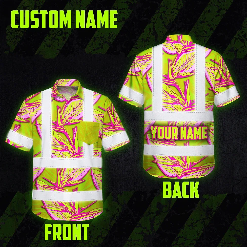 Hi Vis Hawaiian Shirt Reflective Tapes Pink Neon Lime Bird of Paradise Custom Name Safety Workwear For Workers, Truckers, Operators