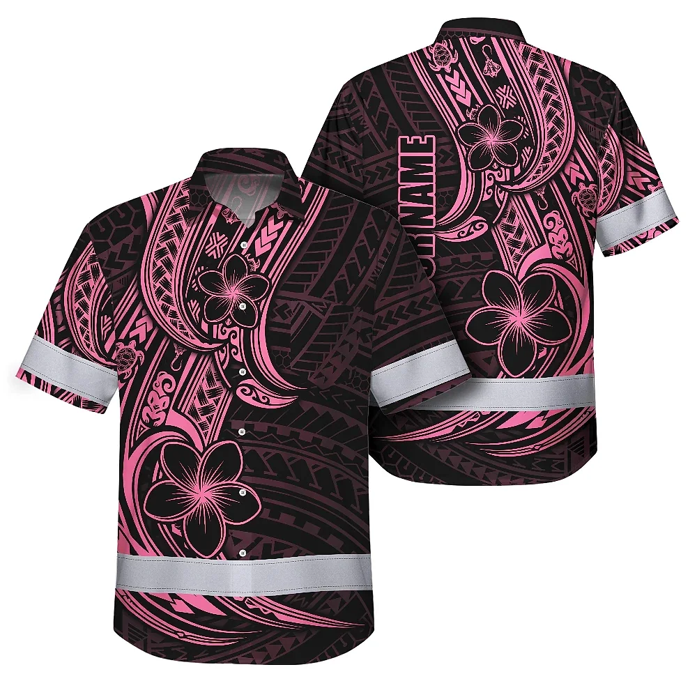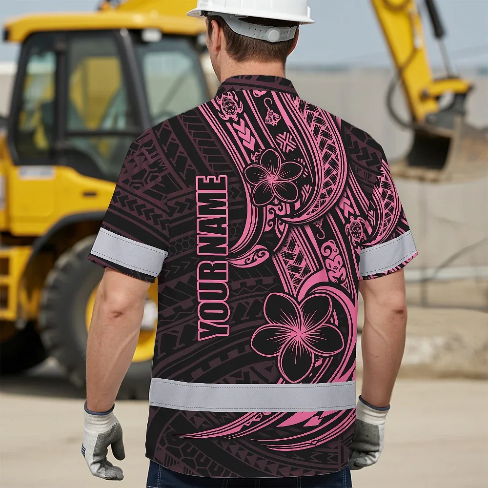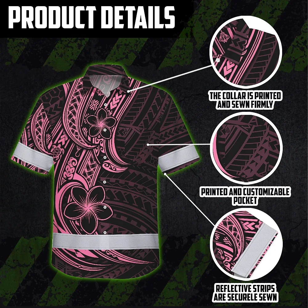 Hi Vis Hawaiian Shirt Reflective Tapes Pink Neon Polynesian And Flower Custom Name Safety Workwear For Workers, Truckers, Operators