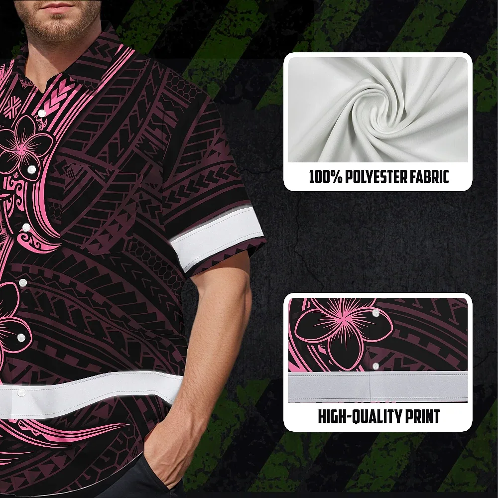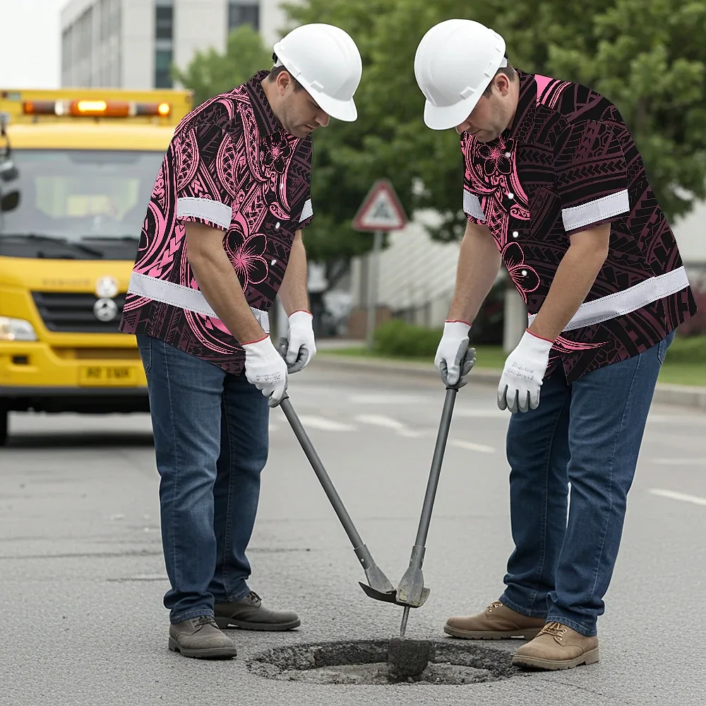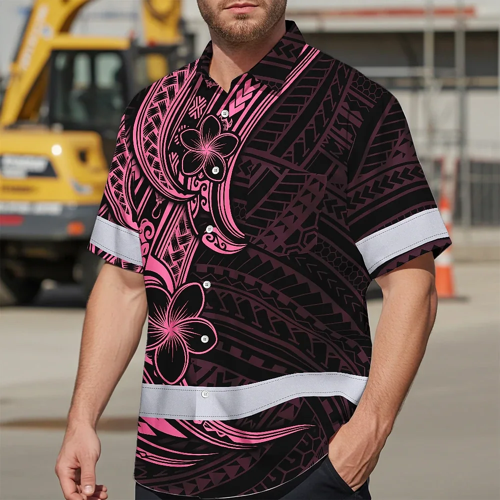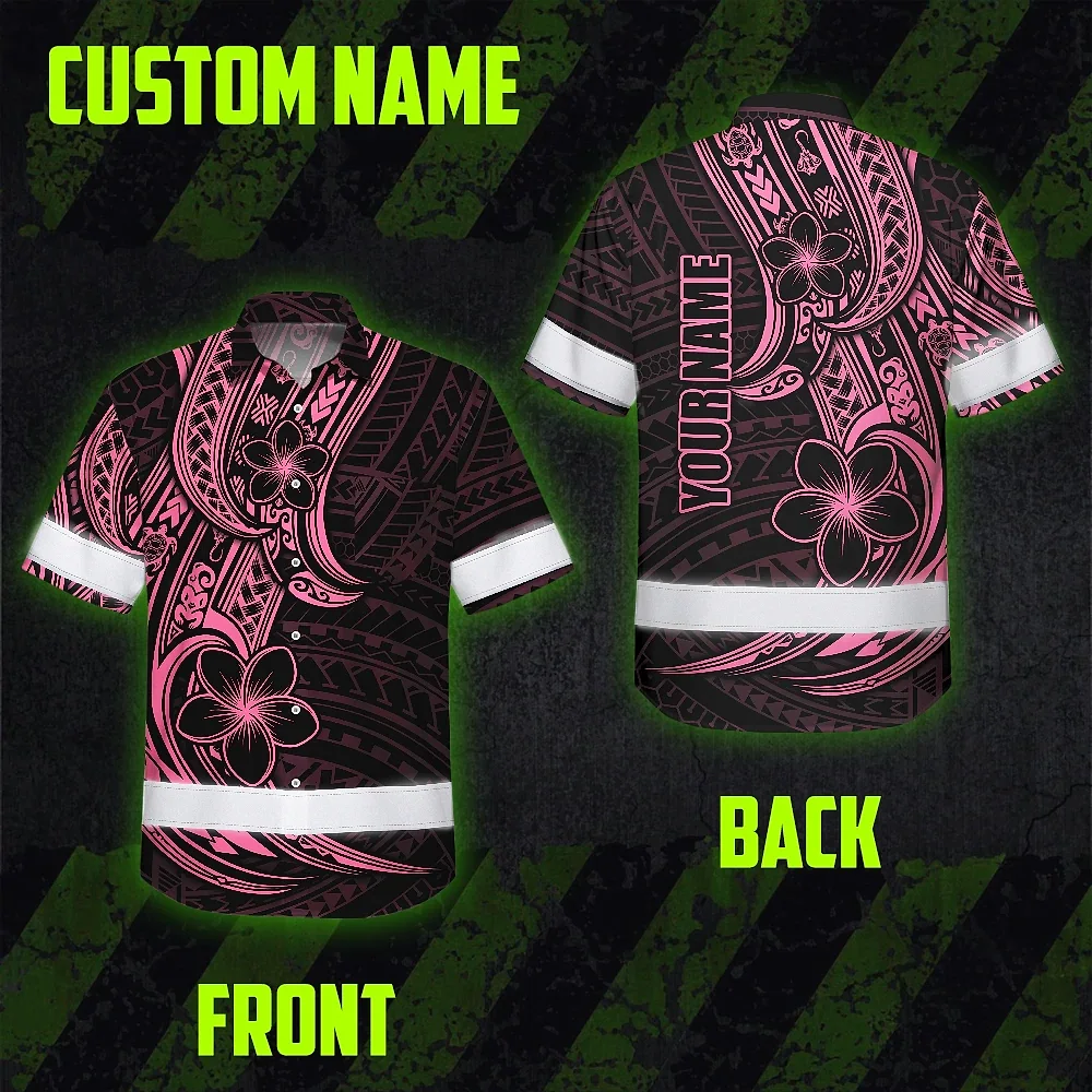 Hi Vis Hawaiian Shirt Reflective Tapes Pink Neon Polynesian And Flower Custom Name Safety Workwear For Workers, Truckers, Operators