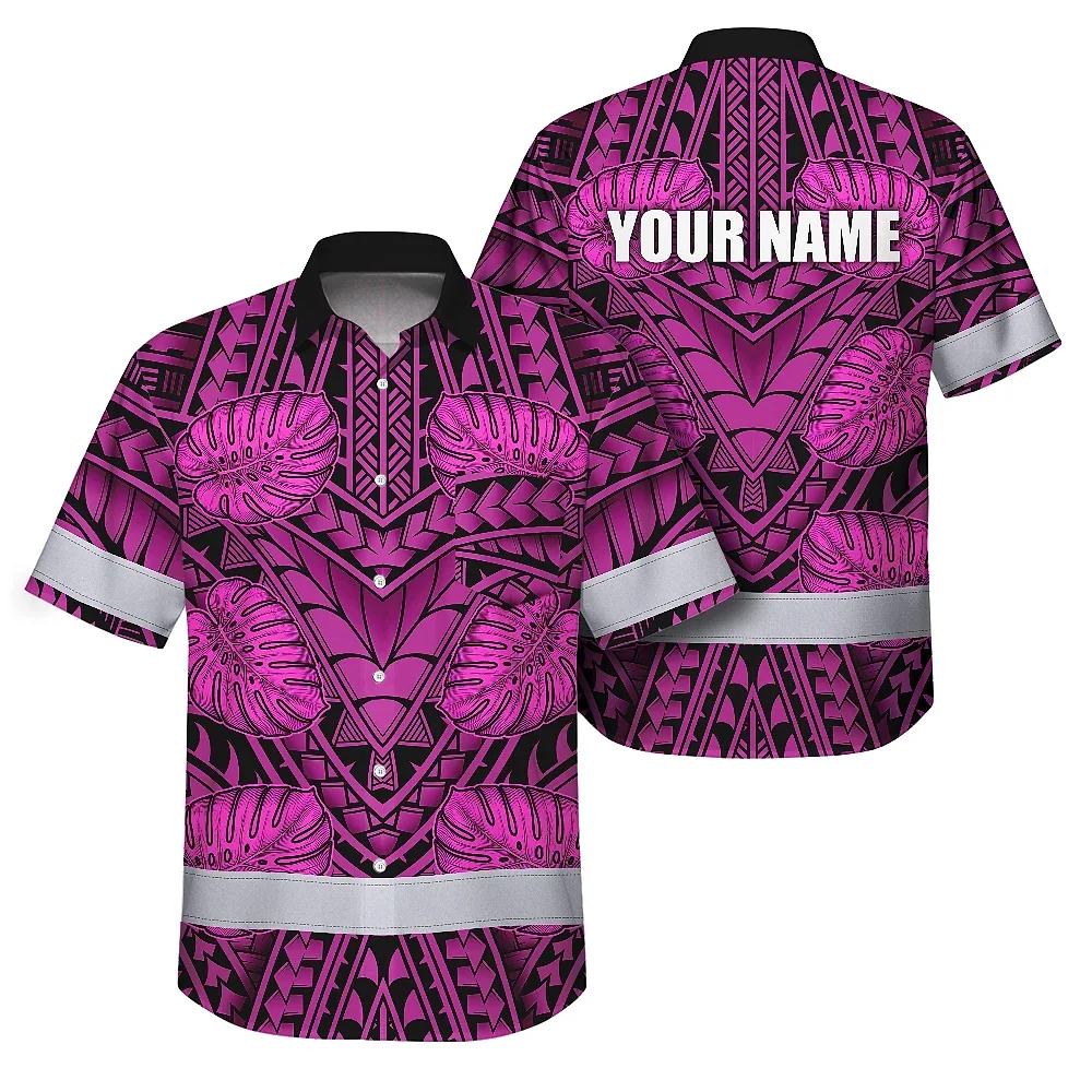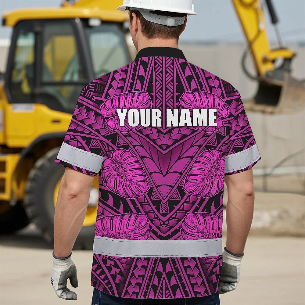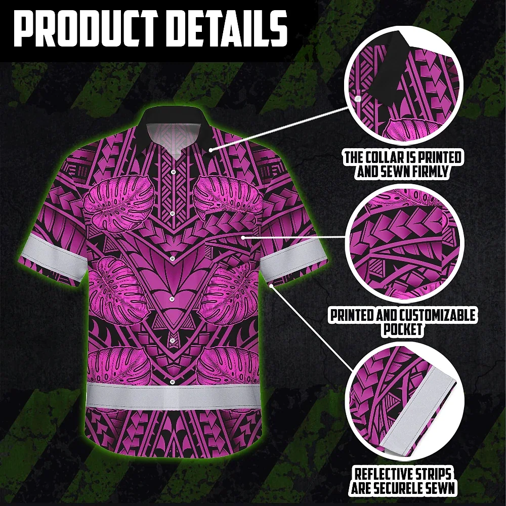 Hi Vis Hawaiian Shirt Reflective Tapes Pink Neon Polynesian Custom Name Safety Workwear For Workers, Truckers, Operators