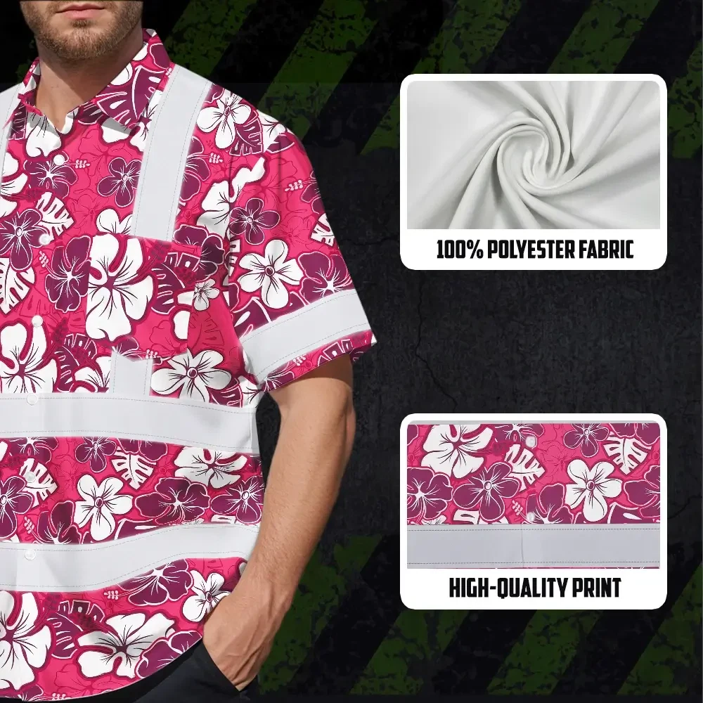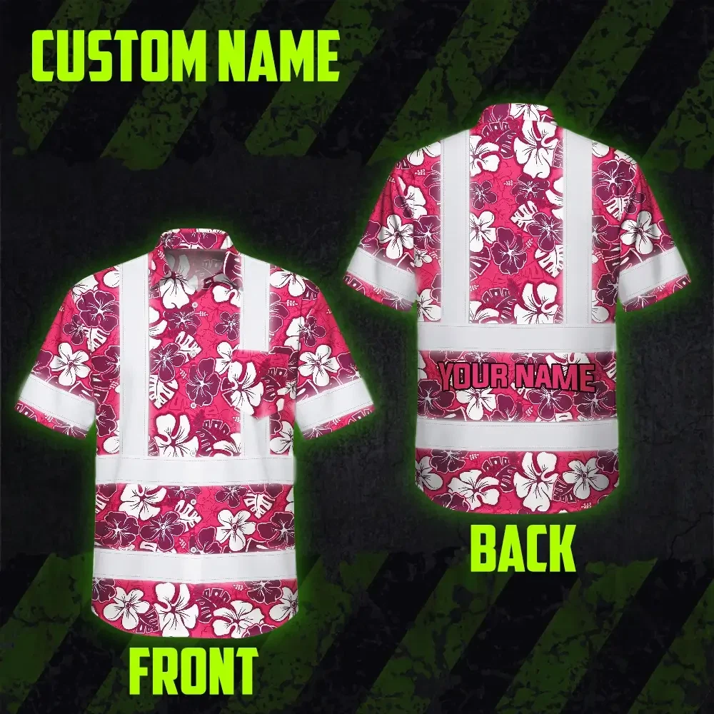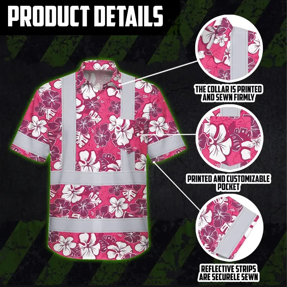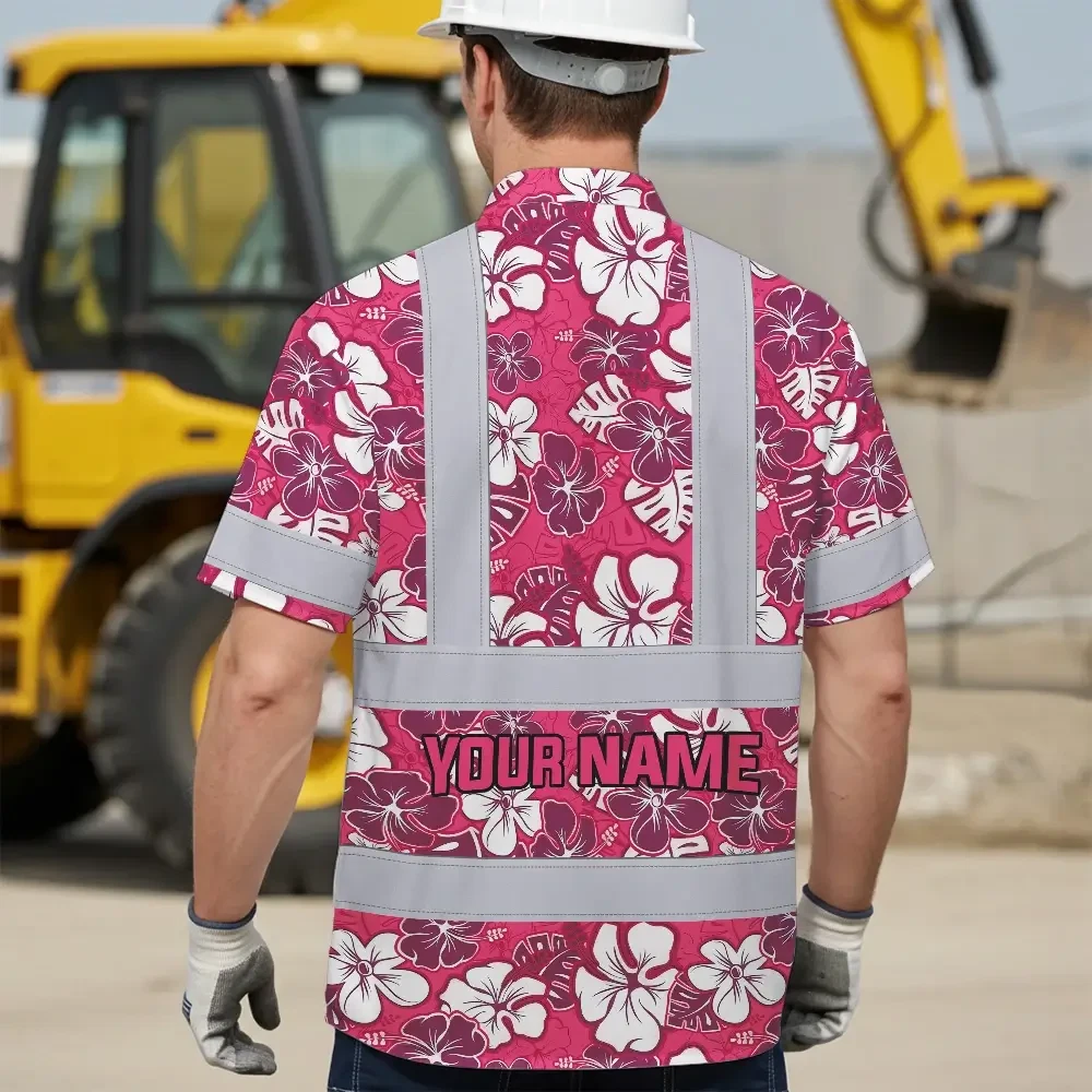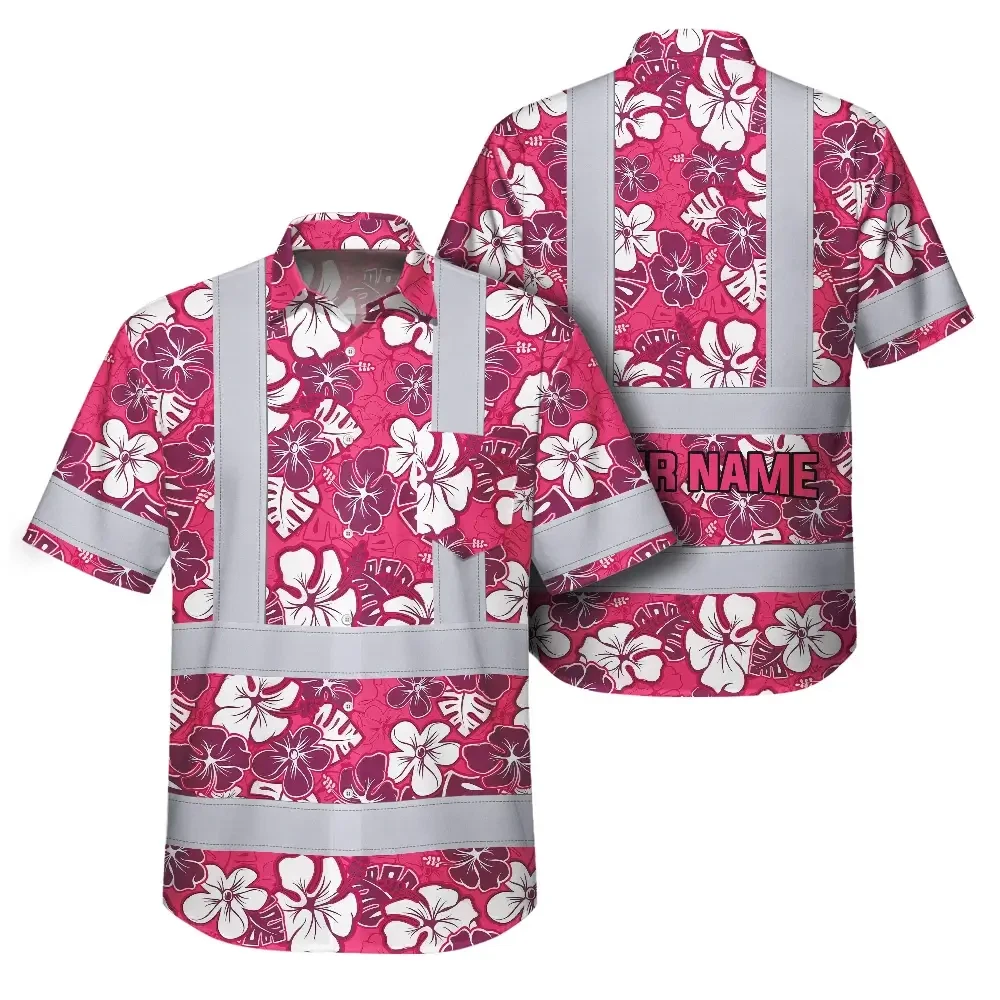 Hi Vis Hawaiian Shirt Reflective Tapes Pink Violet Flowers Custom Name Safety Workwear For Workers, Truckers, Operators