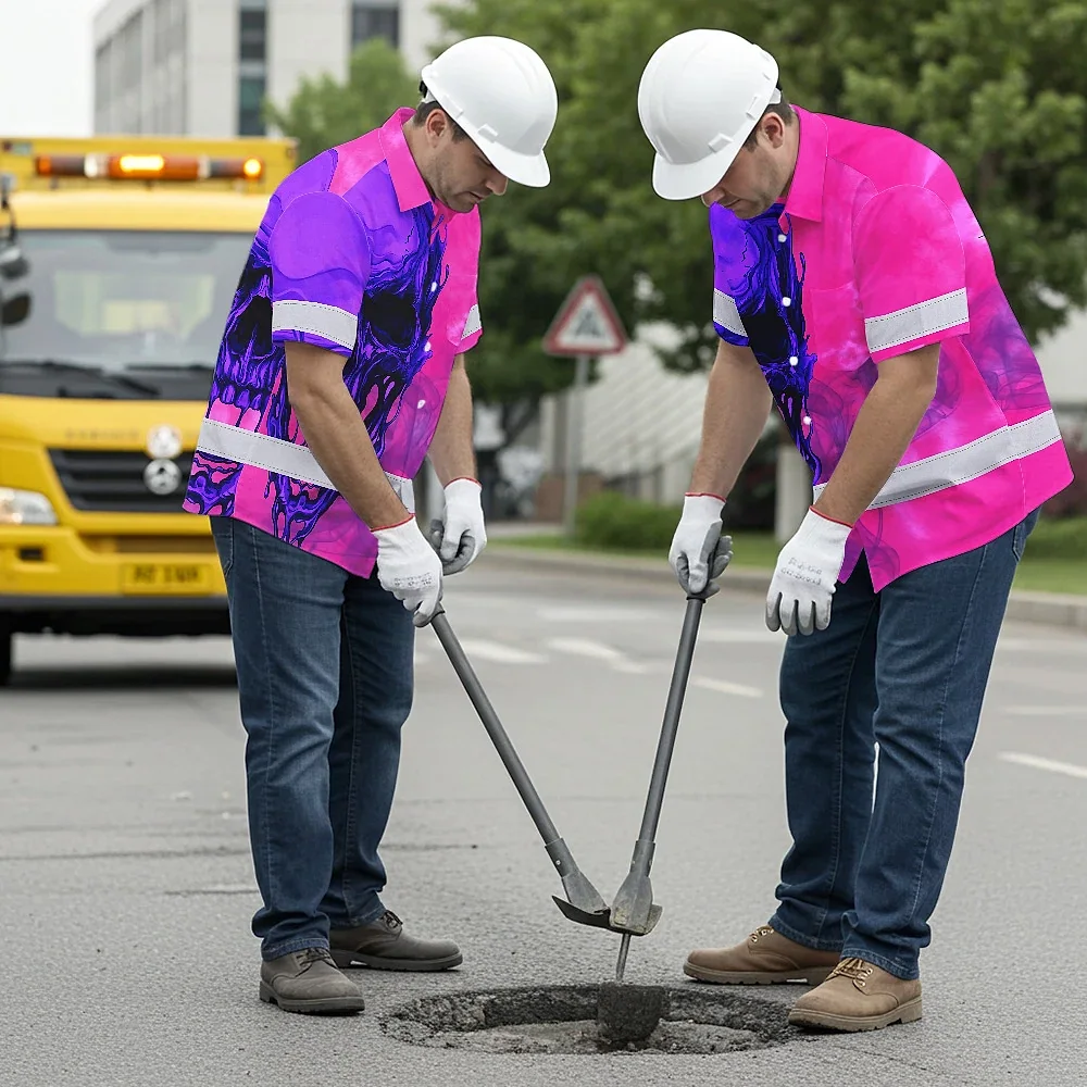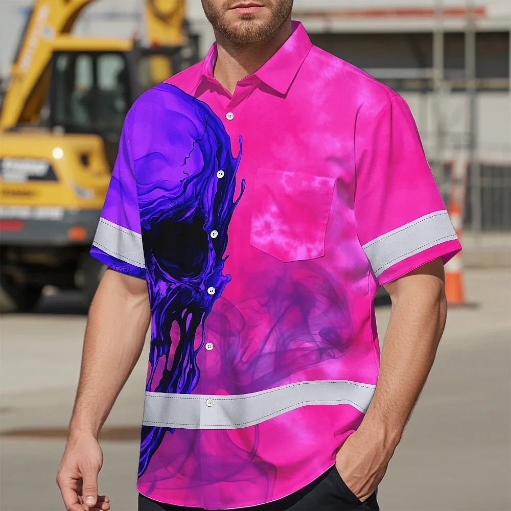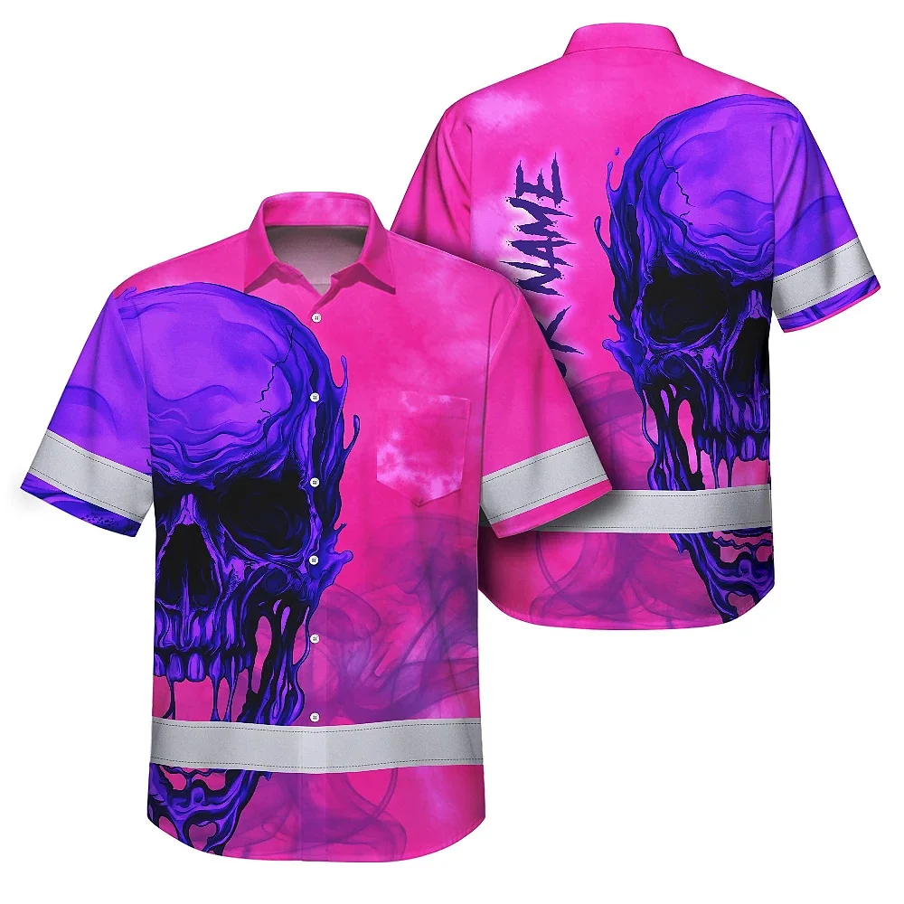 Hi Vis Hawaiian Shirt Reflective Tapes Pink Violet Skull Custom Name Safety Workwear For Workers, Truckers, Operators