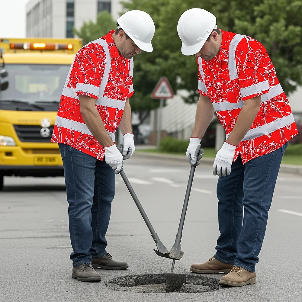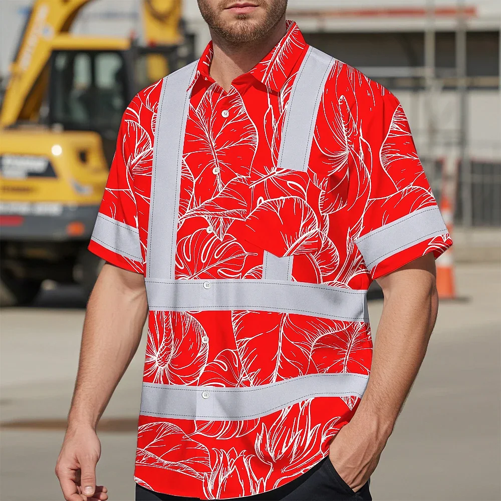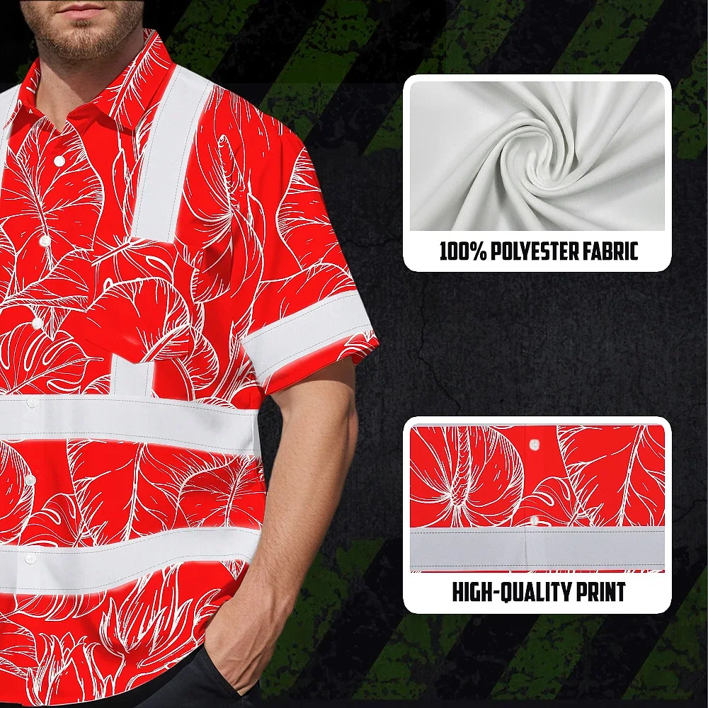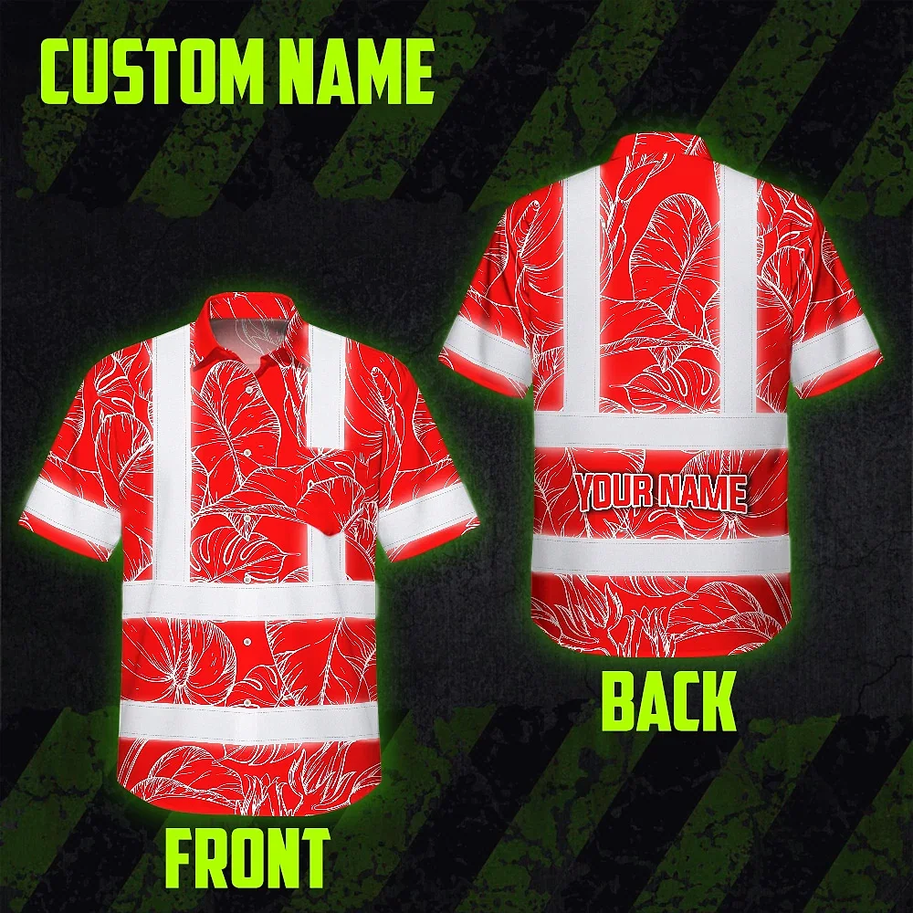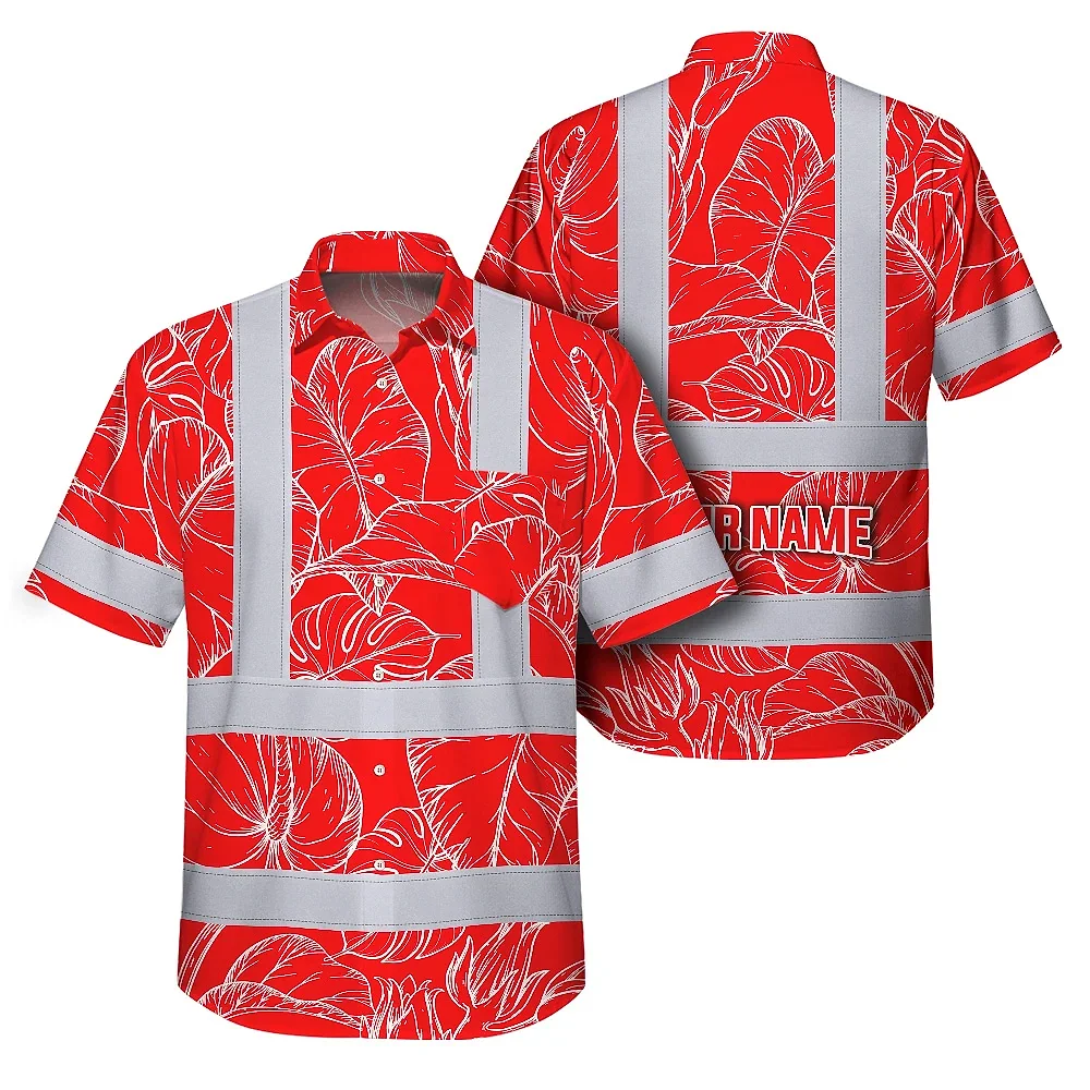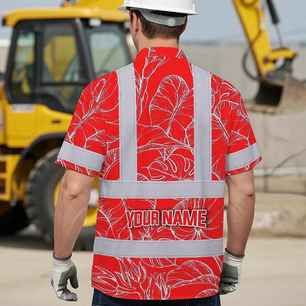 Hi Vis Hawaiian Shirt Reflective Tapes Red Neon Flowers Custom Name Safety Workwear For Workers, Truckers, Operators