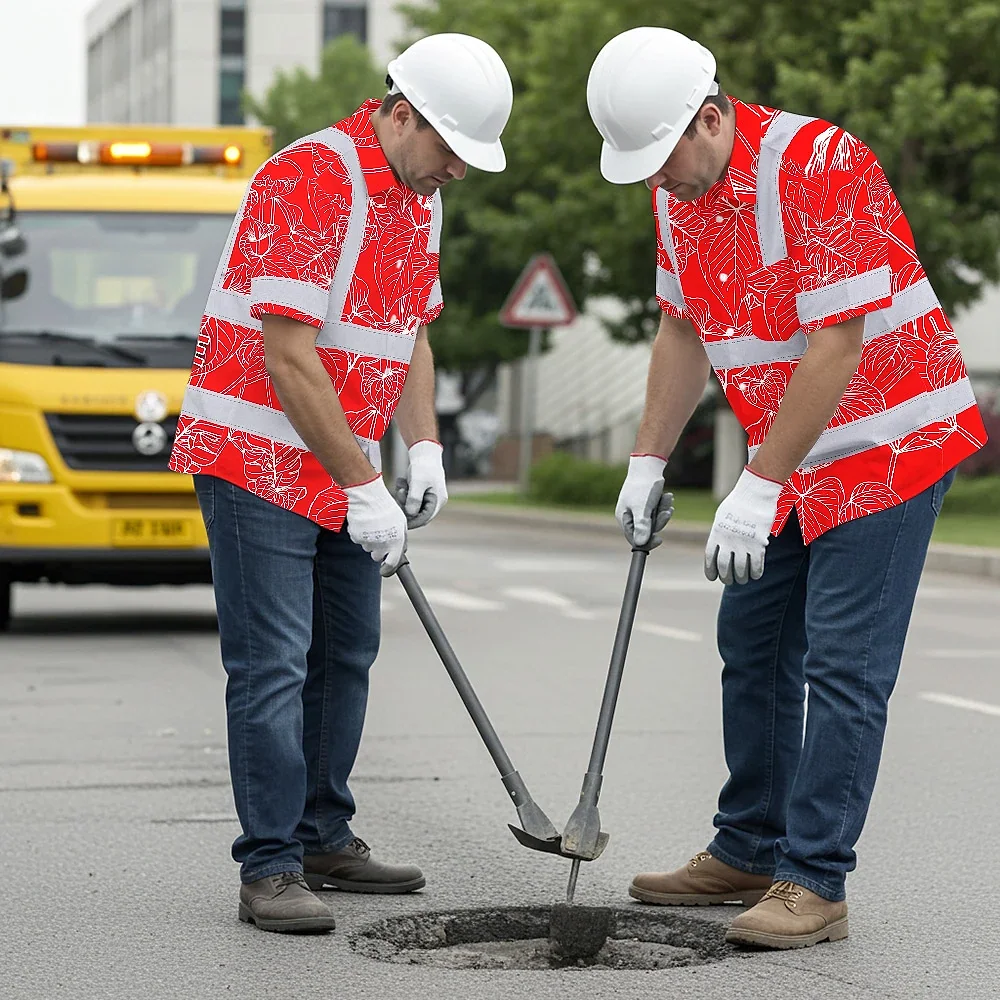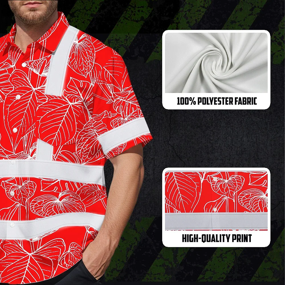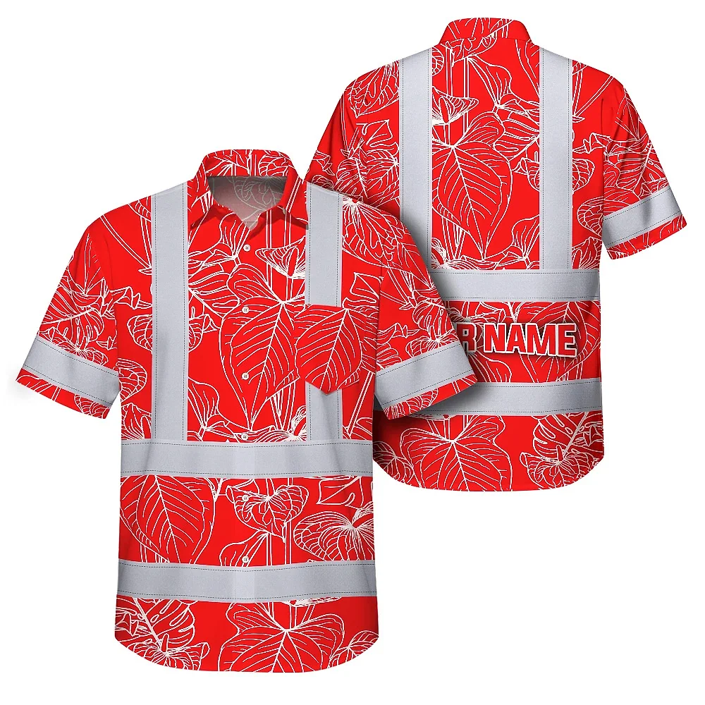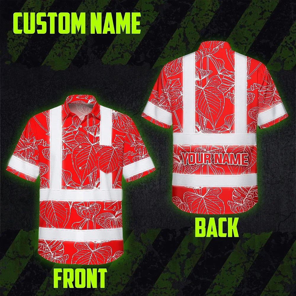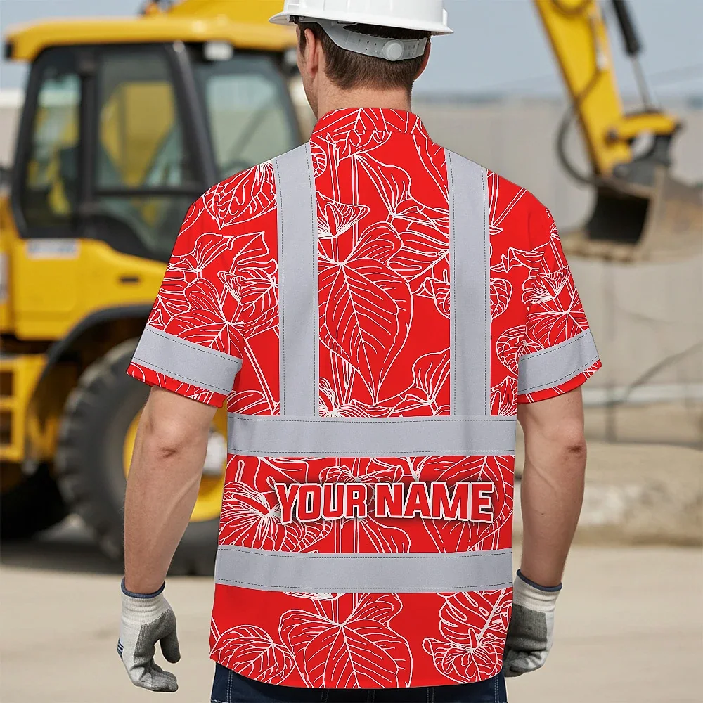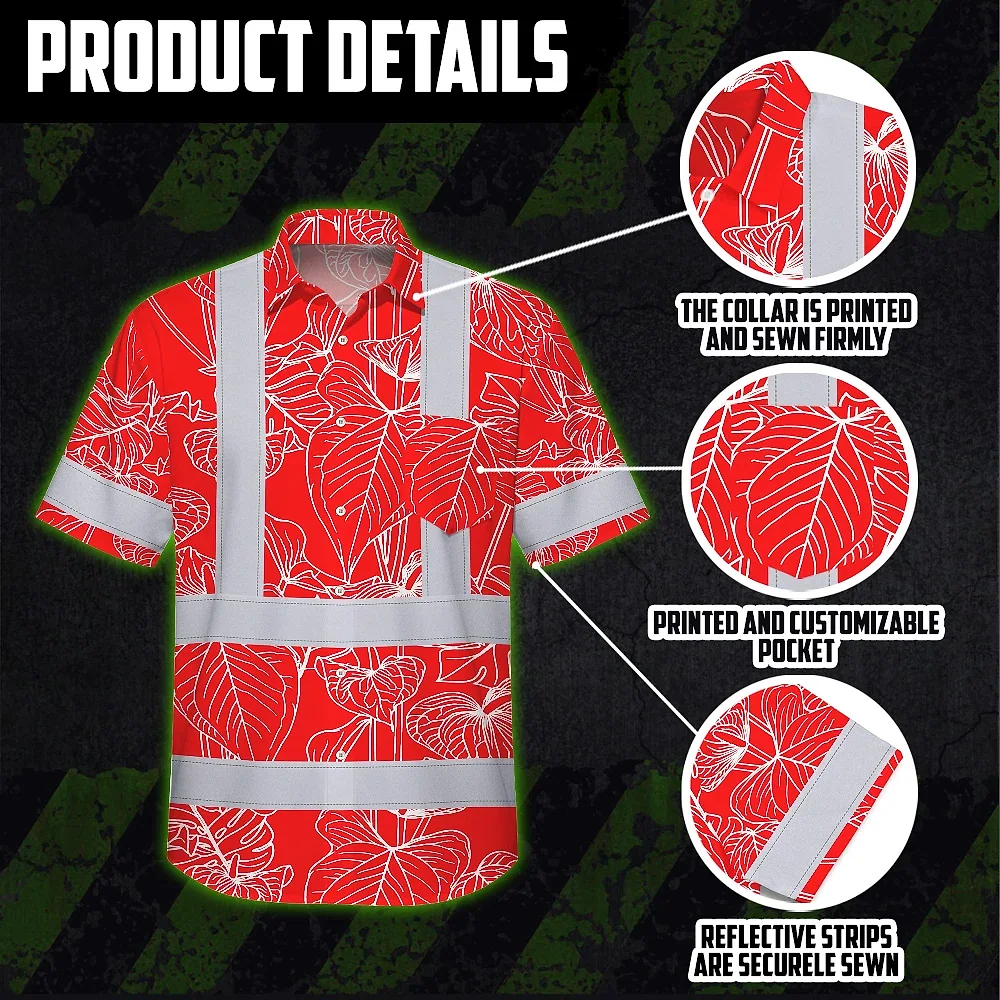 Hi Vis Hawaiian Shirt Reflective Tapes Red Neon Flowers Custom Name Safety Workwear For Workers, Truckers, Operators