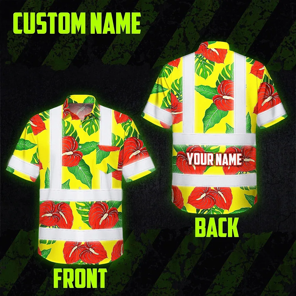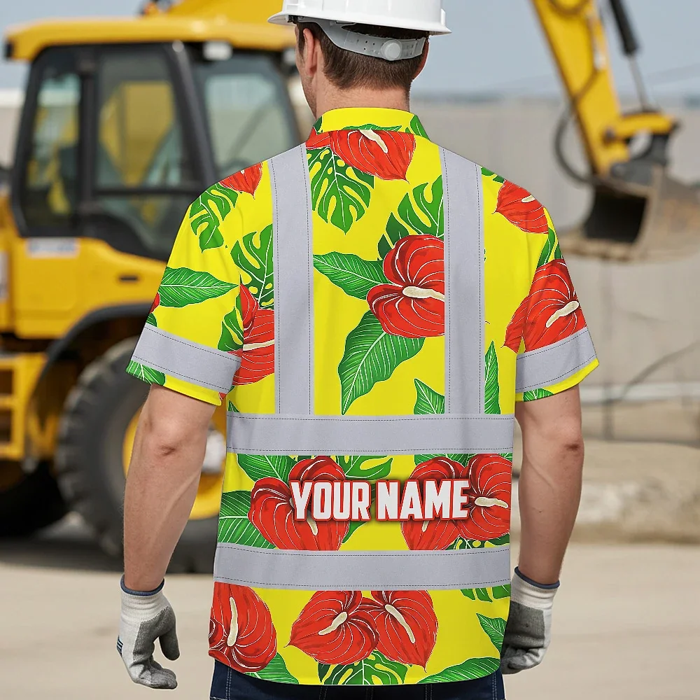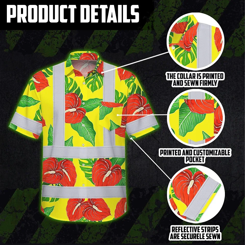 Hi Vis Hawaiian Shirt Reflective Tapes Red Neon Green Flowers Custom Name Safety Workwear For Workers, Truckers, Operators