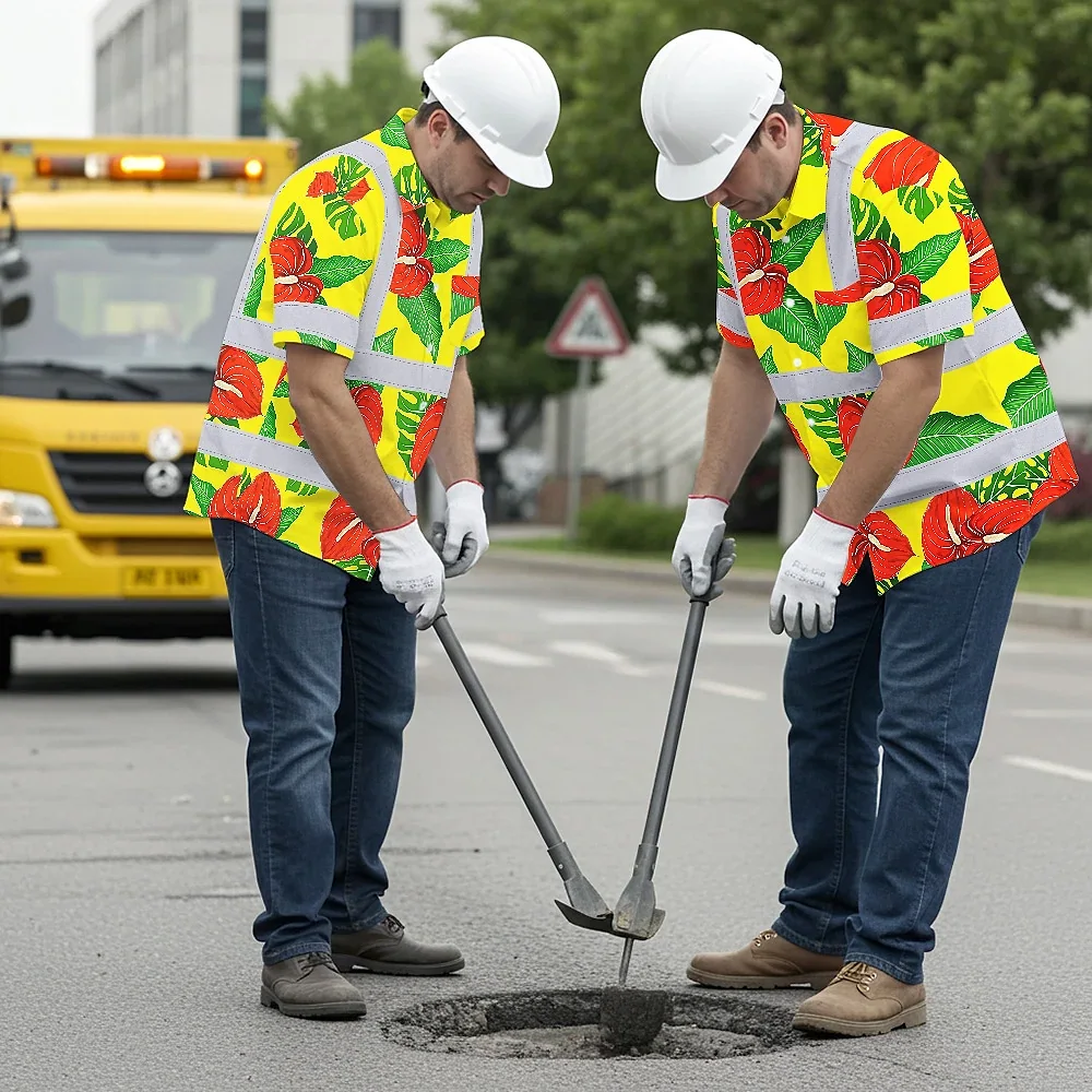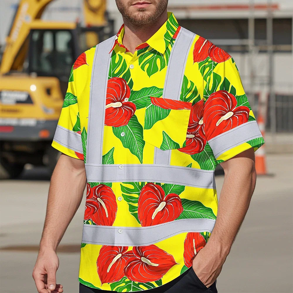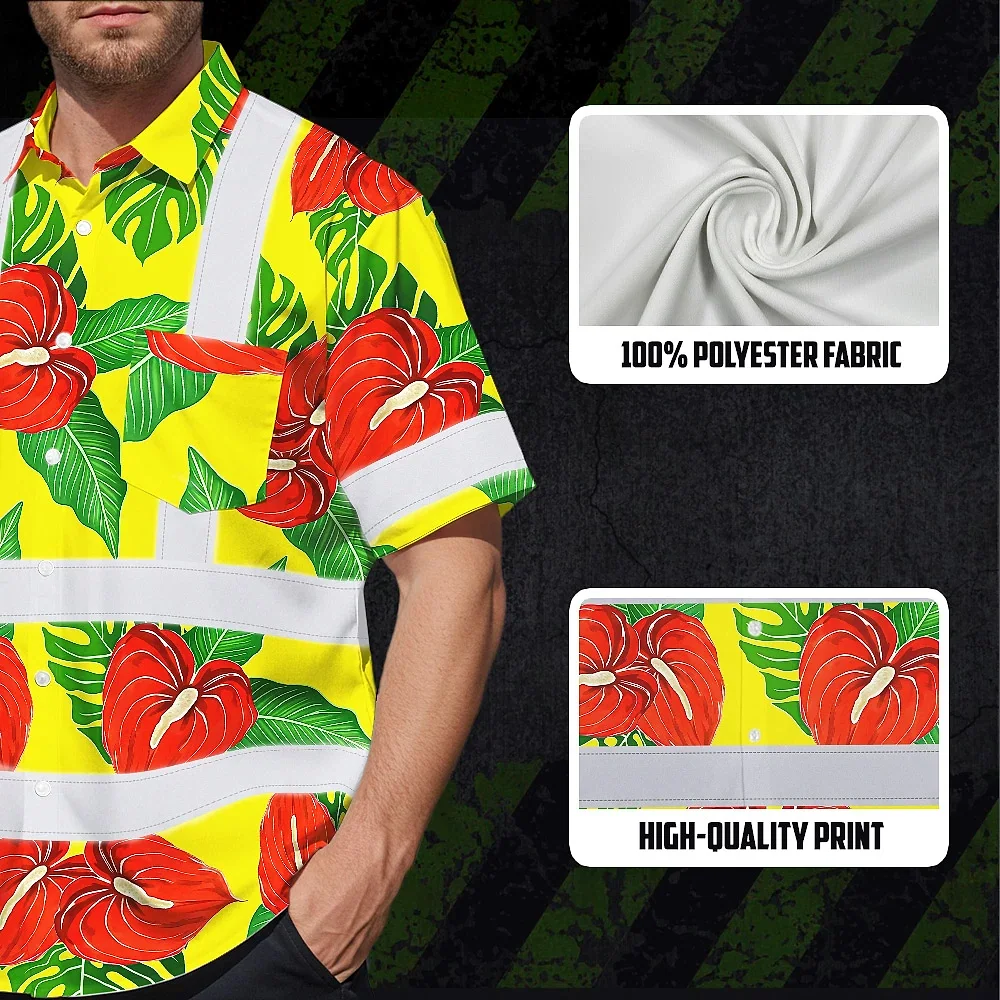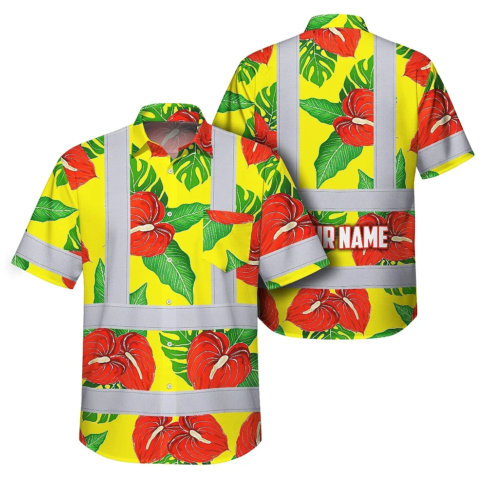 Hi Vis Hawaiian Shirt Reflective Tapes Red Neon Green Flowers Custom Name Safety Workwear For Workers, Truckers, Operators