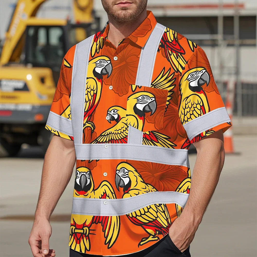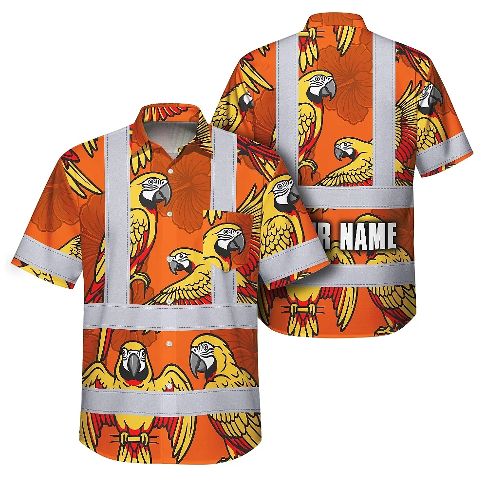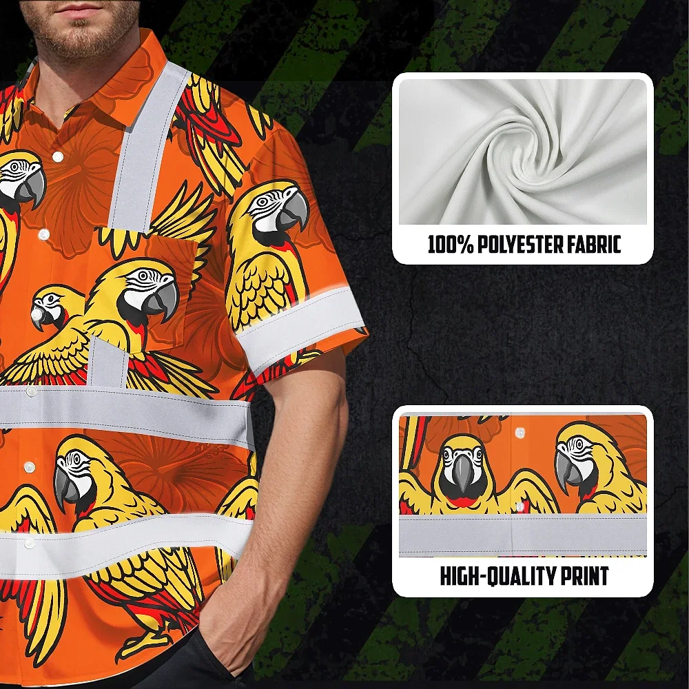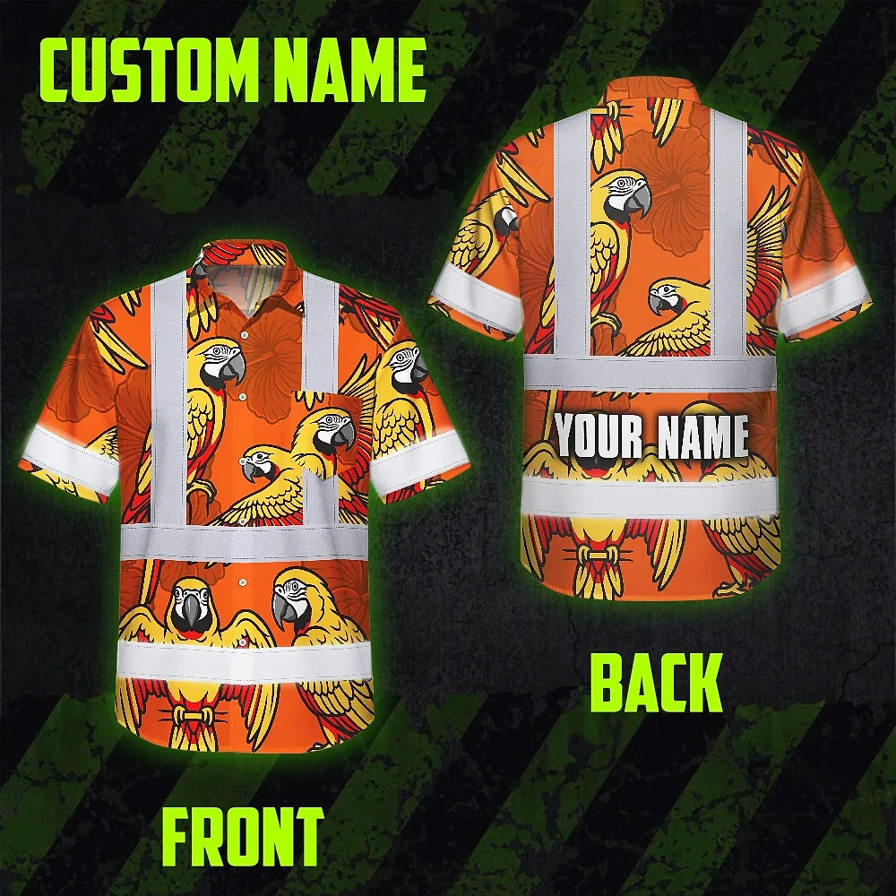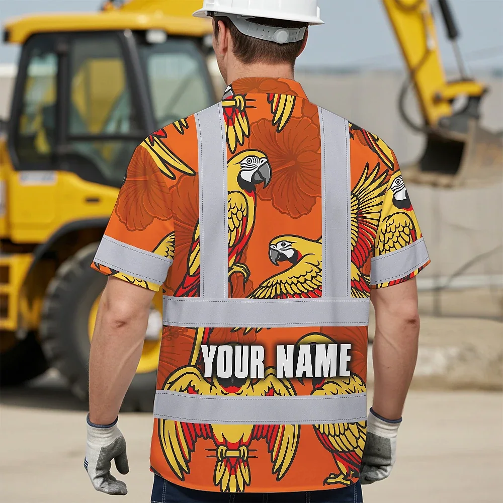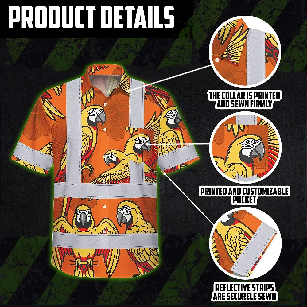 Hi Vis Hawaiian Shirt Reflective Tapes Red Neon Lime Parrot Custom Name Safety Workwear For Workers, Truckers, Operators