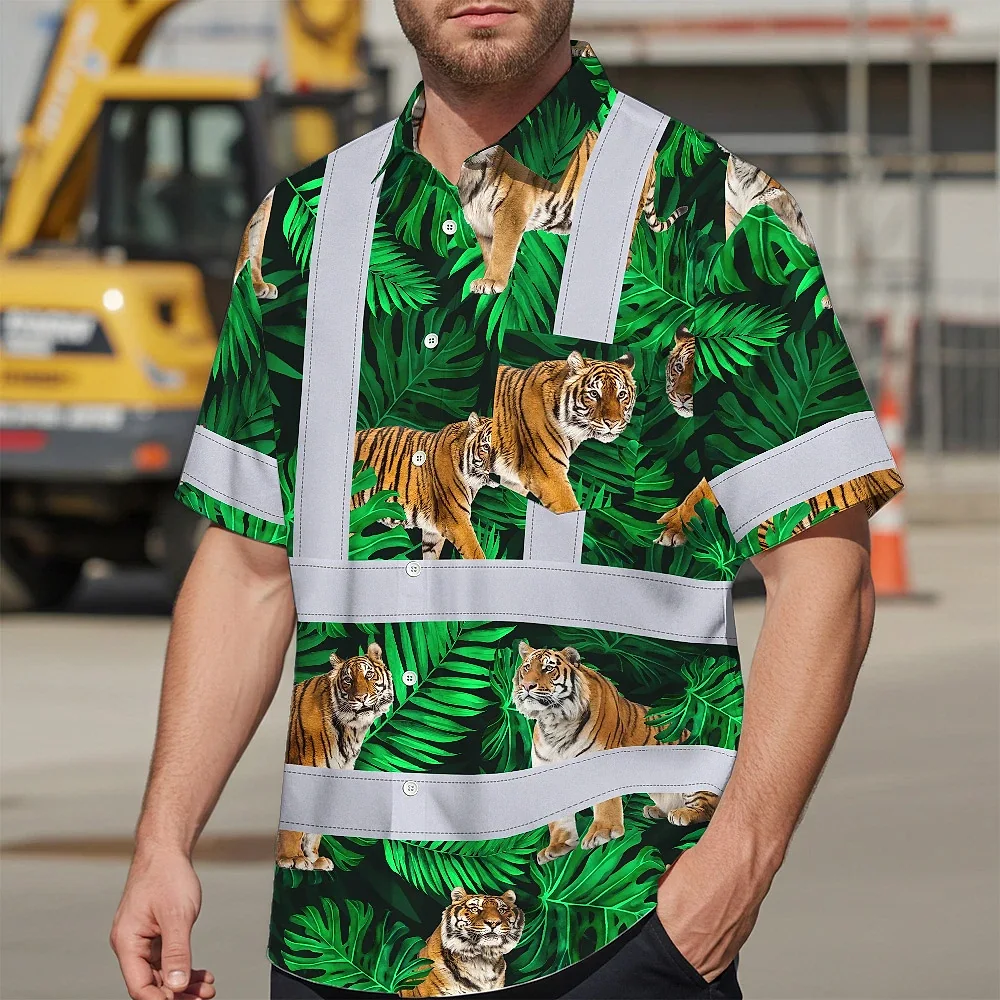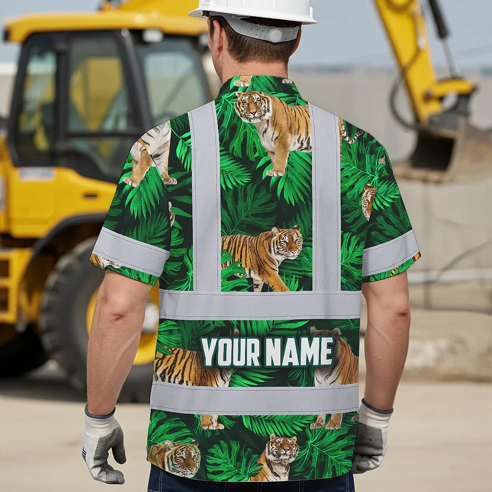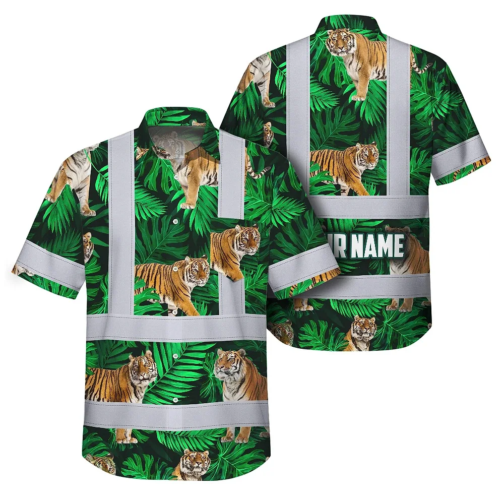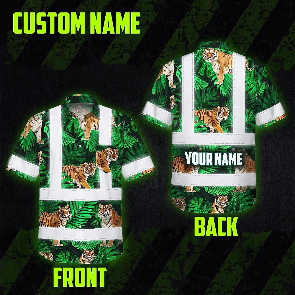 Hi Vis Hawaiian Shirt Reflective Tapes Tiger Flowers Custom Name Safety Workwear For Workers, Truckers, Operators