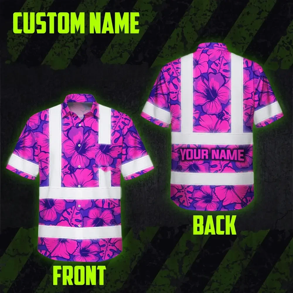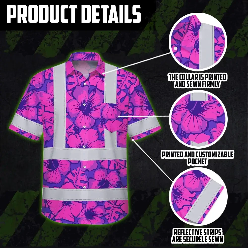 Hi Vis Hawaiian Shirt Reflective Tapes Violet Neon And Pink Flowers Custom Name Safety Workwear For Workers, Truckers, Operators