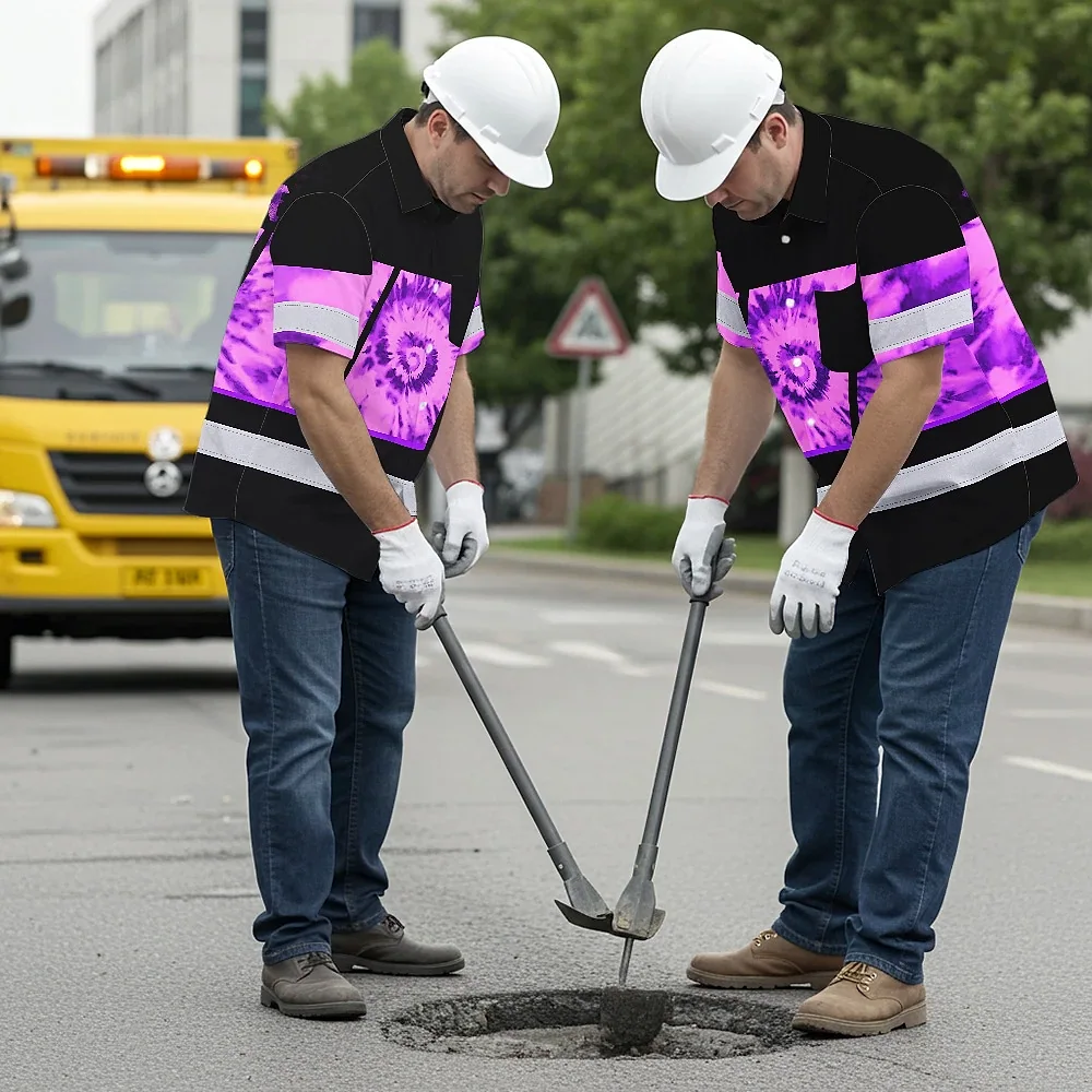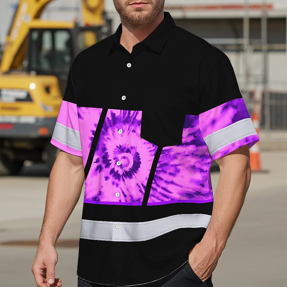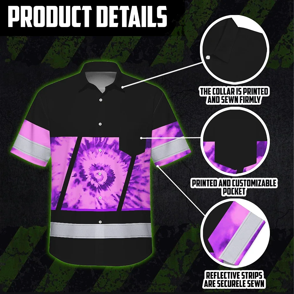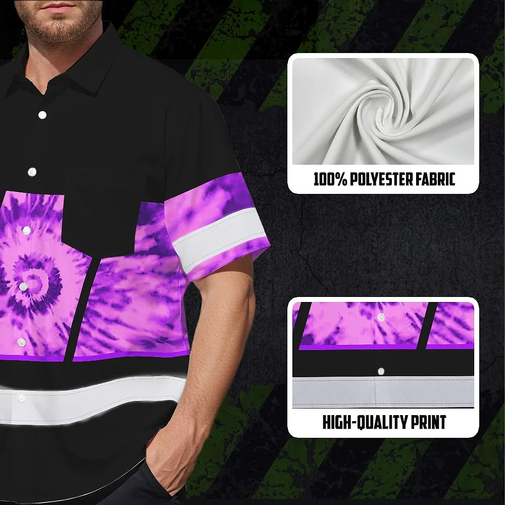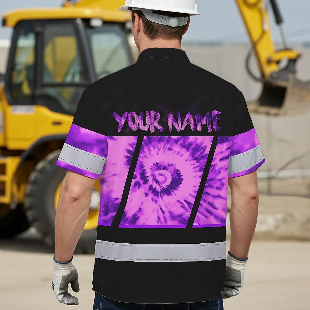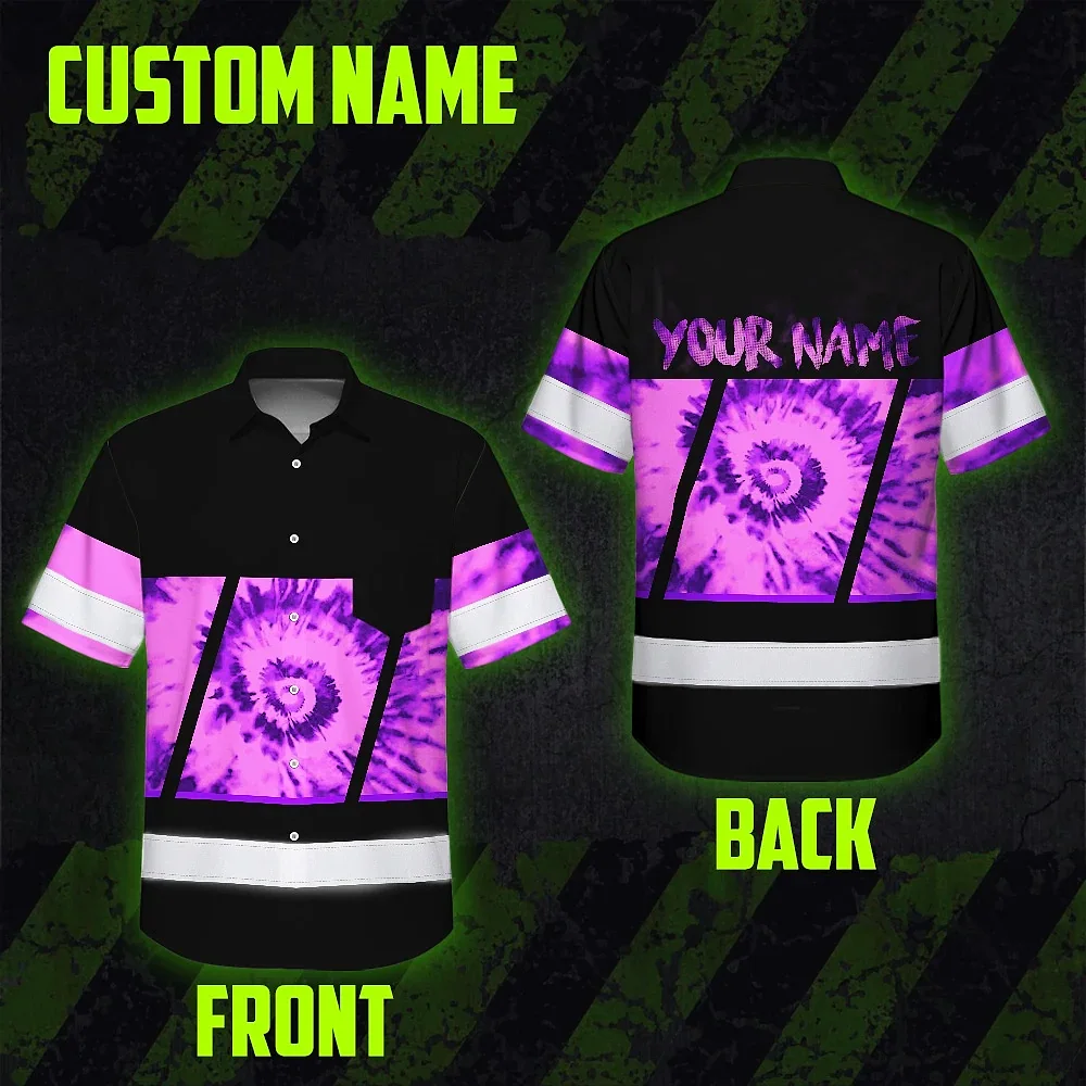 Hi Vis Hawaiian Shirt Reflective Tapes Violet Tie Dye Custom Name Safety Workwear For Workers, Runners, Cyclists